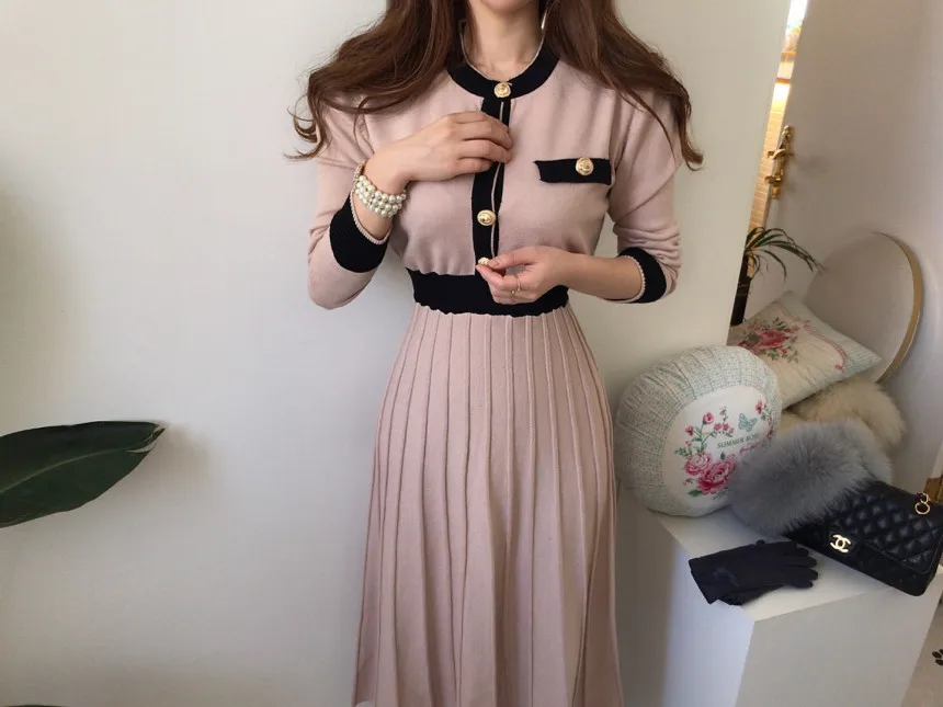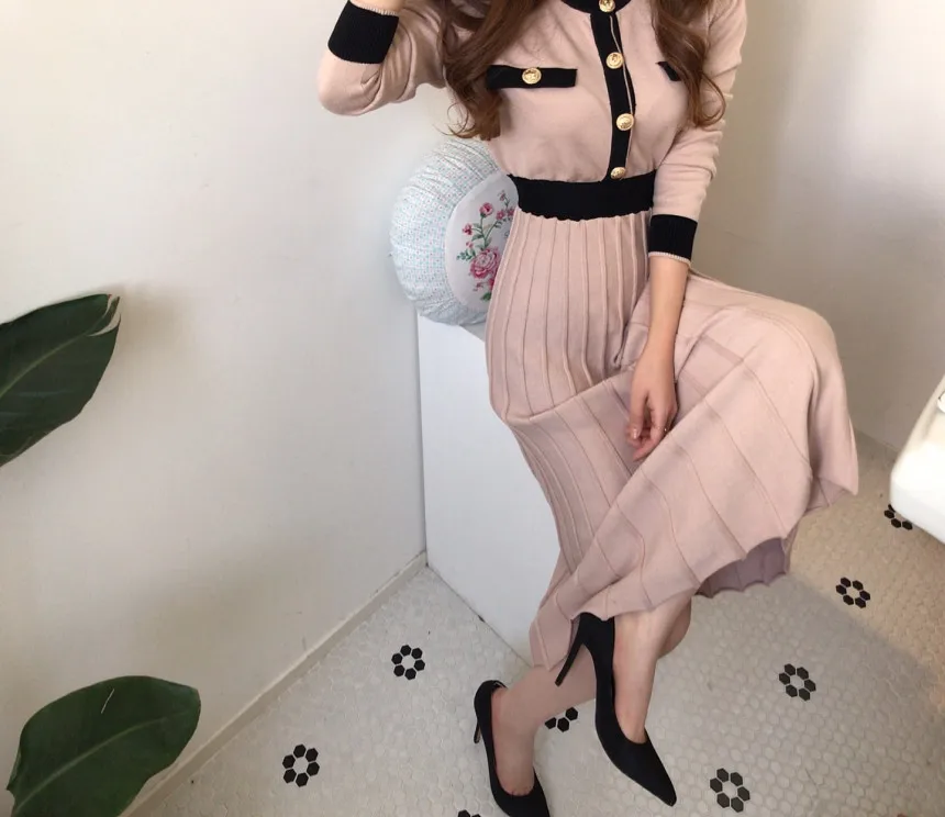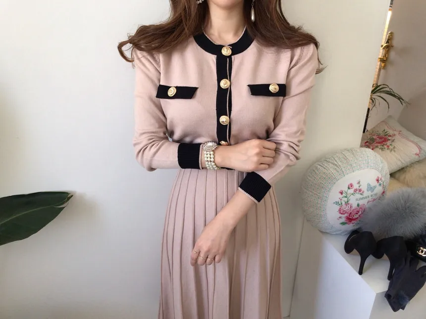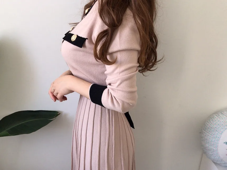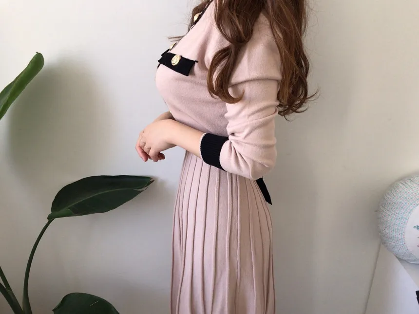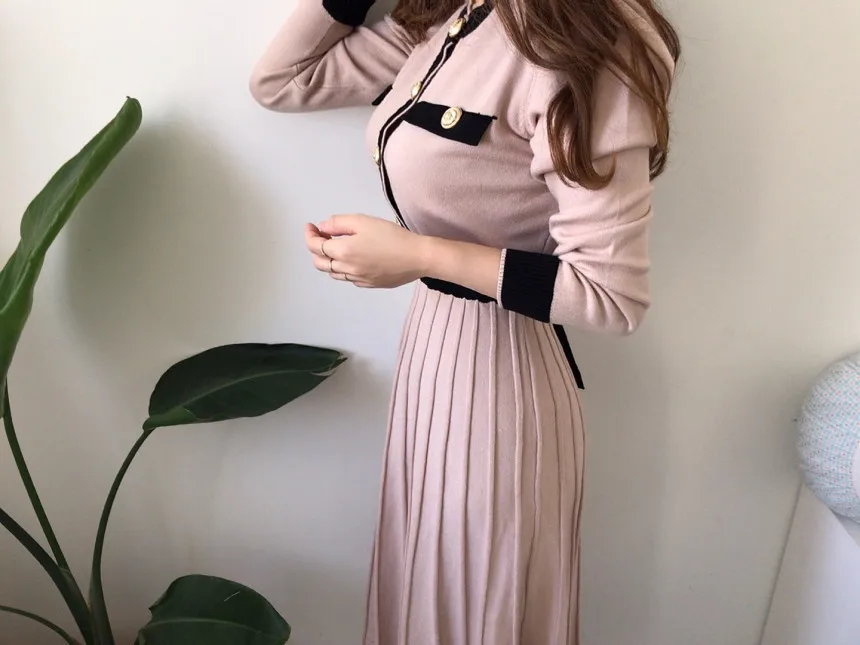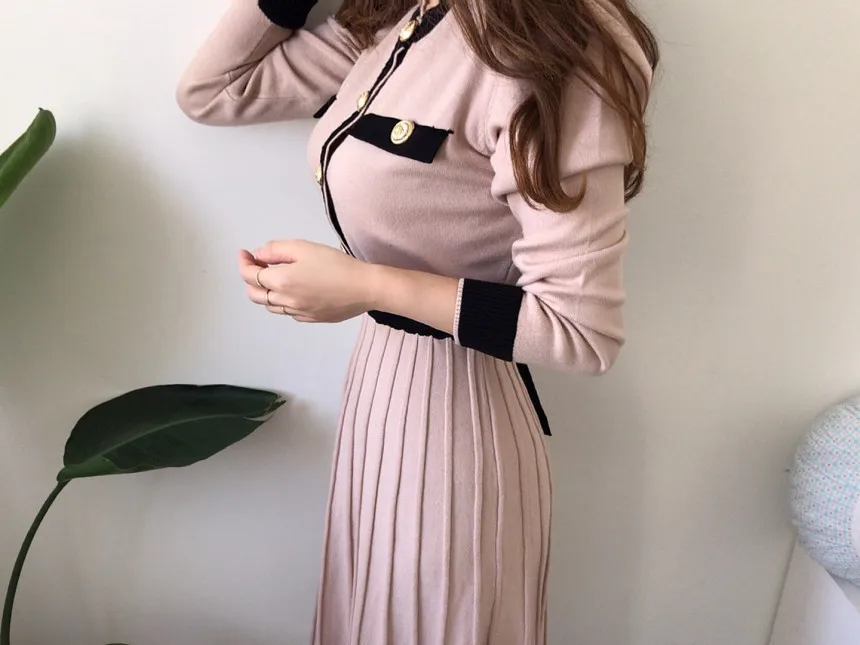 Yipinpay O Neck Chic Button High Waist Pink Sweater Dress Bodycon Pleated Women Knit Dress Vestidos 2023 Elegant Clothes Dresses