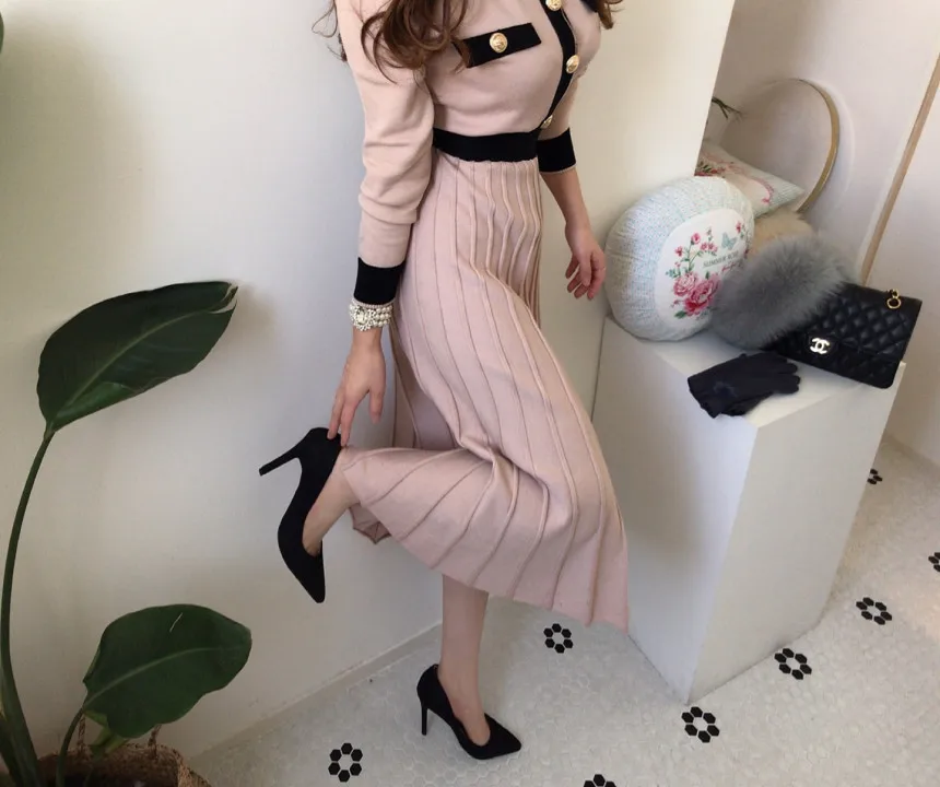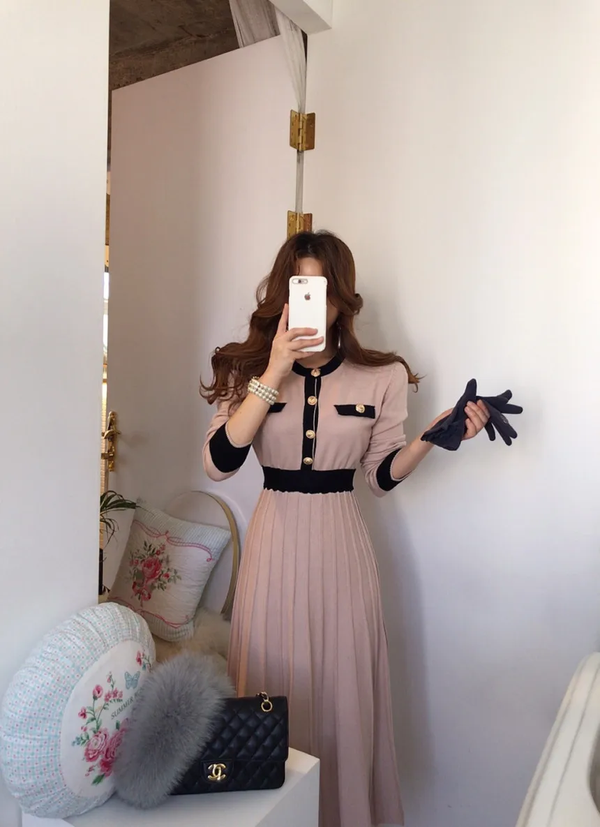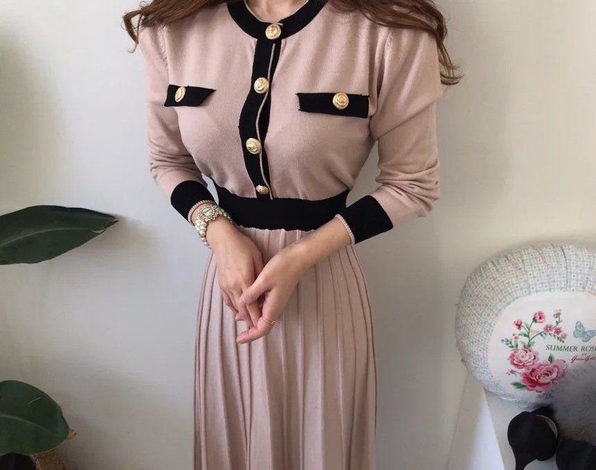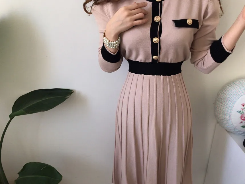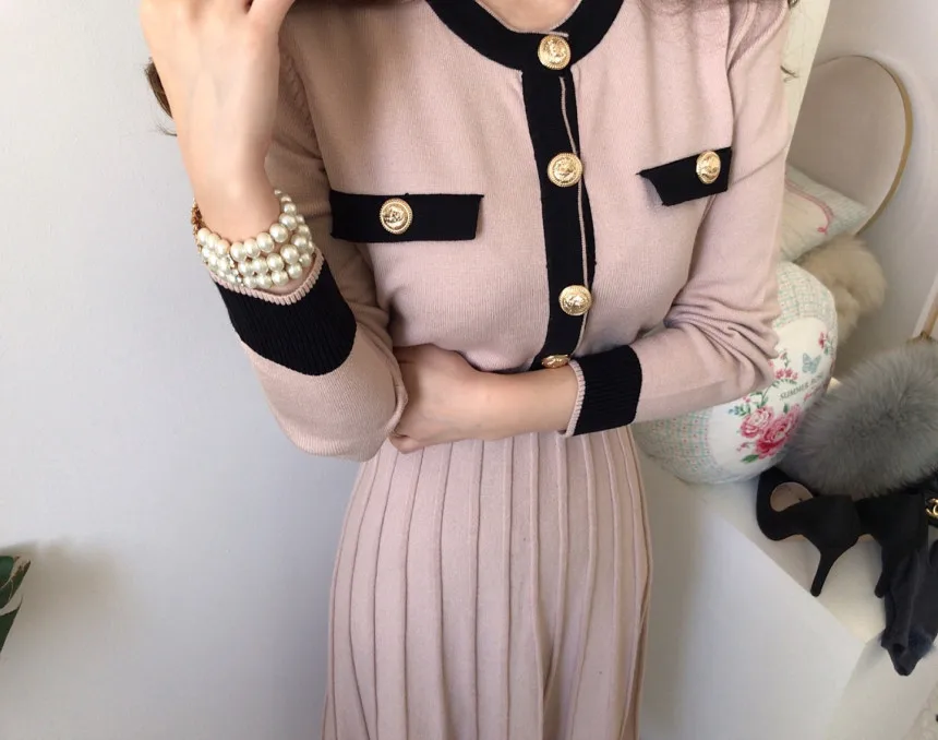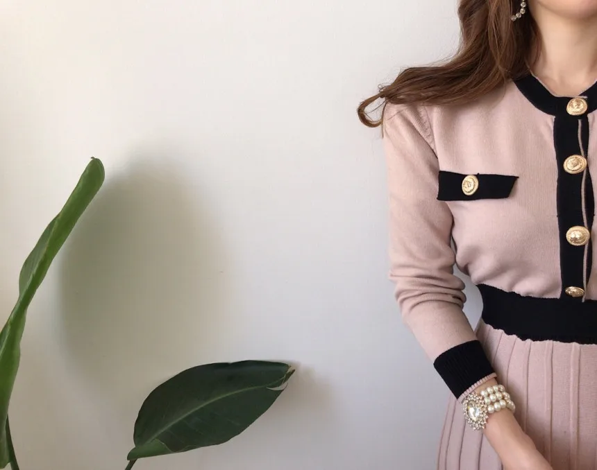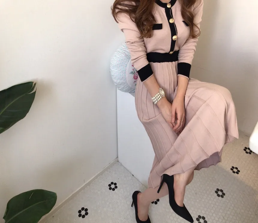 Yipinpay O Neck Chic Button High Waist Pink Sweater Dress Bodycon Pleated Women Knit Dress Vestidos 2023 Elegant Clothes Dresses