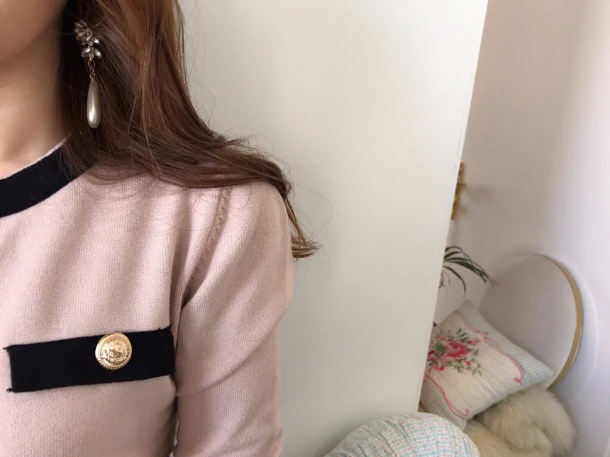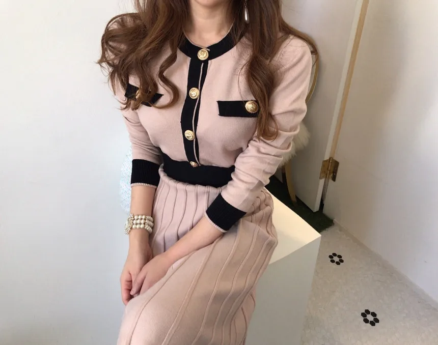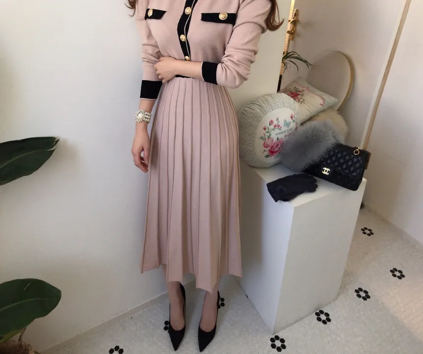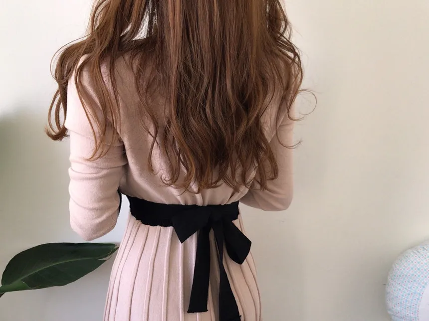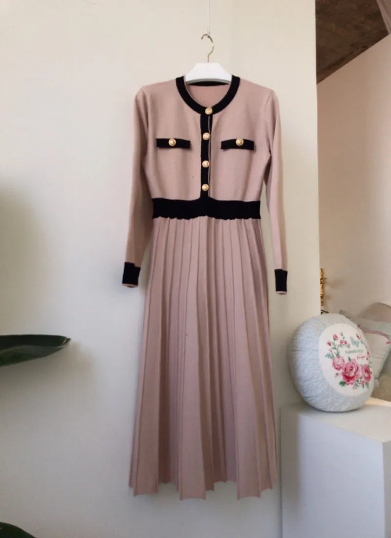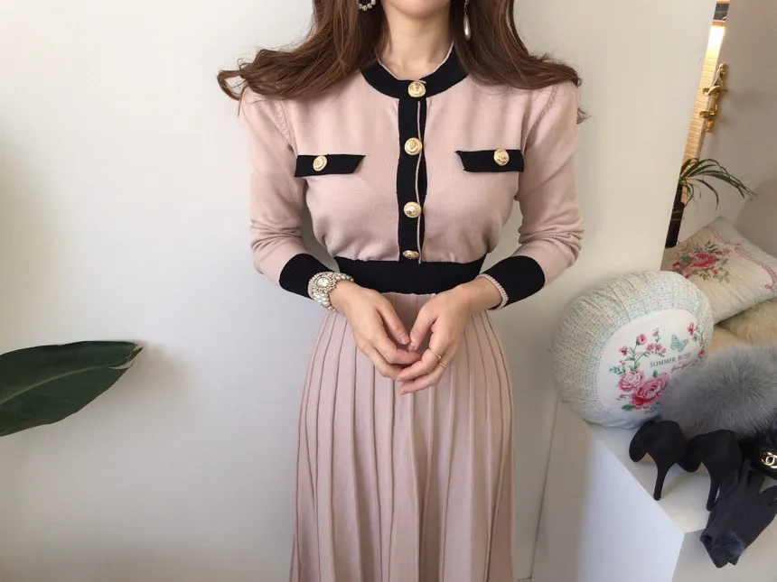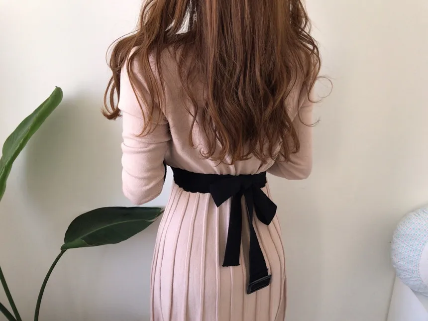Yipinpay O Neck Chic Button High Waist Pink Sweater Dress Bodycon Pleated Women Knit Dress Vestidos 2023 Elegant Clothes Dresses