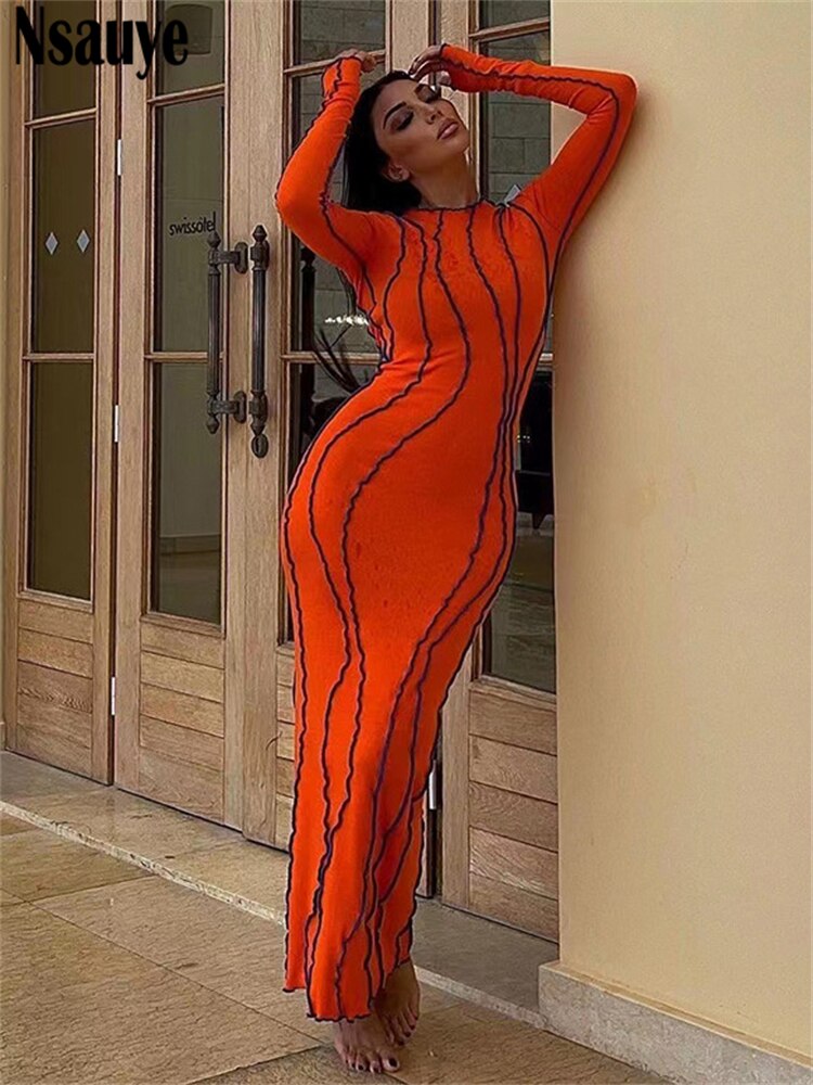 yipinpay O Neck Sexy Women Long Ribber Knitted Bodycon Striped Dress Y2K Fashion Orange Maxi Wrap Party Club Dress 2023 Autumn