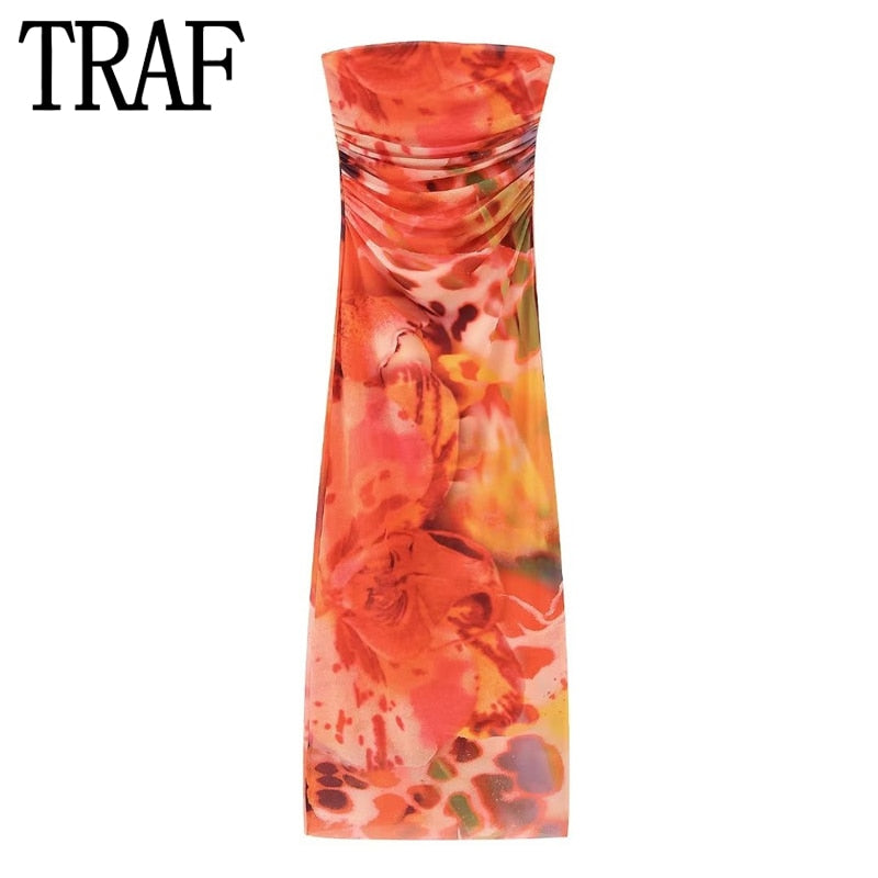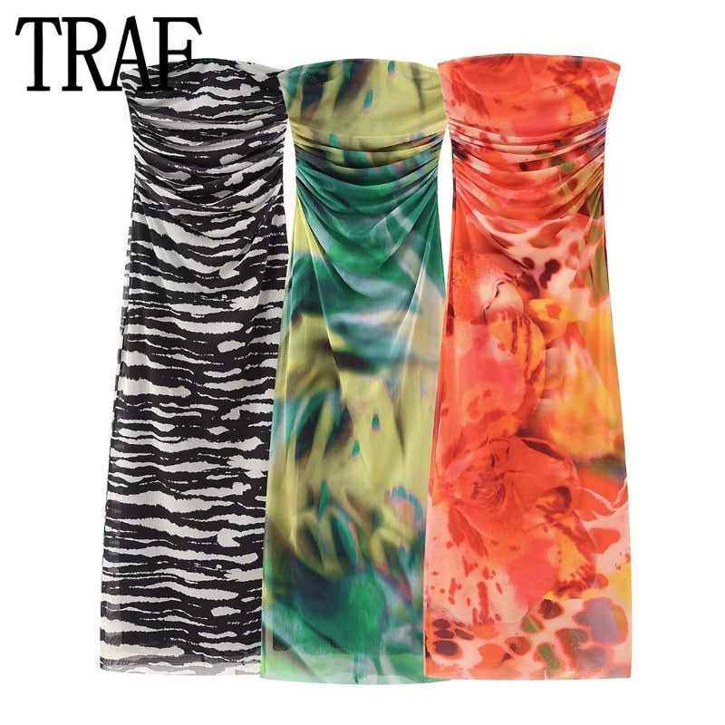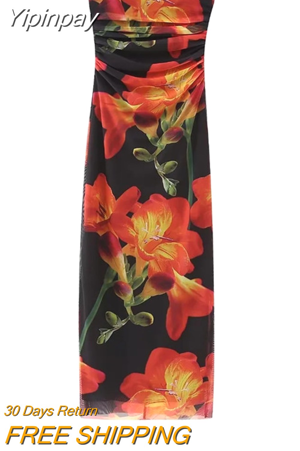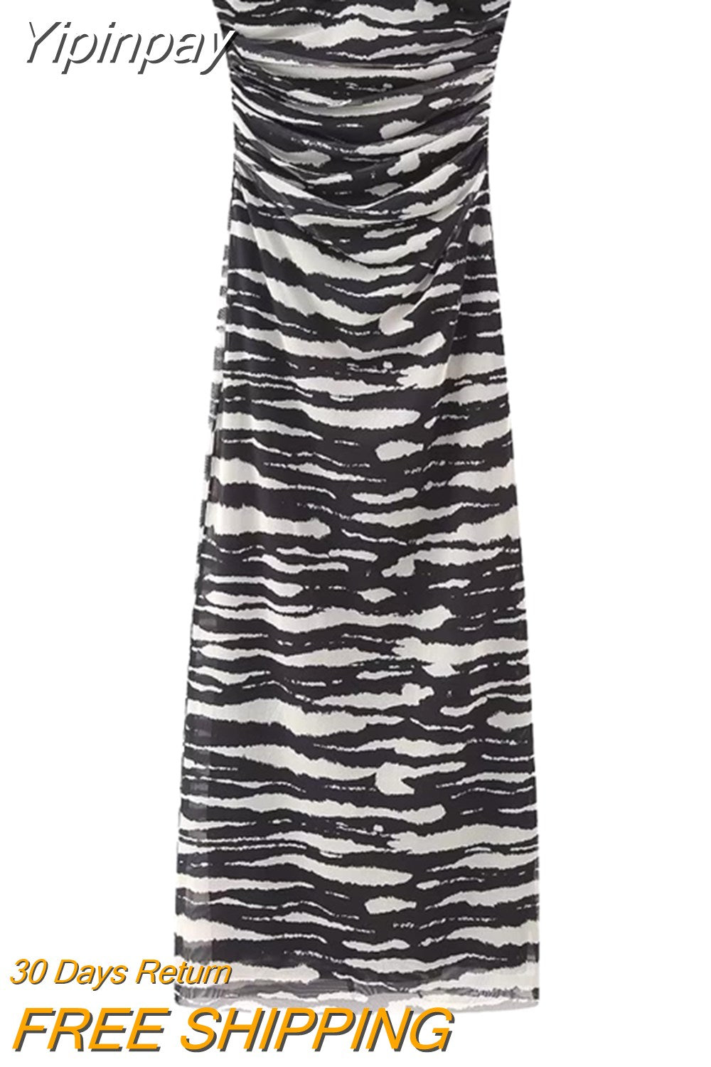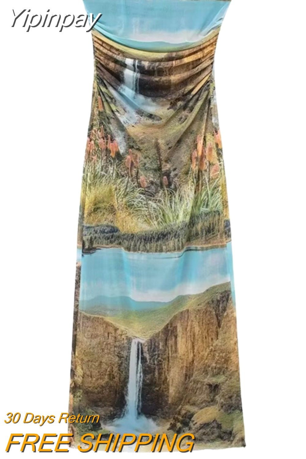 Yipinpay Off Shoulder Corset Dress Woman Print Tulle Long Dresses For Women 2023 Ruched Midi Summer Dresses Sexy Mesh Bodycon Dress