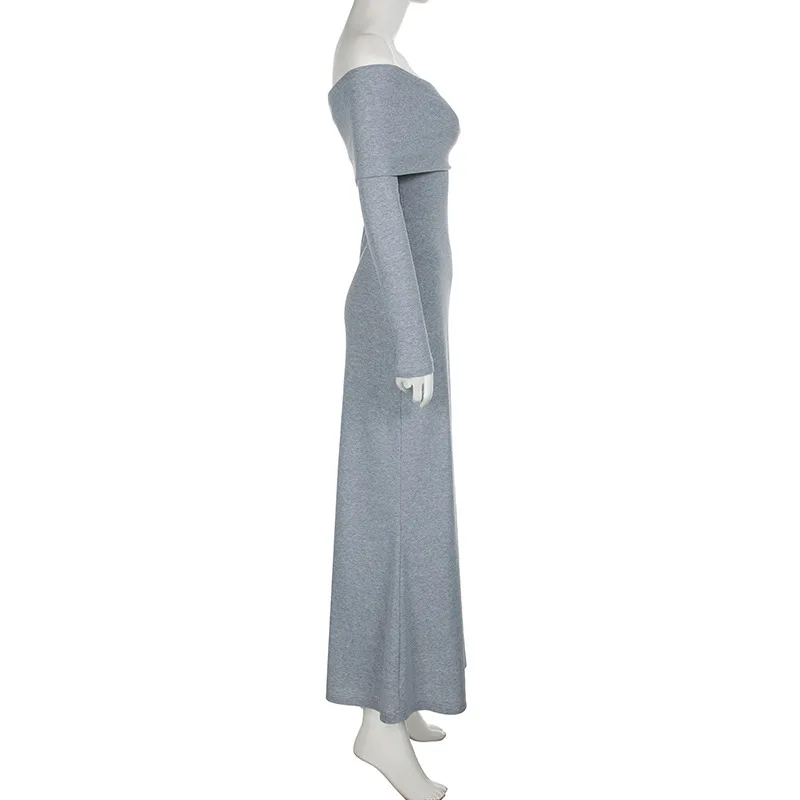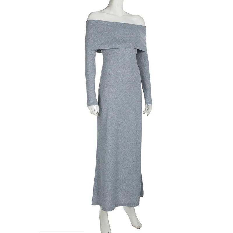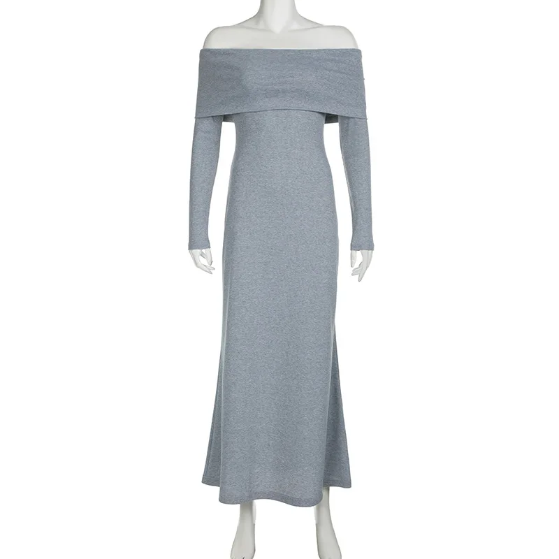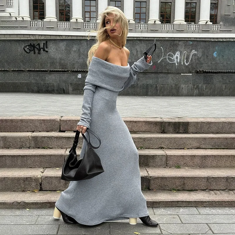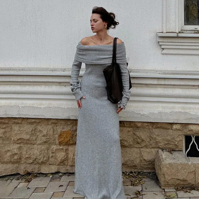 Yipinpay Off-Shoulder Knit Long Dress Women High Waist Slim Elegant Fashion Pleated Maxi Dress Long Sleeve Backless Knitwear Dress