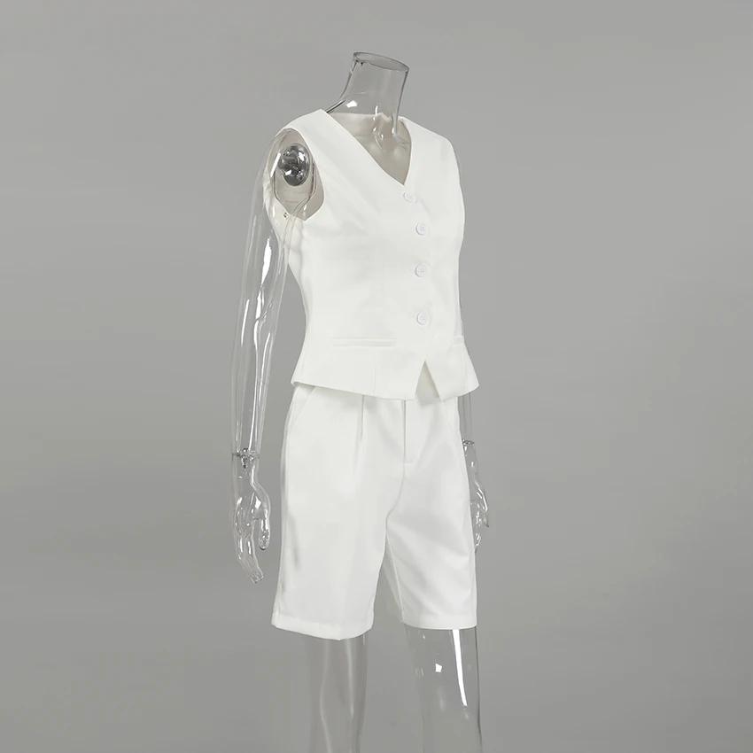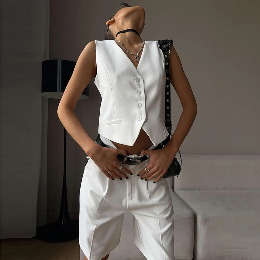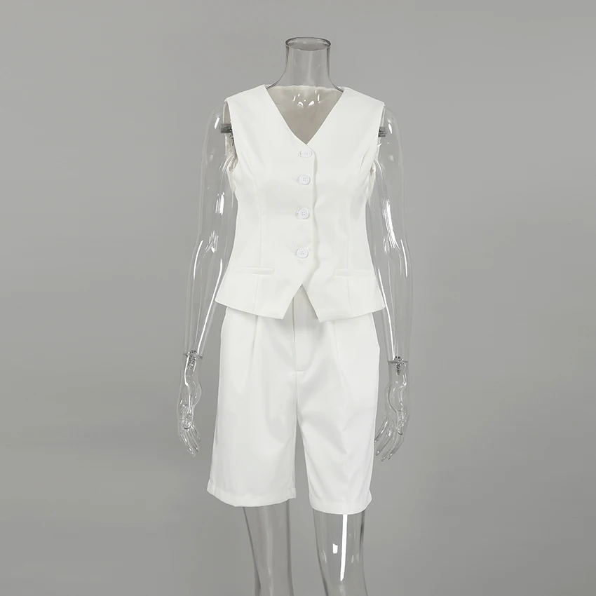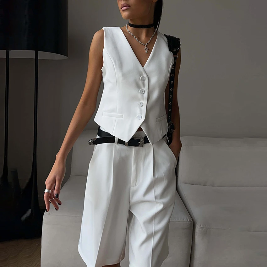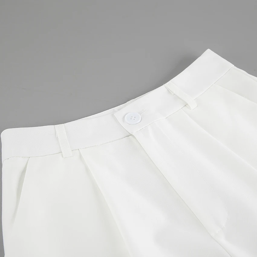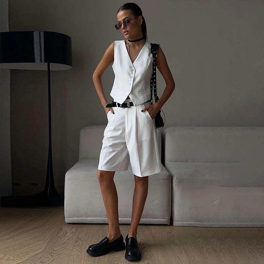 Yipinpay Office Ladies White Shorts Suits 2 Pieces Vest Tops And Wide Legs Shorts Sets Women 2023 Pleated Outfits Two Pieces