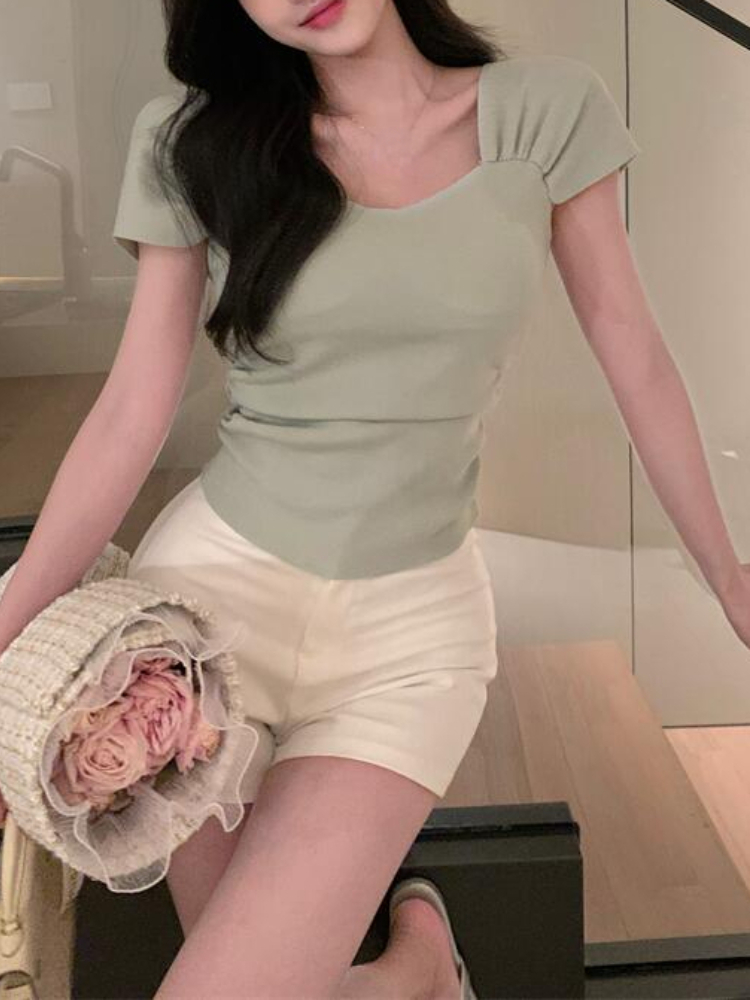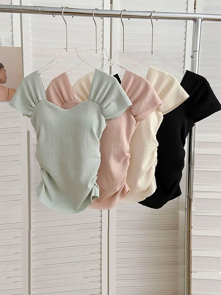 Yipinpay Office Lady Blouse Women Slim Evening Party Y2k Crop Top Solid Casual Short Sleeve Shirt Korean Fashion 2024 Summer