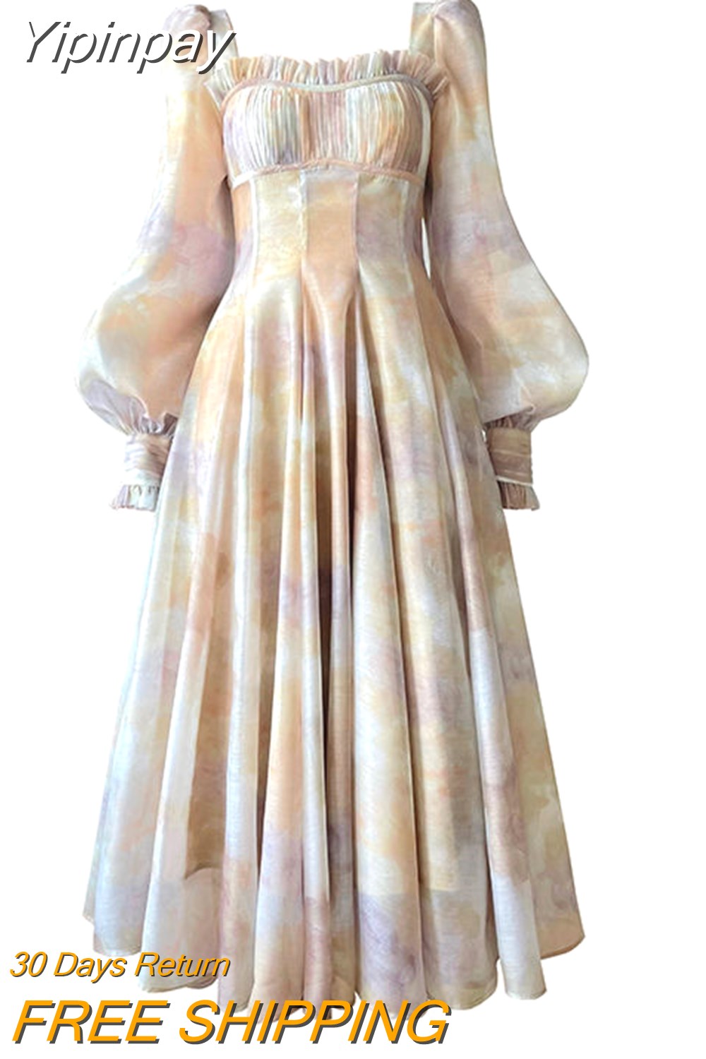 Yipinpay One Piece Dress Korean Fashion Beach 2023 Summer Casual French Elegant Midi Dress Woman Long Sleeve Vintage Floral Dress 0407
