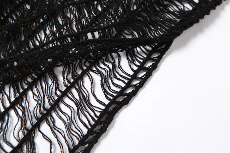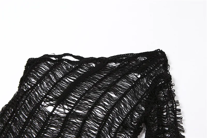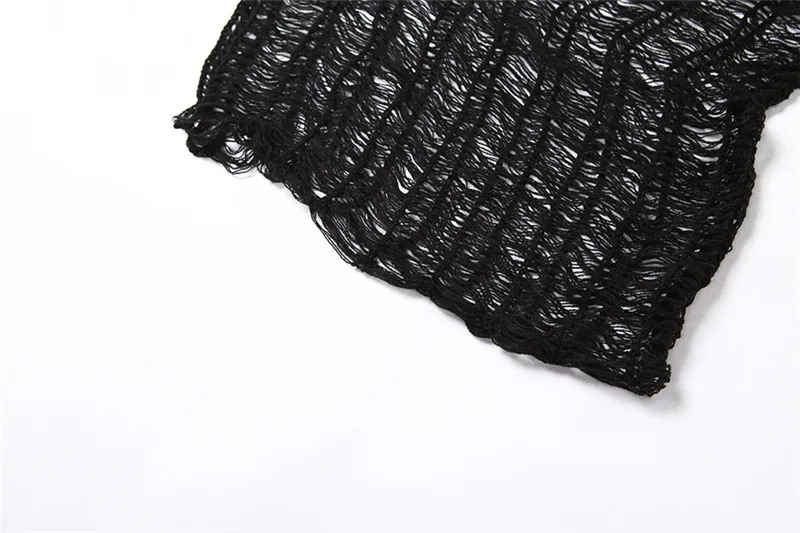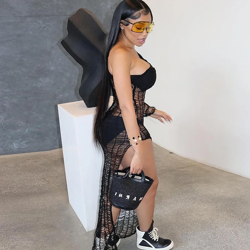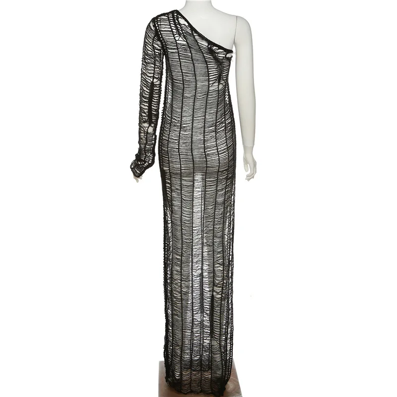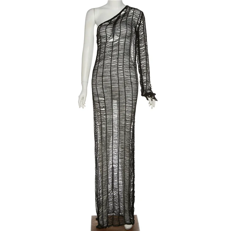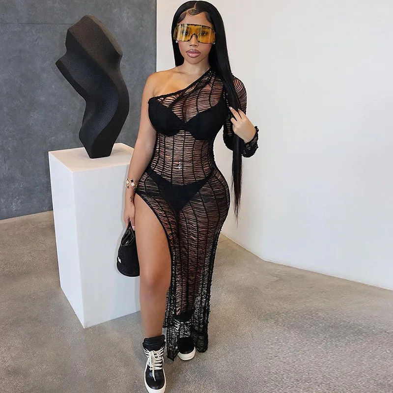 Yipinpay One-Shoulder Hollow Out Crochet Cover-Ups Female Mixi Skirts Sheer Holiday Beach Sexy See-Through High Split Slim Dress
