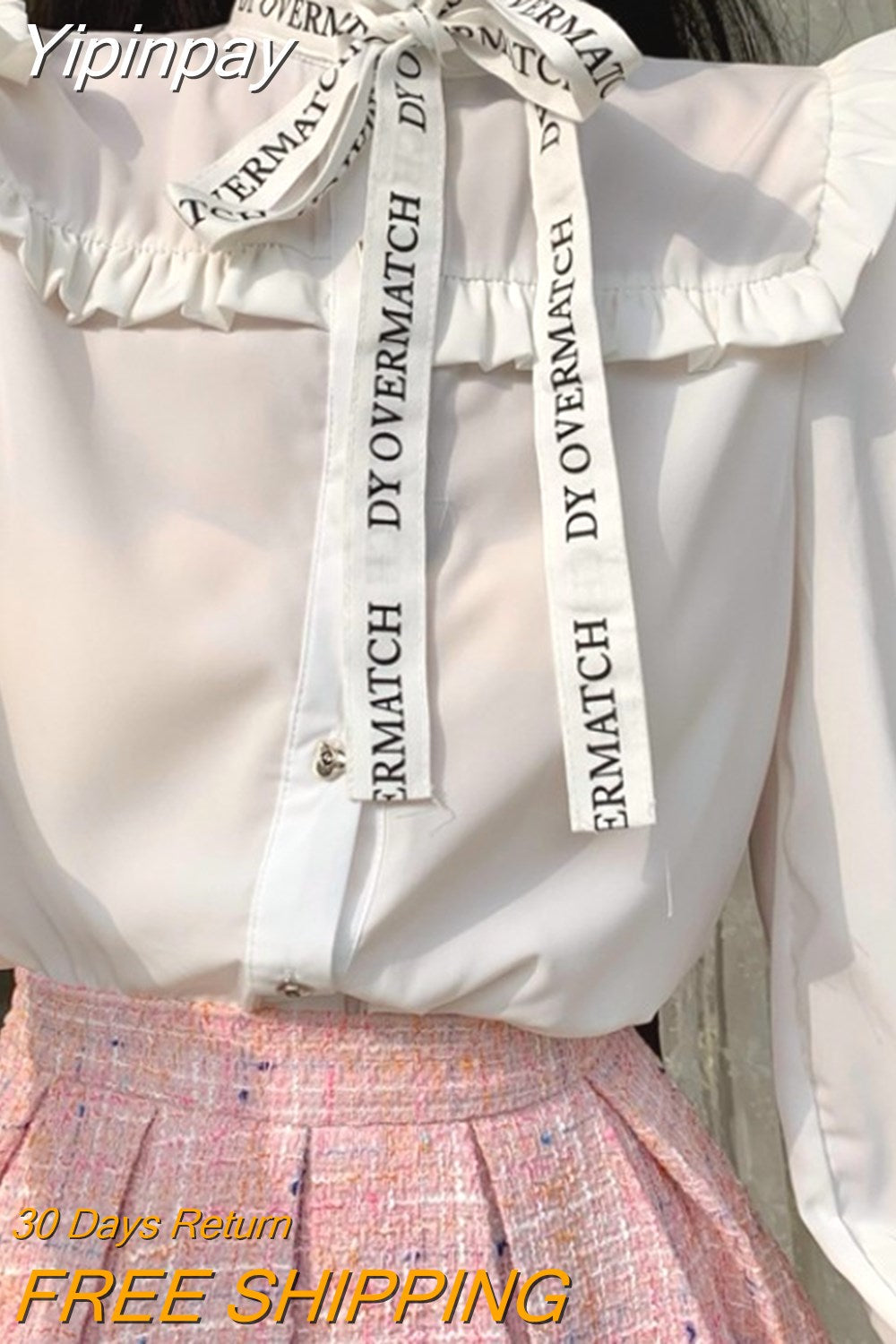 Yipinpay Palace Style White Shirt Women Blusas Mujer 2023 Tops Bow Tie Fungus Shirts Elegant Black Ribbon Letter Half High Neck