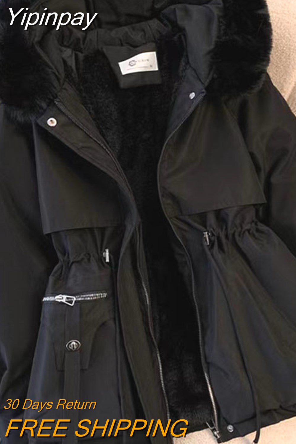 Yipinpay Parkas Women Outwear Hooded Hairy Collar Thick Warm Cotton Clothes Korean Fall Winter Jacket Drawstring Zipper Lady Coat