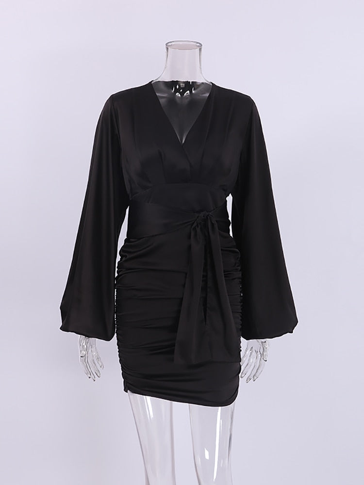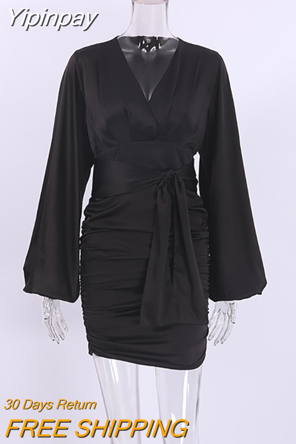Yipinpay Party Ruched Sexy Dress Women Lantern Sleeve V-Neck Satin Short Dress With Sashes Clubwear Spring 2023 Solid Dresses