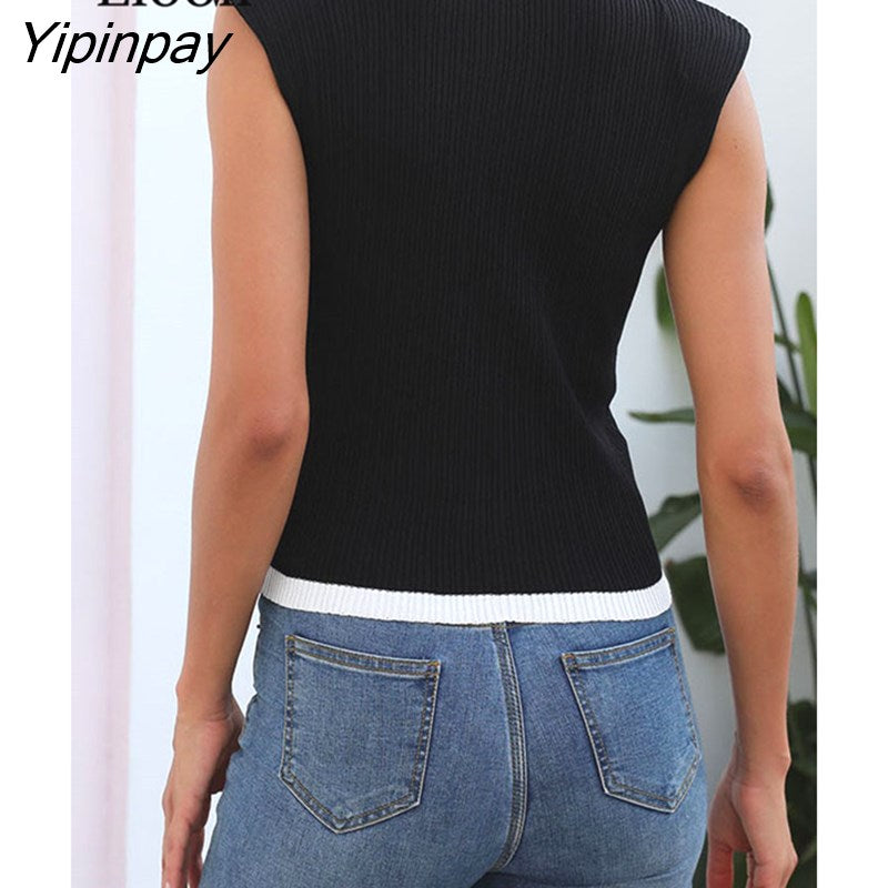 Yipinpay Patchwork Knitted Tops Women Skinny T Shirt Summer Sleeveless Turndown Collar Black White Basic Tees Sexy Knitting Tops