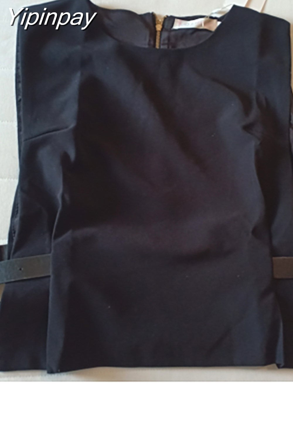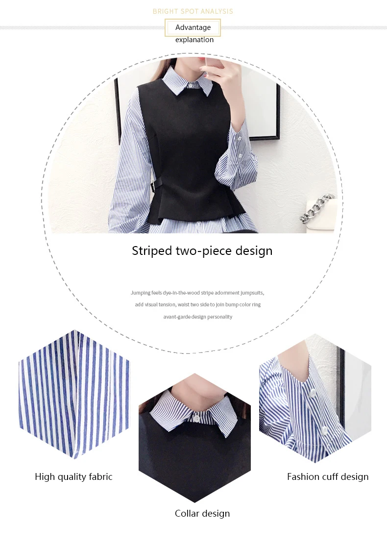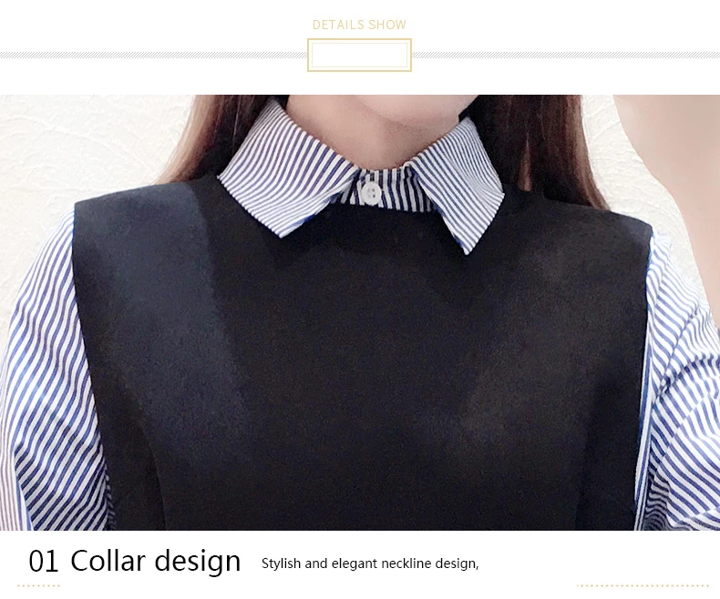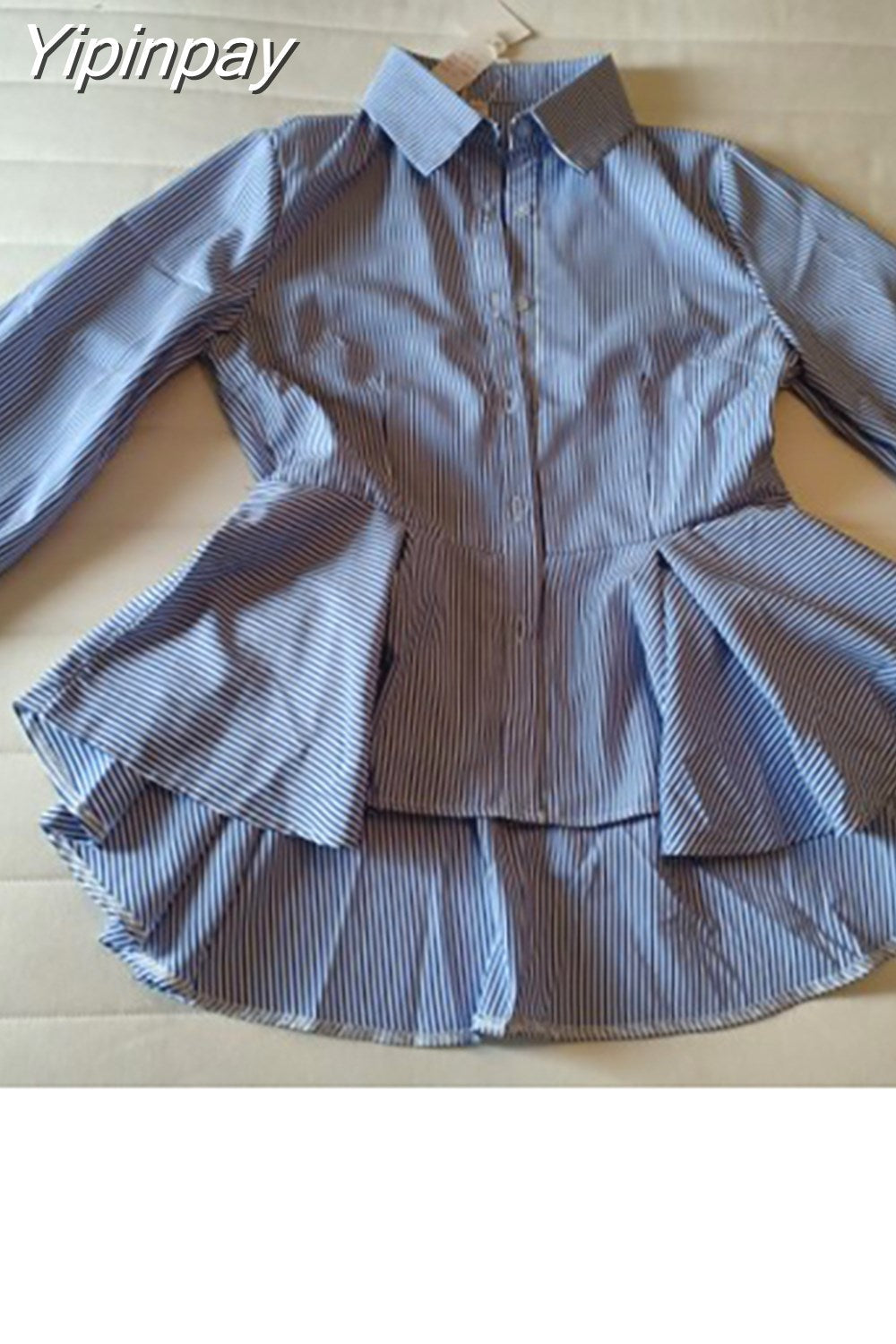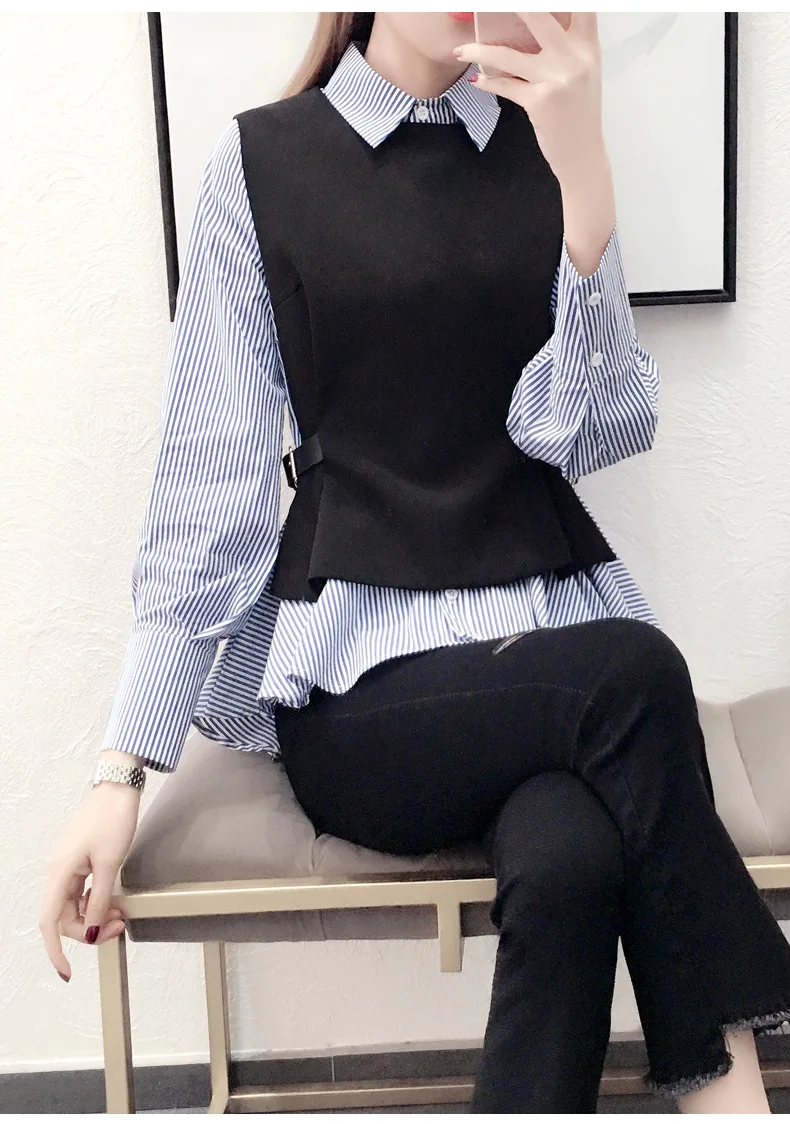 Yipinpay Patchwork Shirt Womens Tops Office Blouse Fake Collar ladies Blue Stripe Slim Casual Autumn Warm Shirts Long Sleeve 2PC