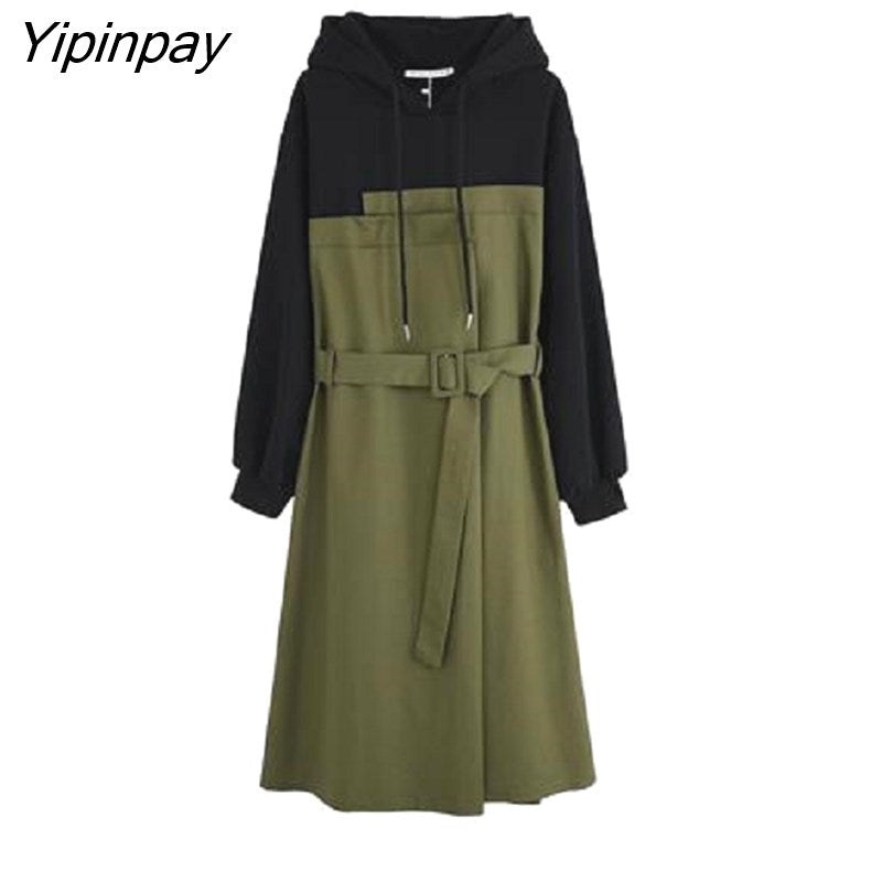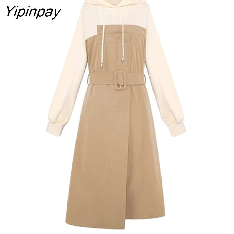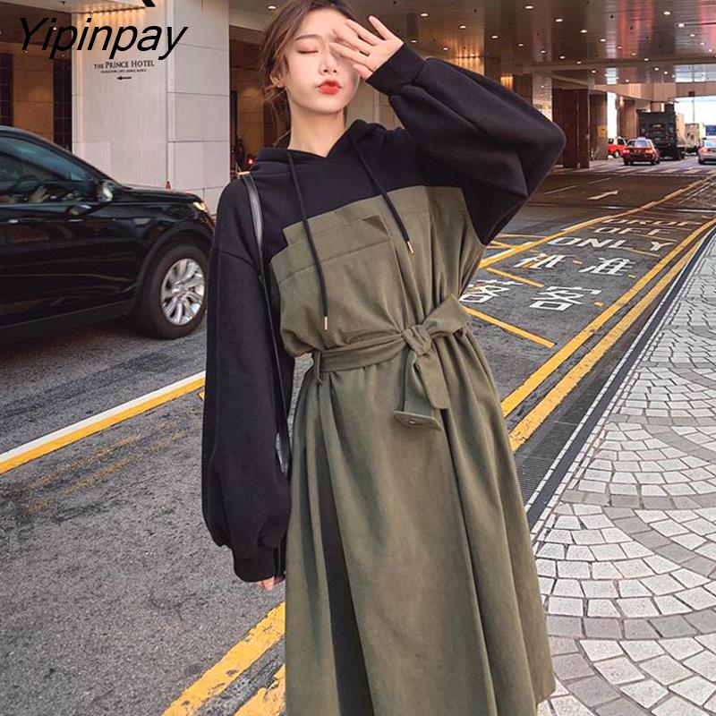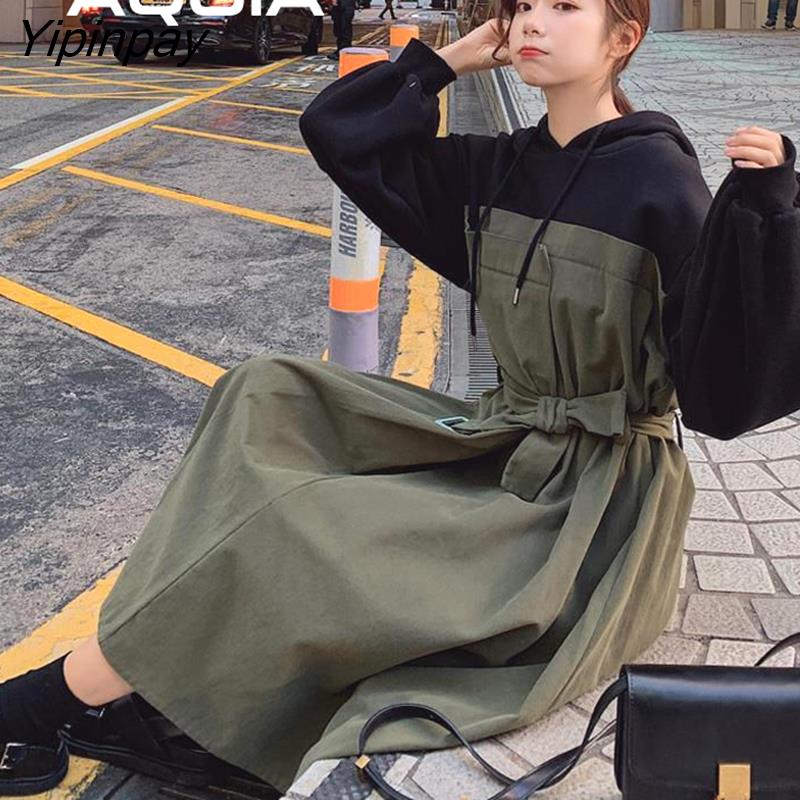 Yipinpay Patchwork Women Fake two pieces Long Dress 2023 Spring Fashion Loose Hoode Long Sleeve Plus Size Y2K Ladies Dresses