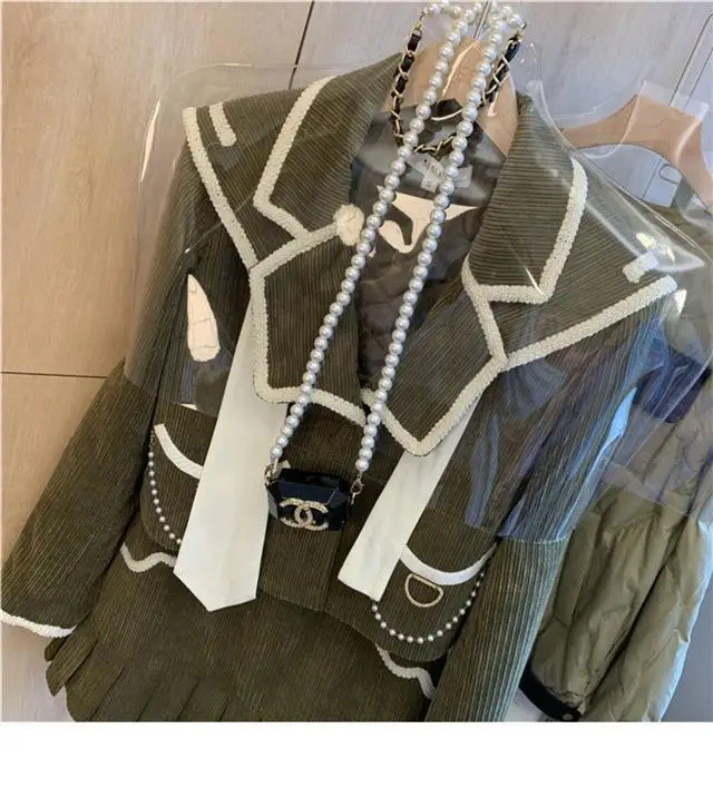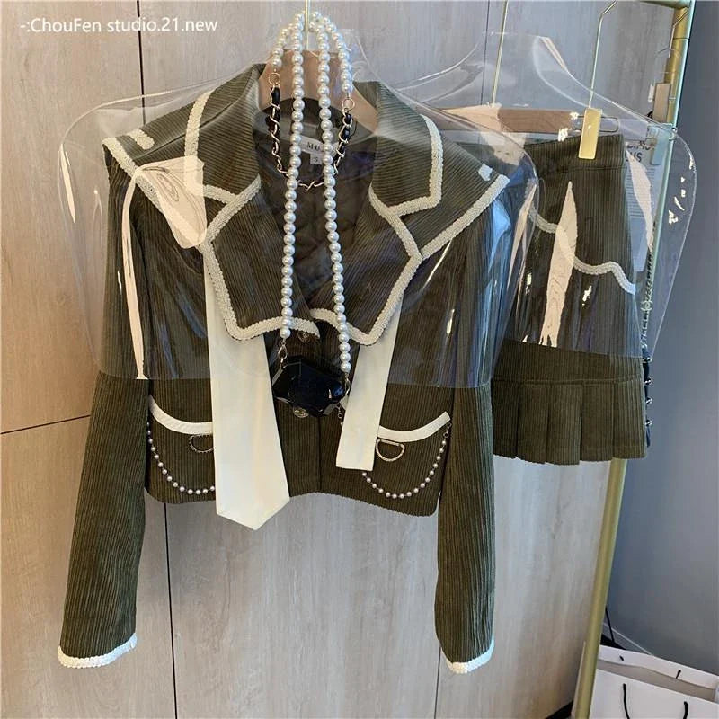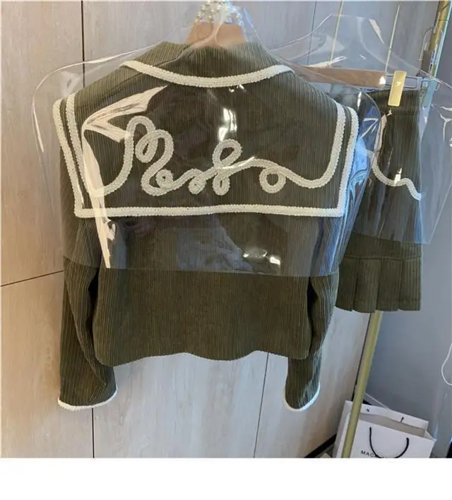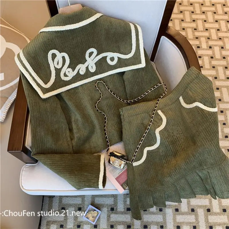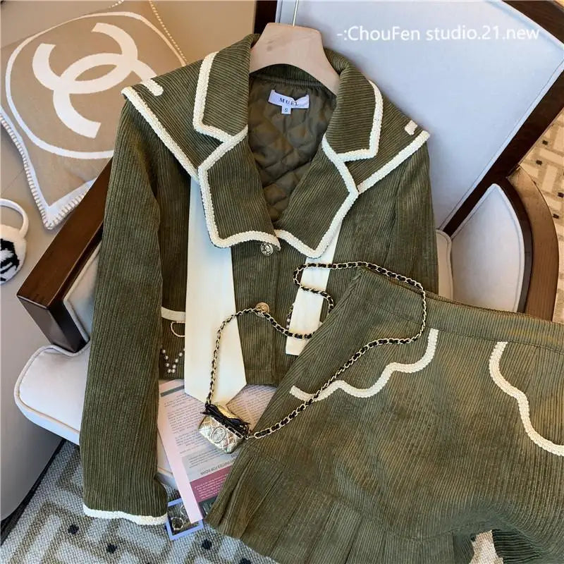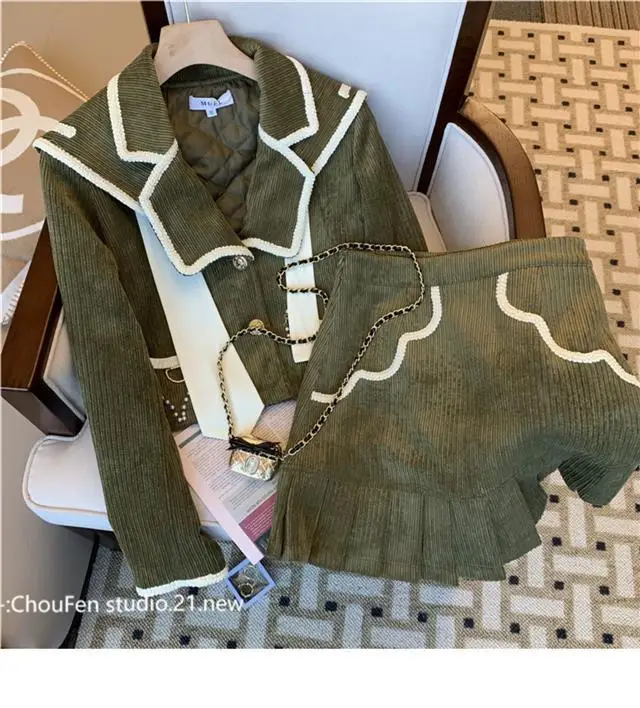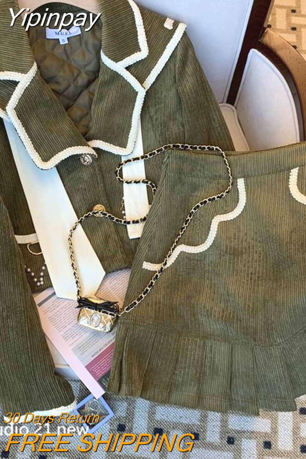 Yipinpay Piece Outfits Preppy Navy Collar Jacket Vintage Mini Pleated Skirts Sets 2023 Fall Patch Contrast Sailor Coat Casual