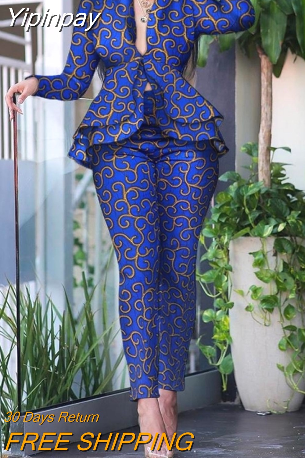 Yipinpay Piece Set Women Long Sleeve Solid Ruffles Design Top & Skinny Pencil Pant Sets Women Autumn Winter Outfits 911
