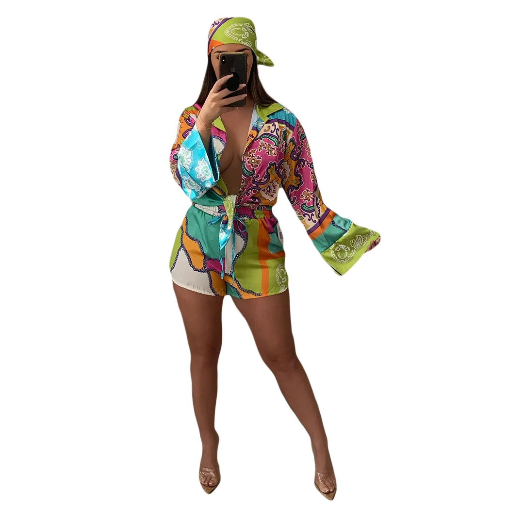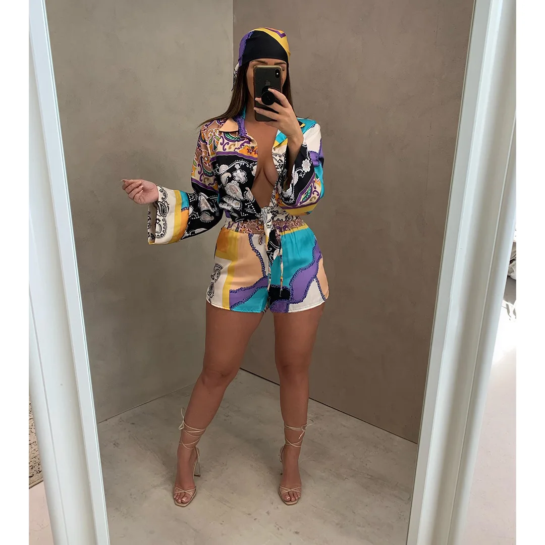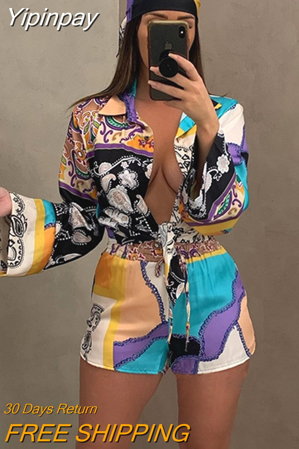 Yipinpay Pieces Set Sexy 2023 Summer Autumn Fashion Women Set Female Tops Floral Print Long Sleeve Shirt And Elastic Waist Shorts Scarf