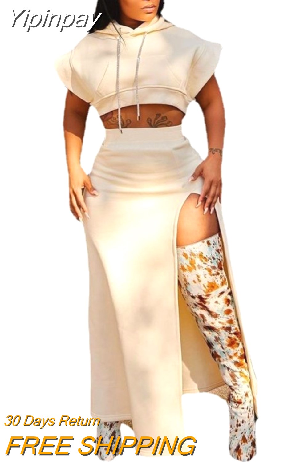 Yipinpay Pieces Set Sexy Autumn Winter Fashion Women Set 2023 Female Hoodies Tops Short Sleeve Sweatshirts Elastic Waist Maxi Skirts