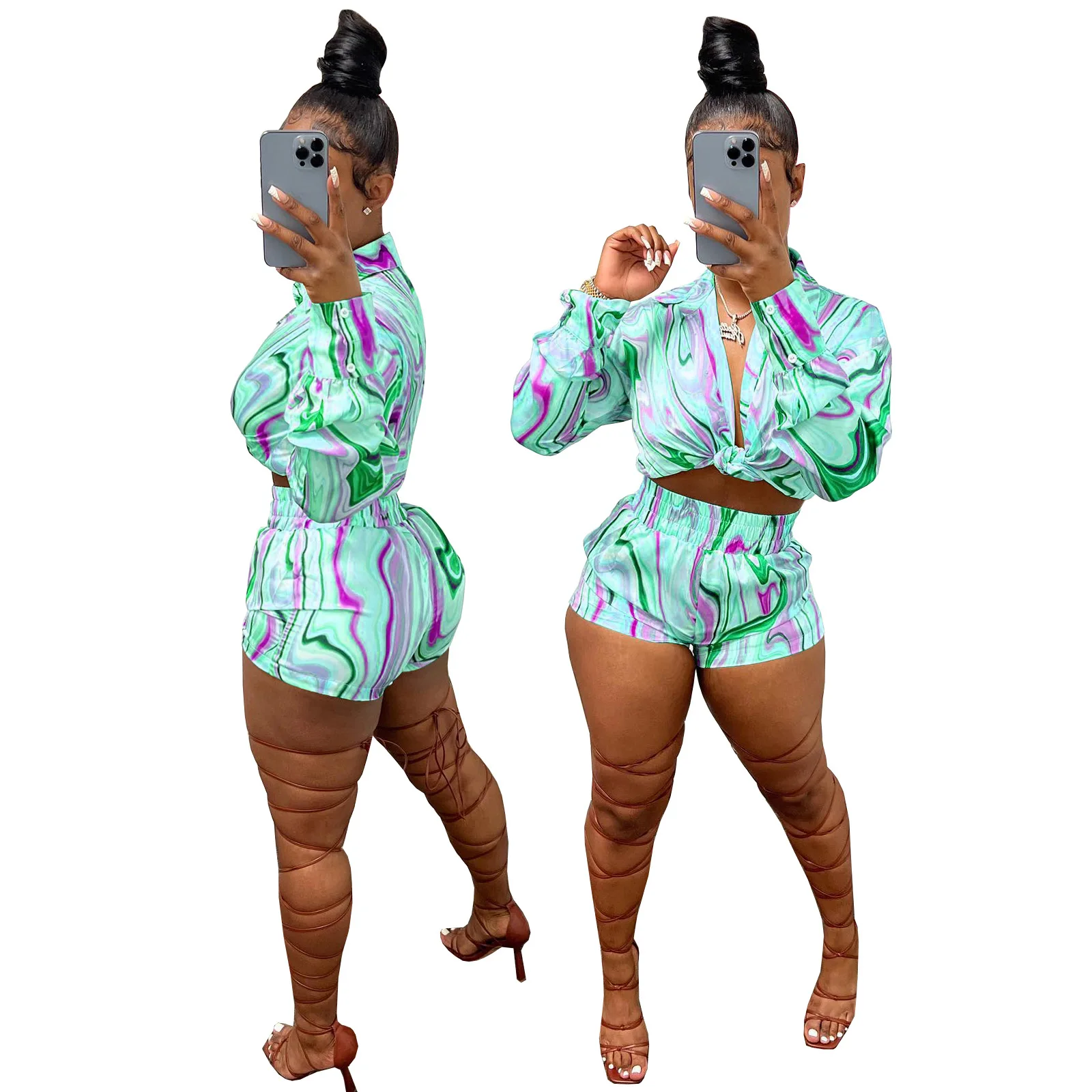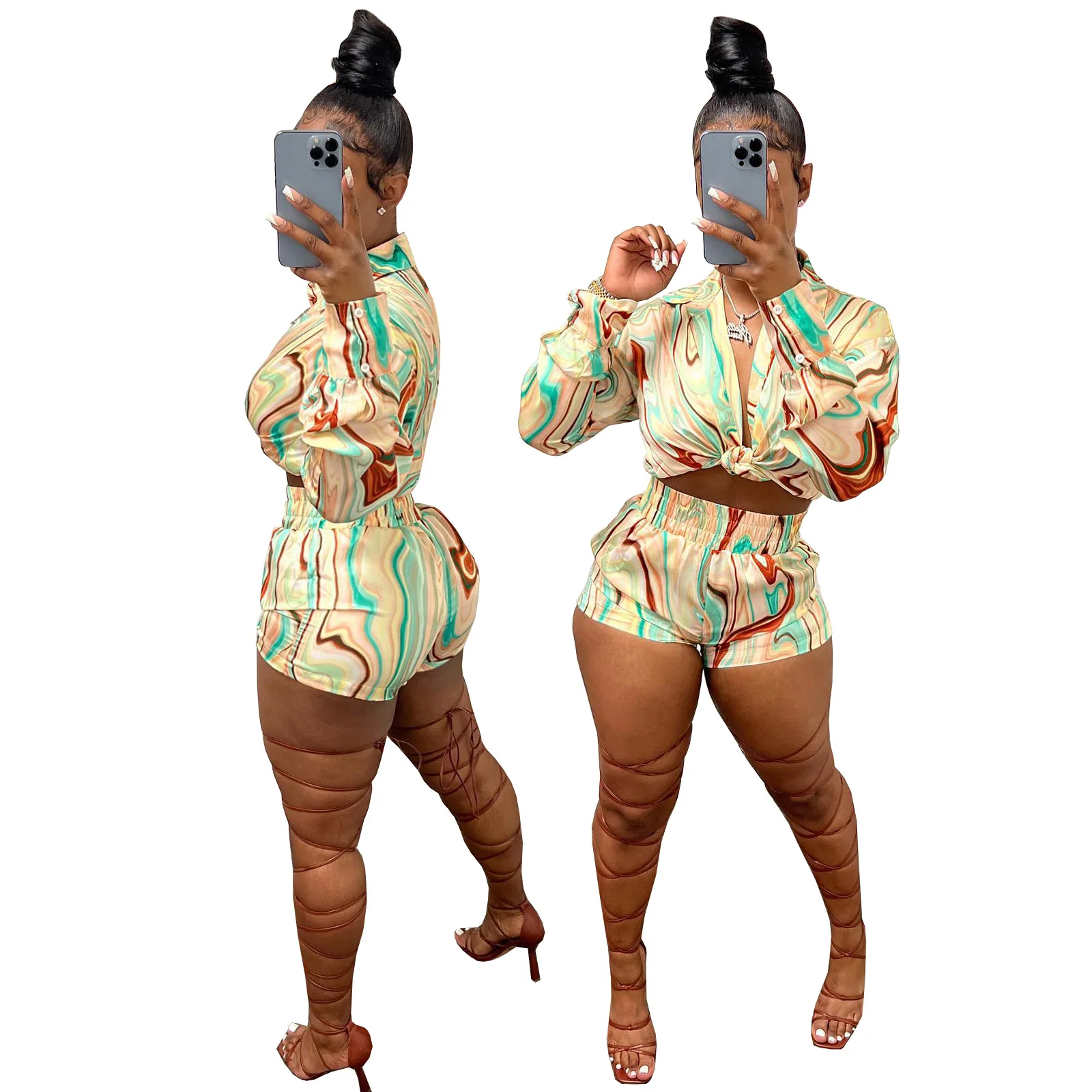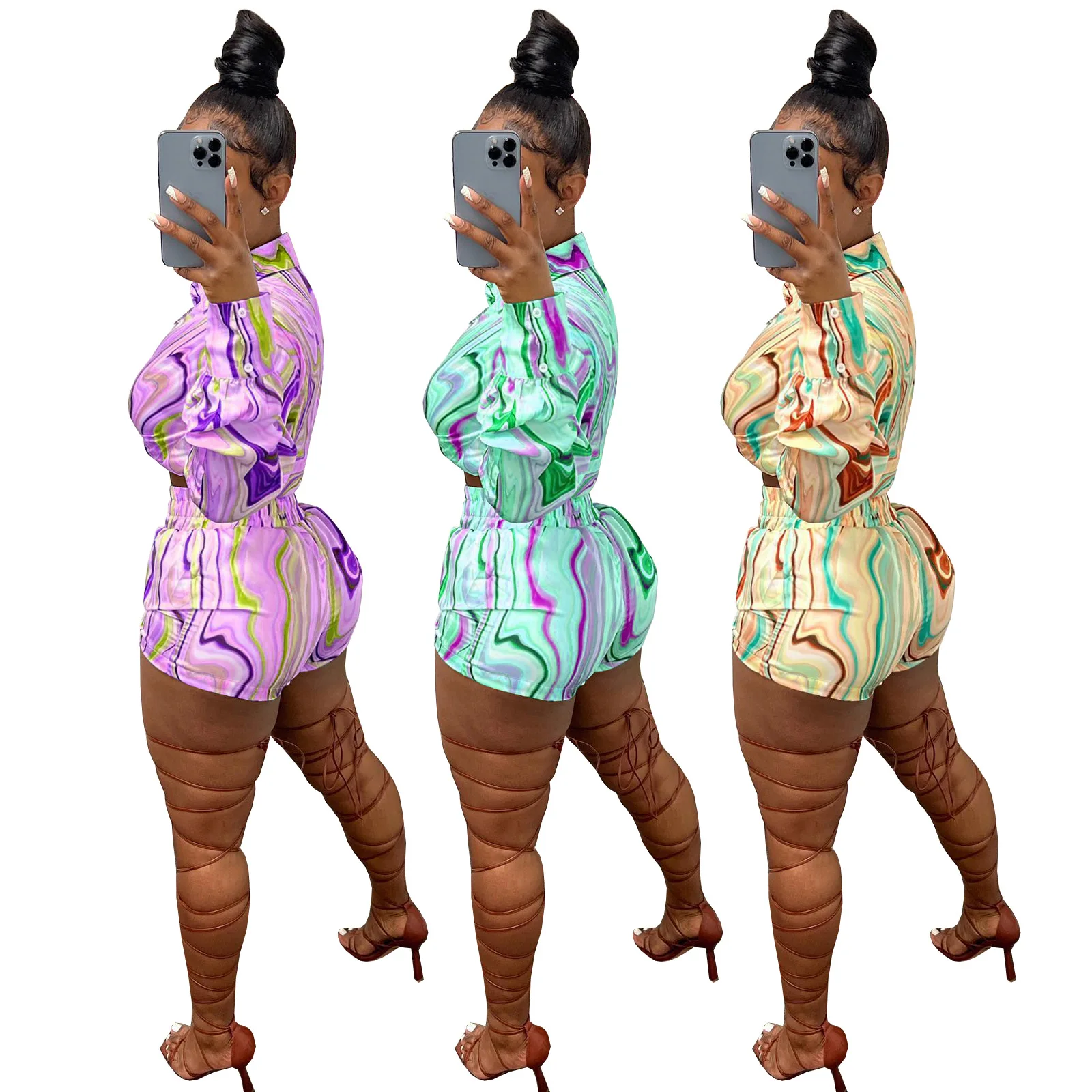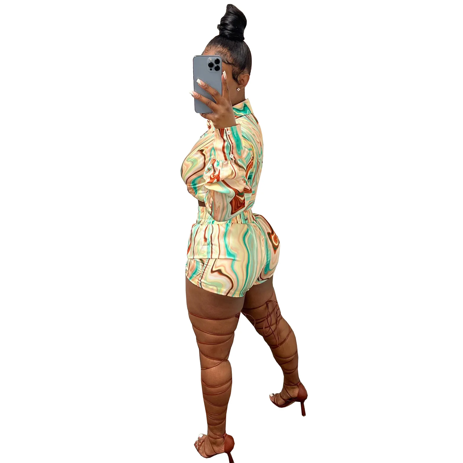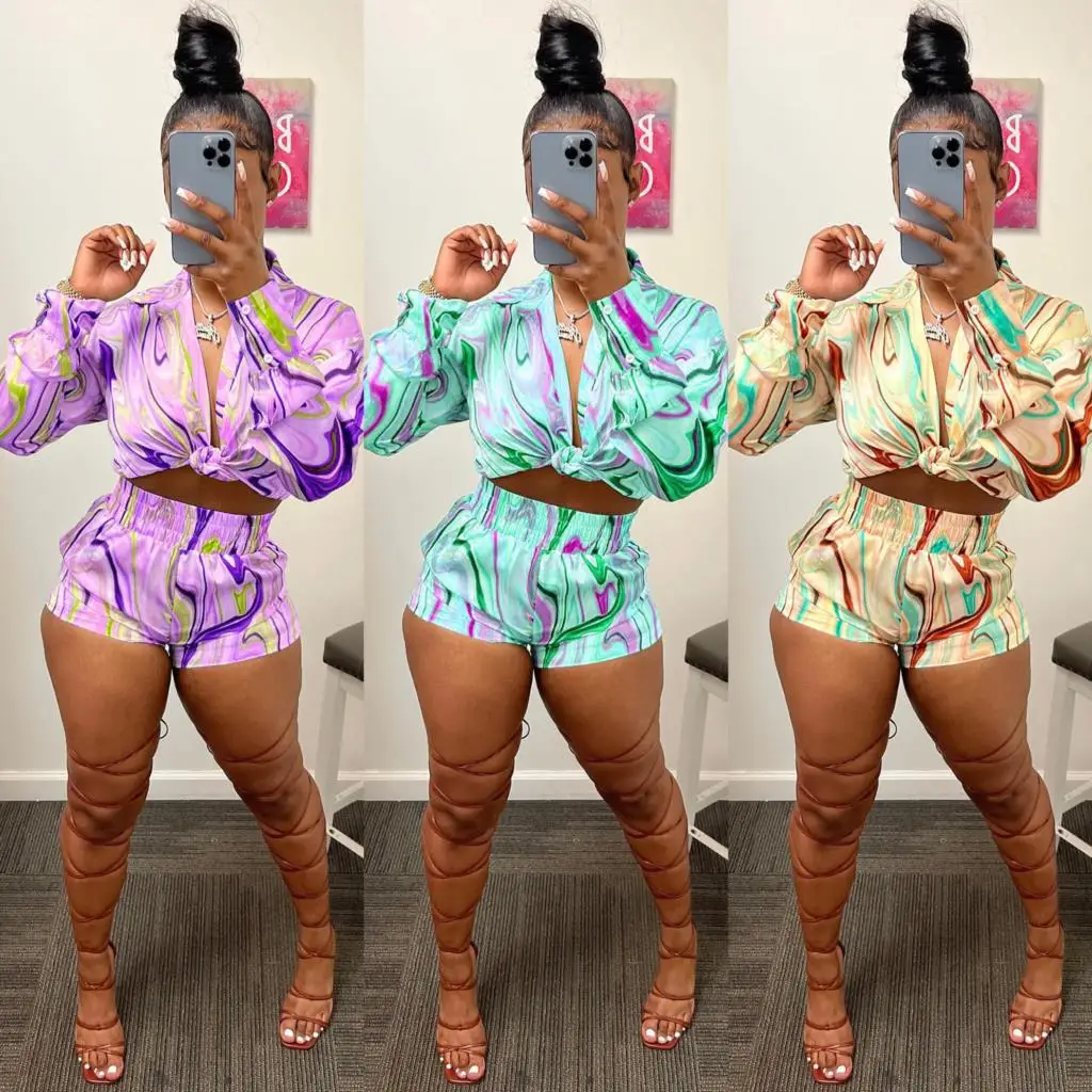 Yipinpay Pieces Set Sexy Summer Autumn Fashion Women Sets 2023 Stripe Long Sleeve Shirt Tops And Elastic Waist Shorts Suits Outfit