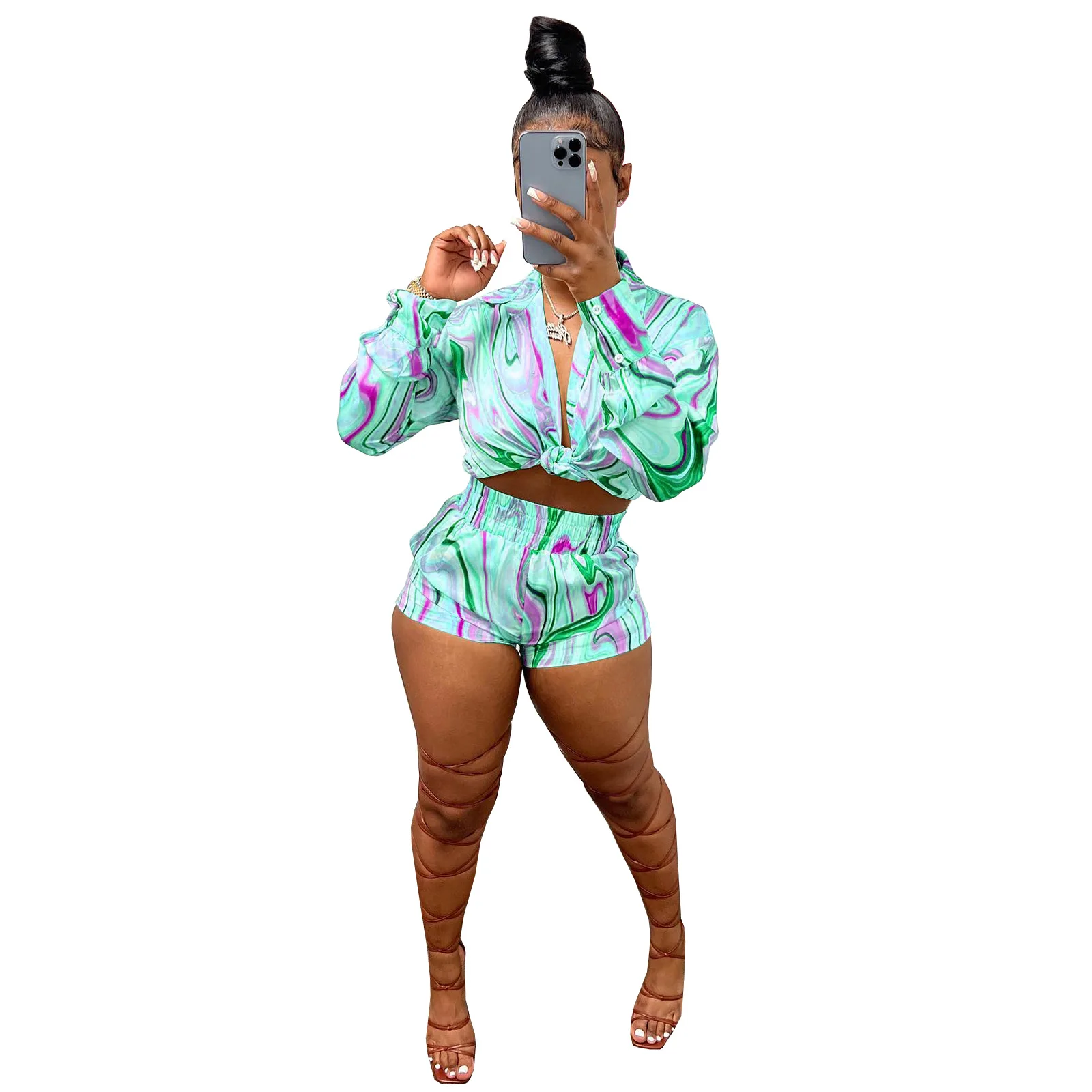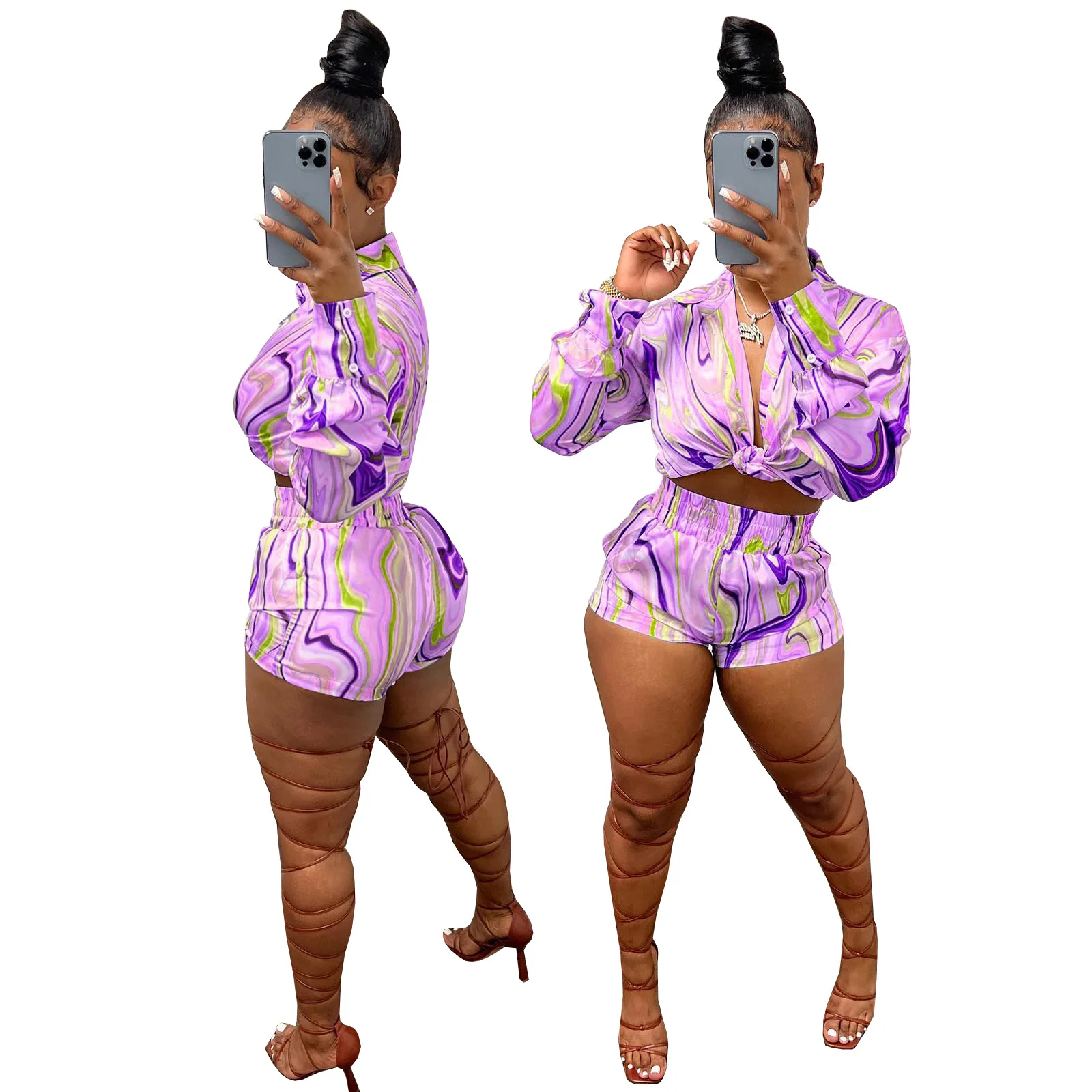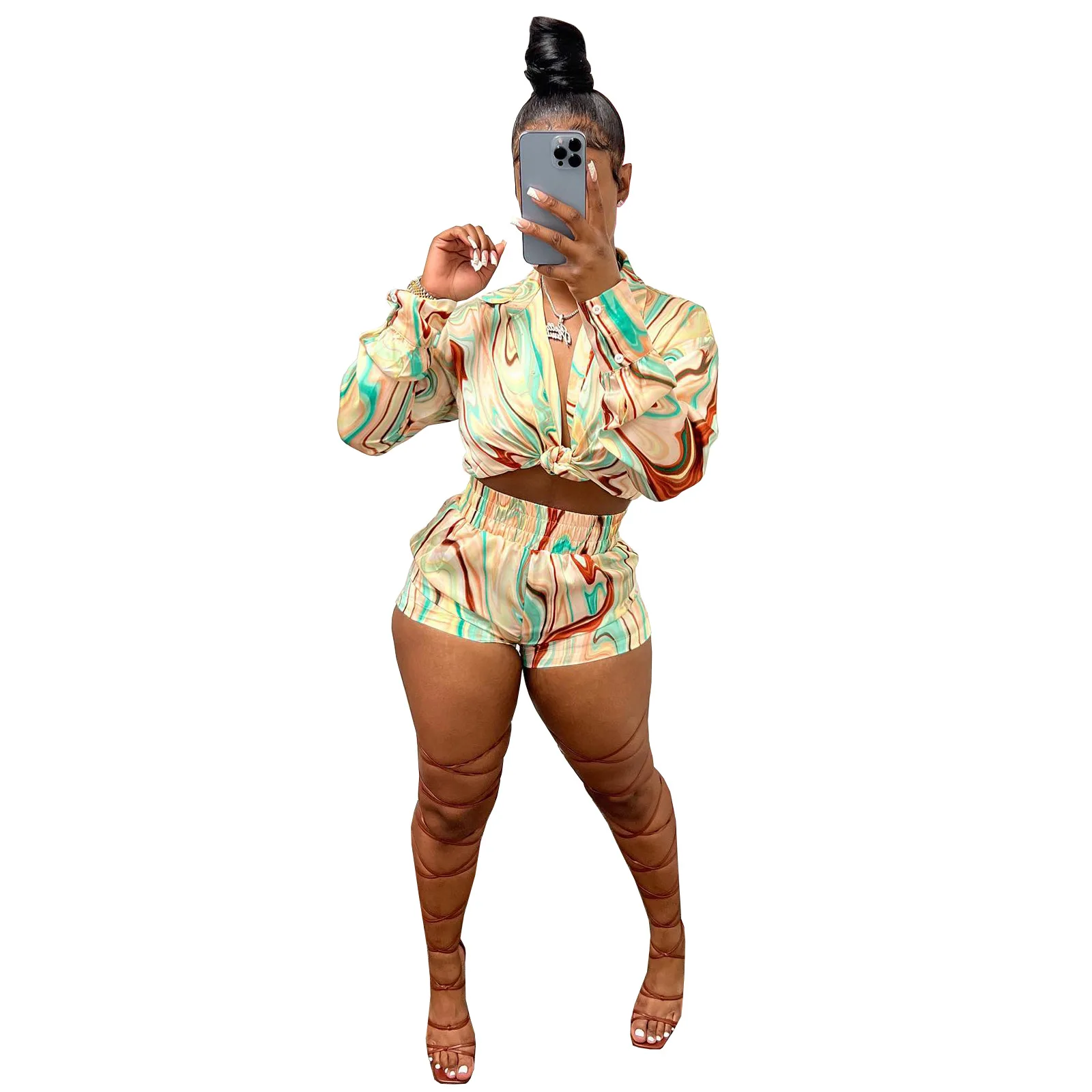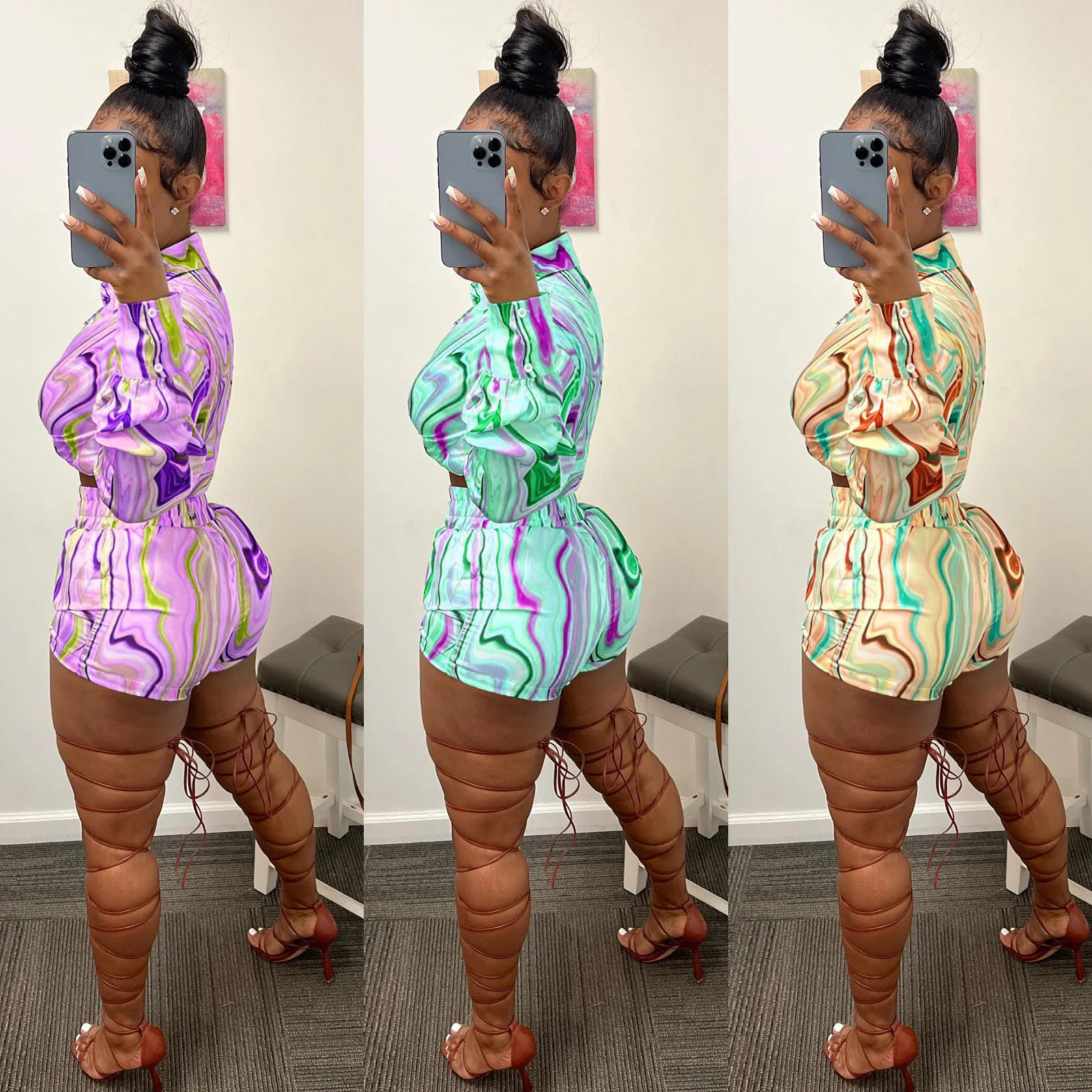 Yipinpay Pieces Set Sexy Summer Autumn Fashion Women Sets 2023 Stripe Long Sleeve Shirt Tops And Elastic Waist Shorts Suits Outfit