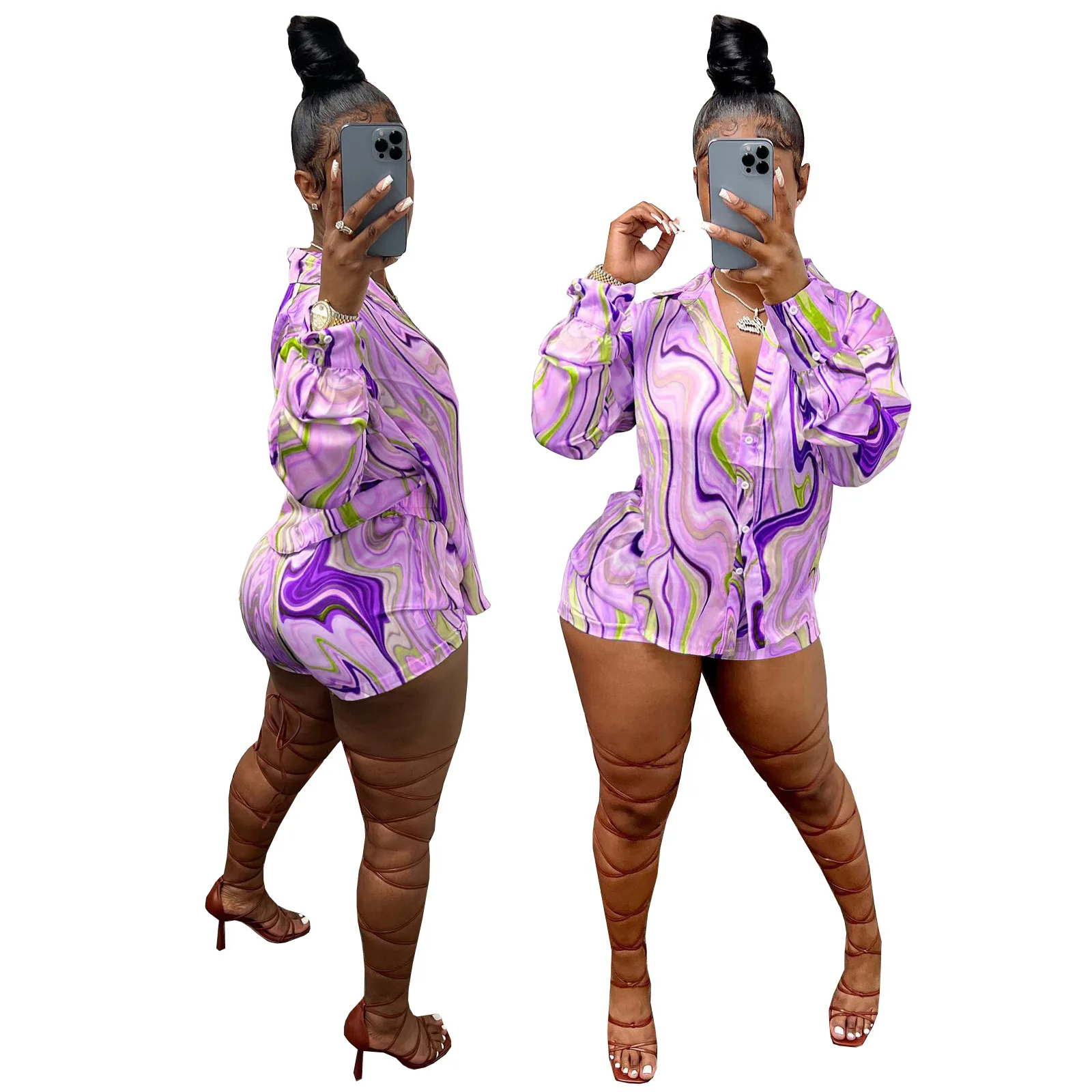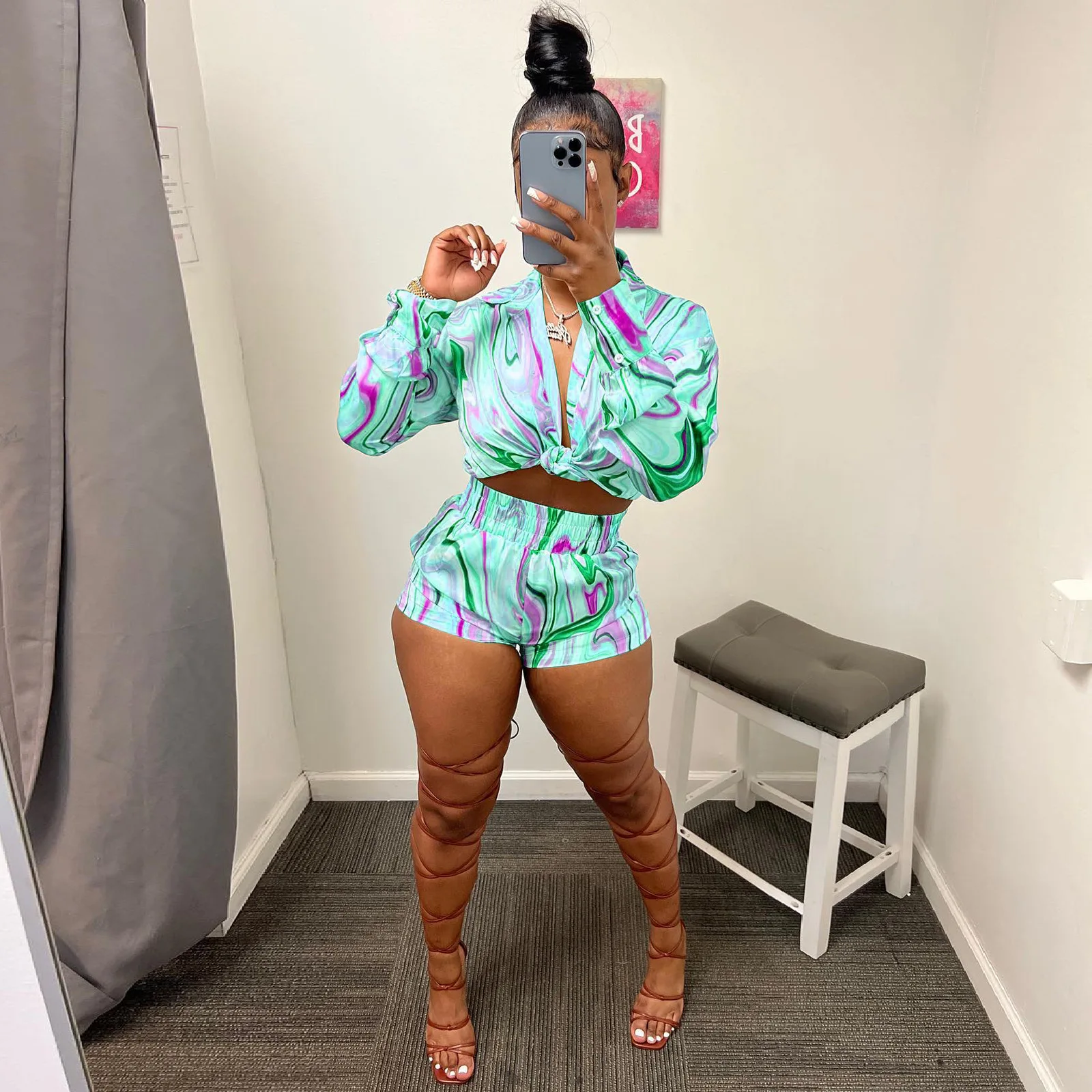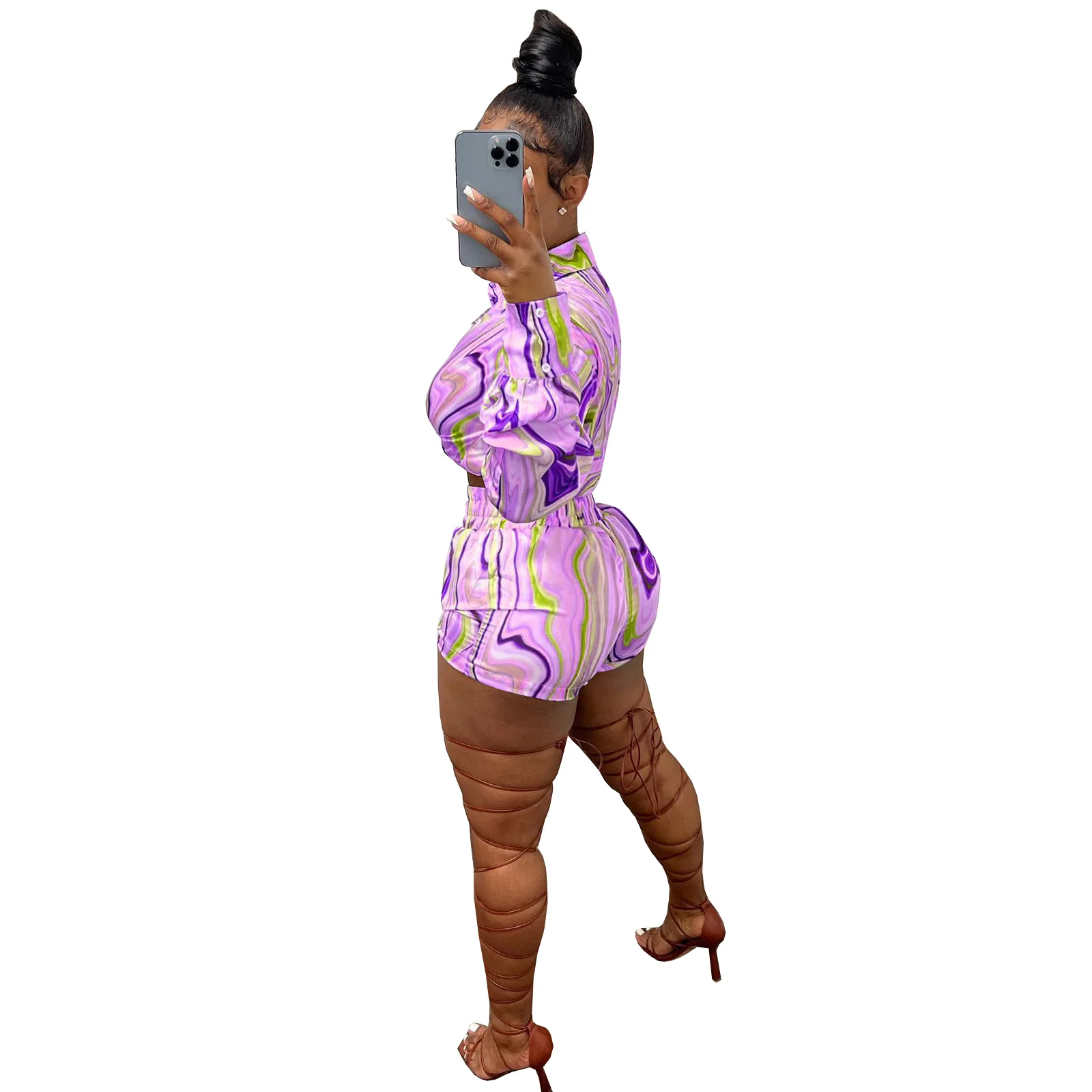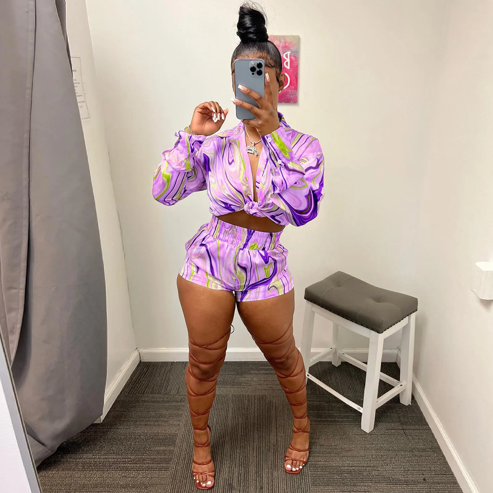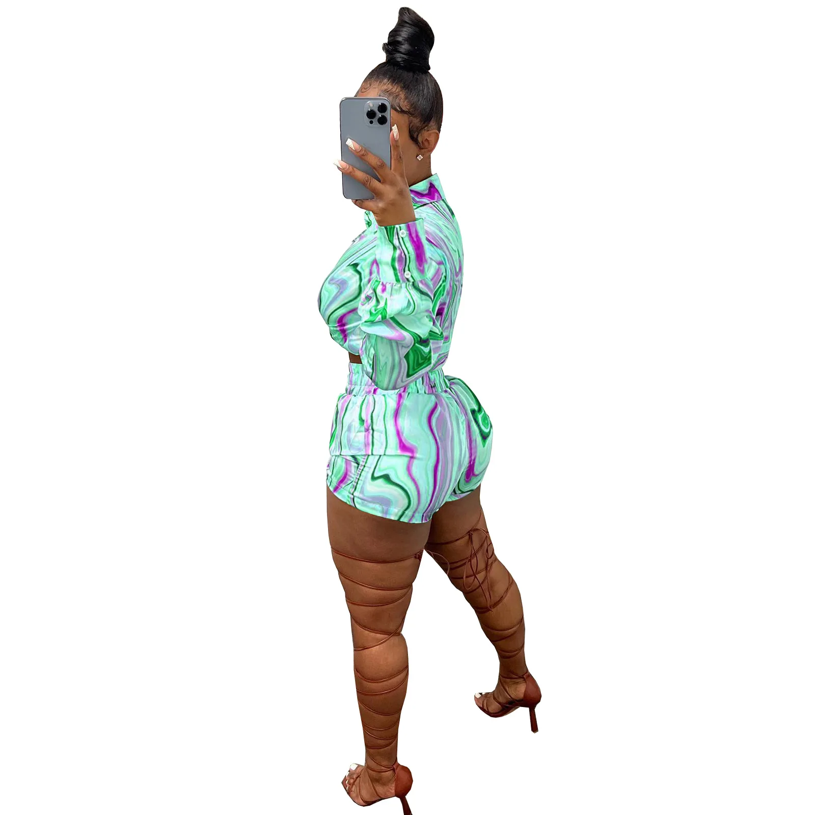 Yipinpay Pieces Set Sexy Summer Autumn Fashion Women Sets 2023 Stripe Long Sleeve Shirt Tops And Elastic Waist Shorts Suits Outfit