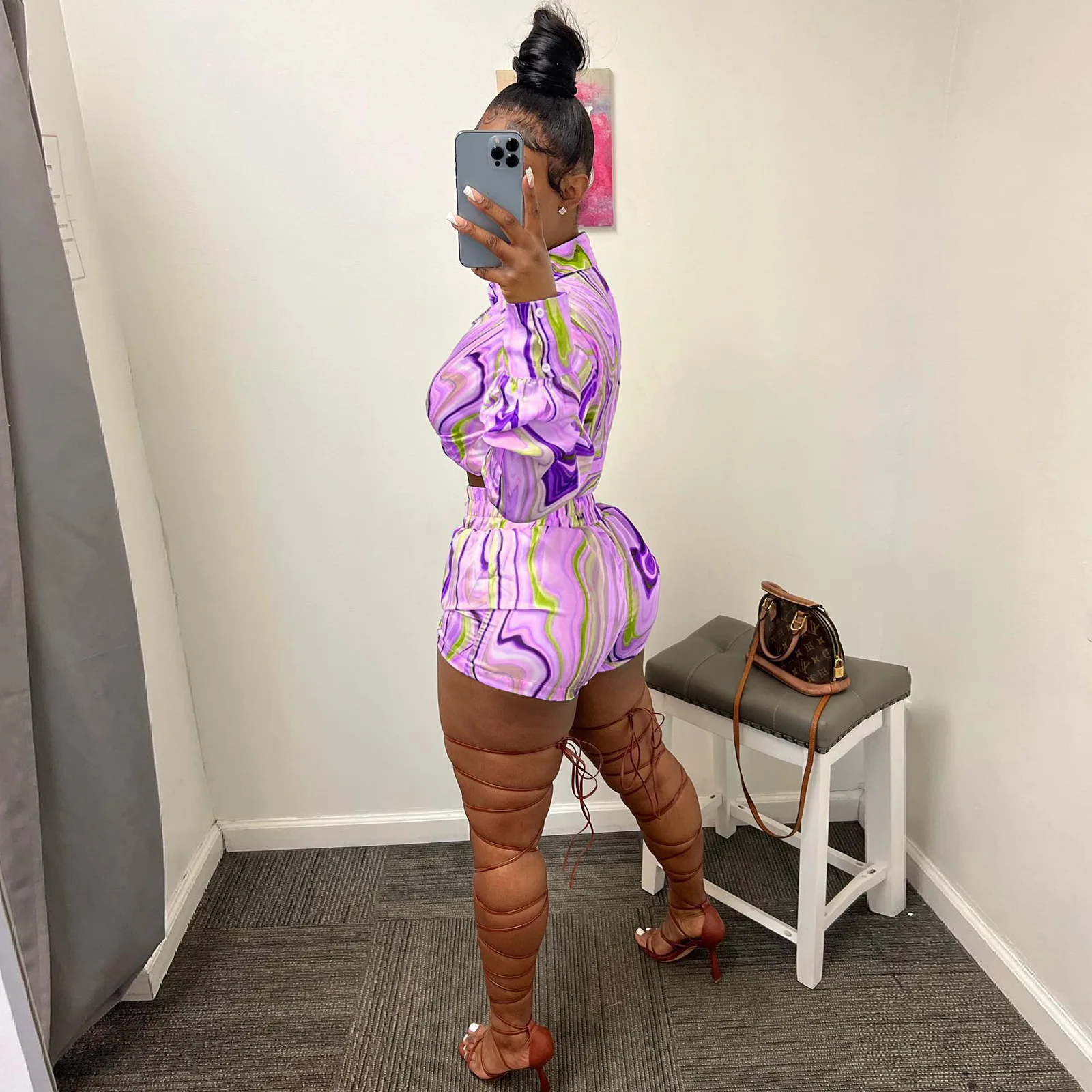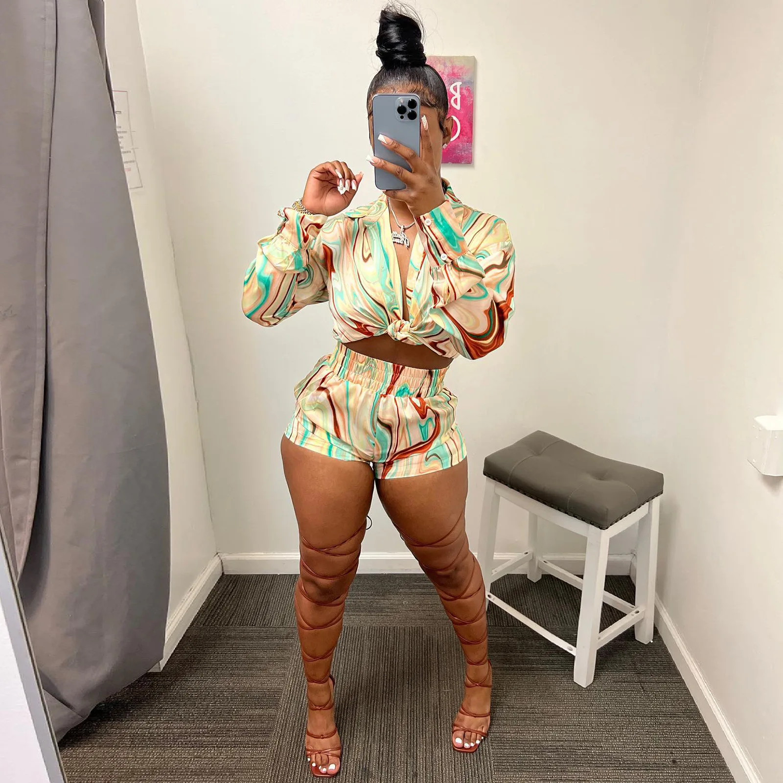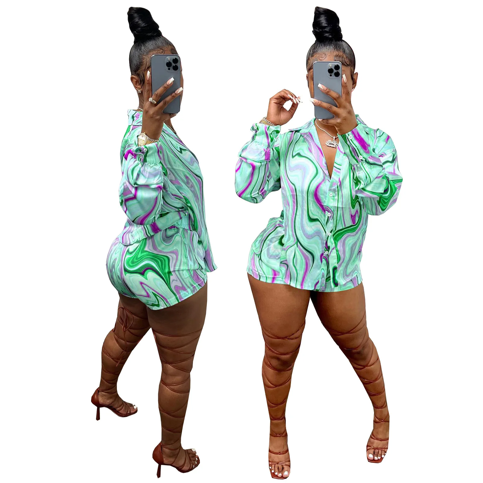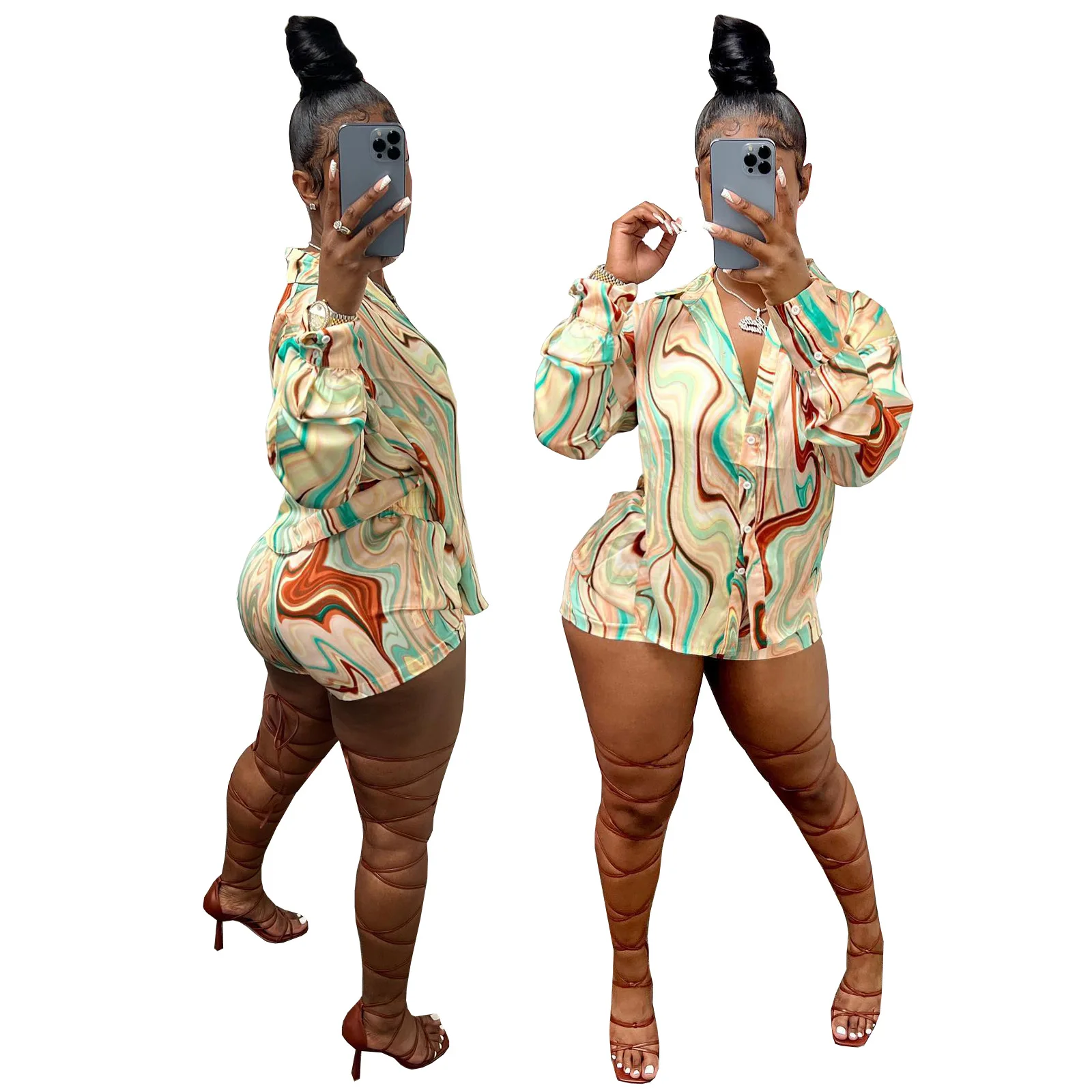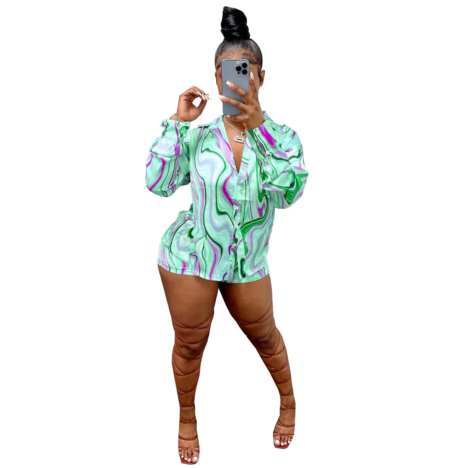 Yipinpay Pieces Set Sexy Summer Autumn Fashion Women Sets 2023 Stripe Long Sleeve Shirt Tops And Elastic Waist Shorts Suits Outfit
