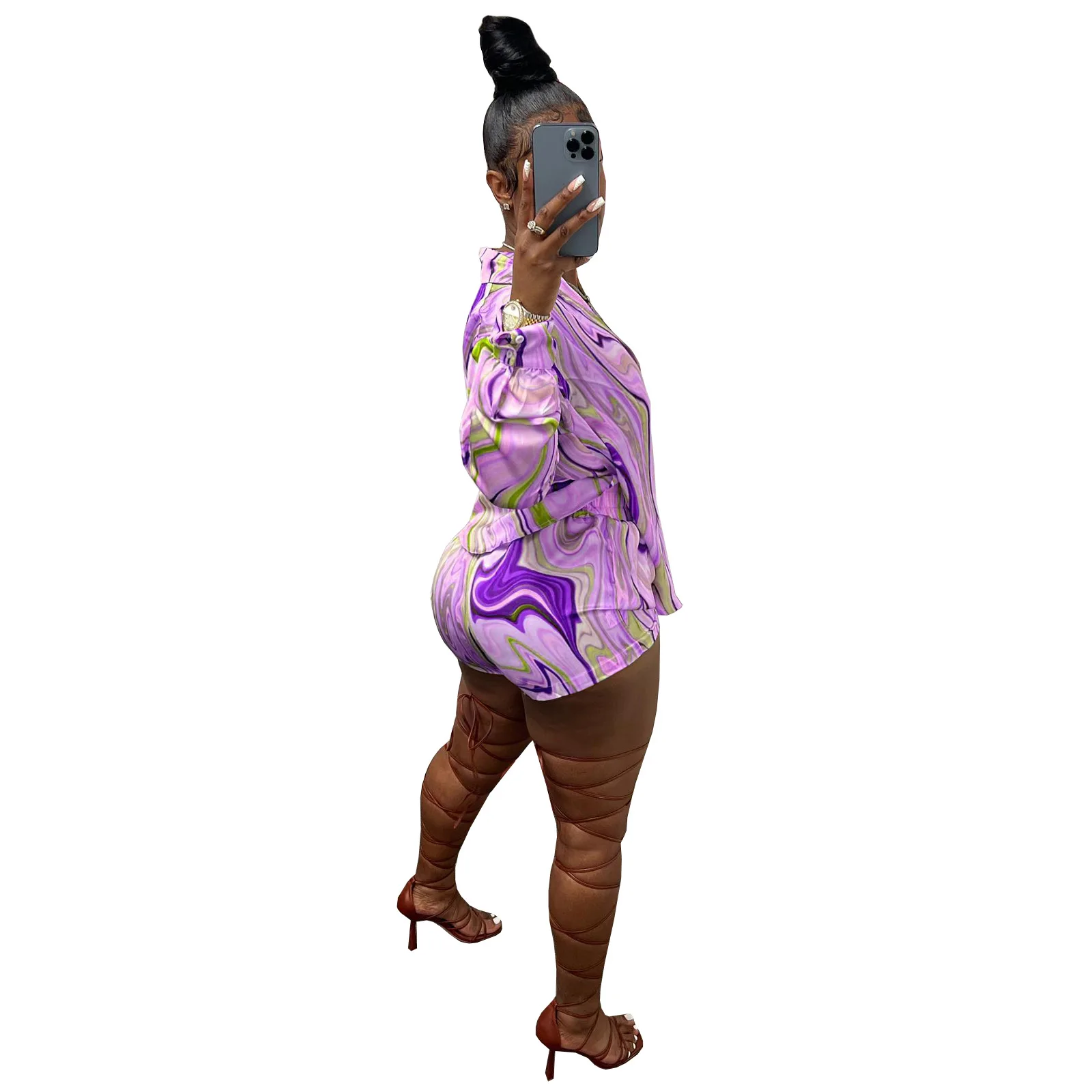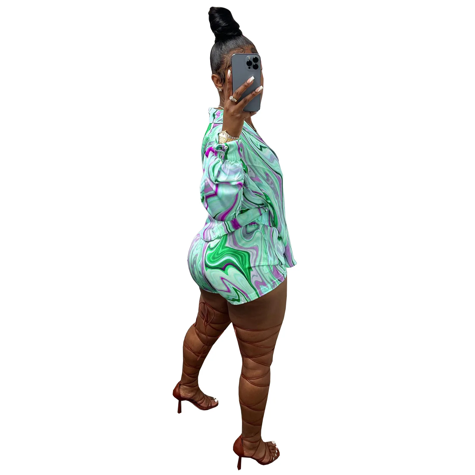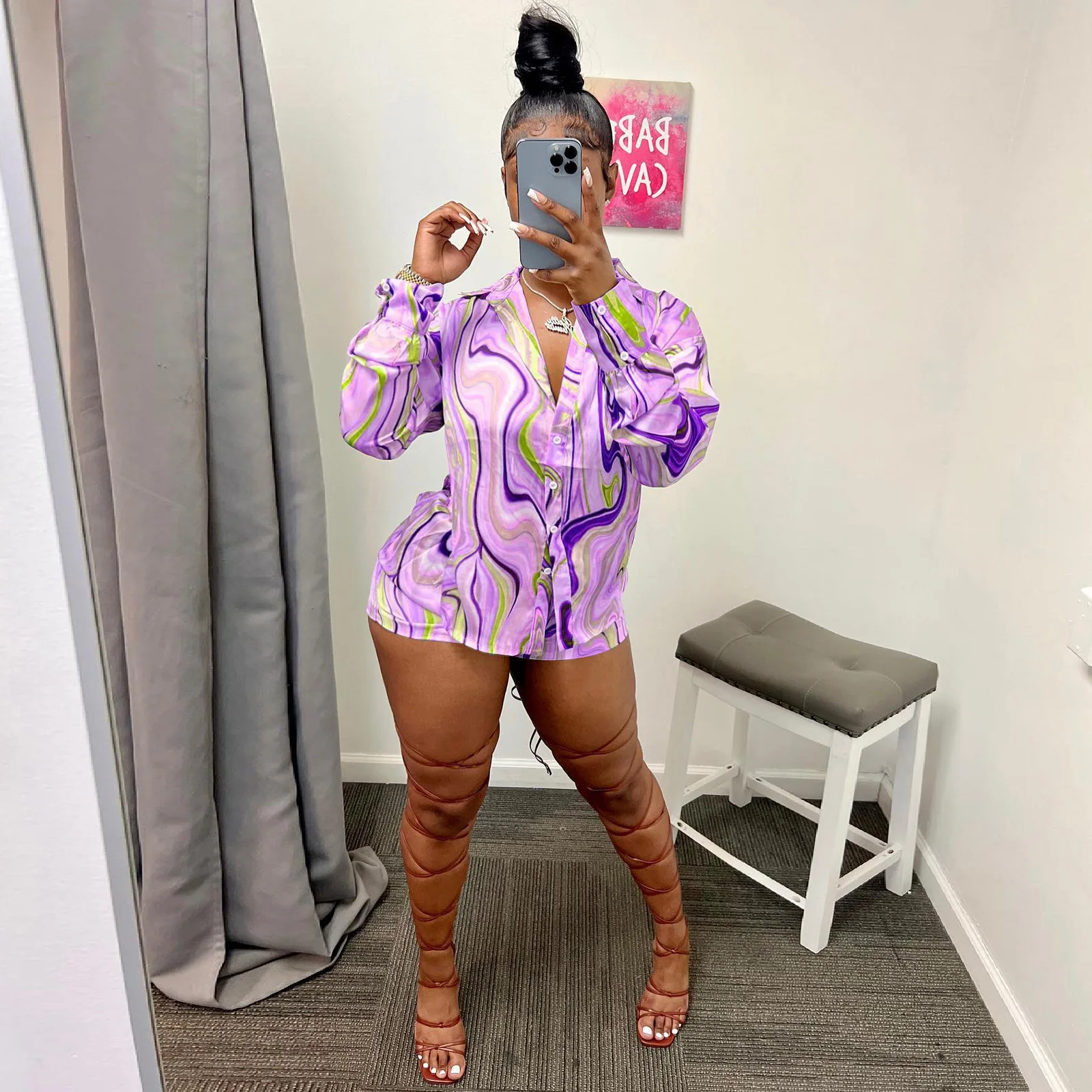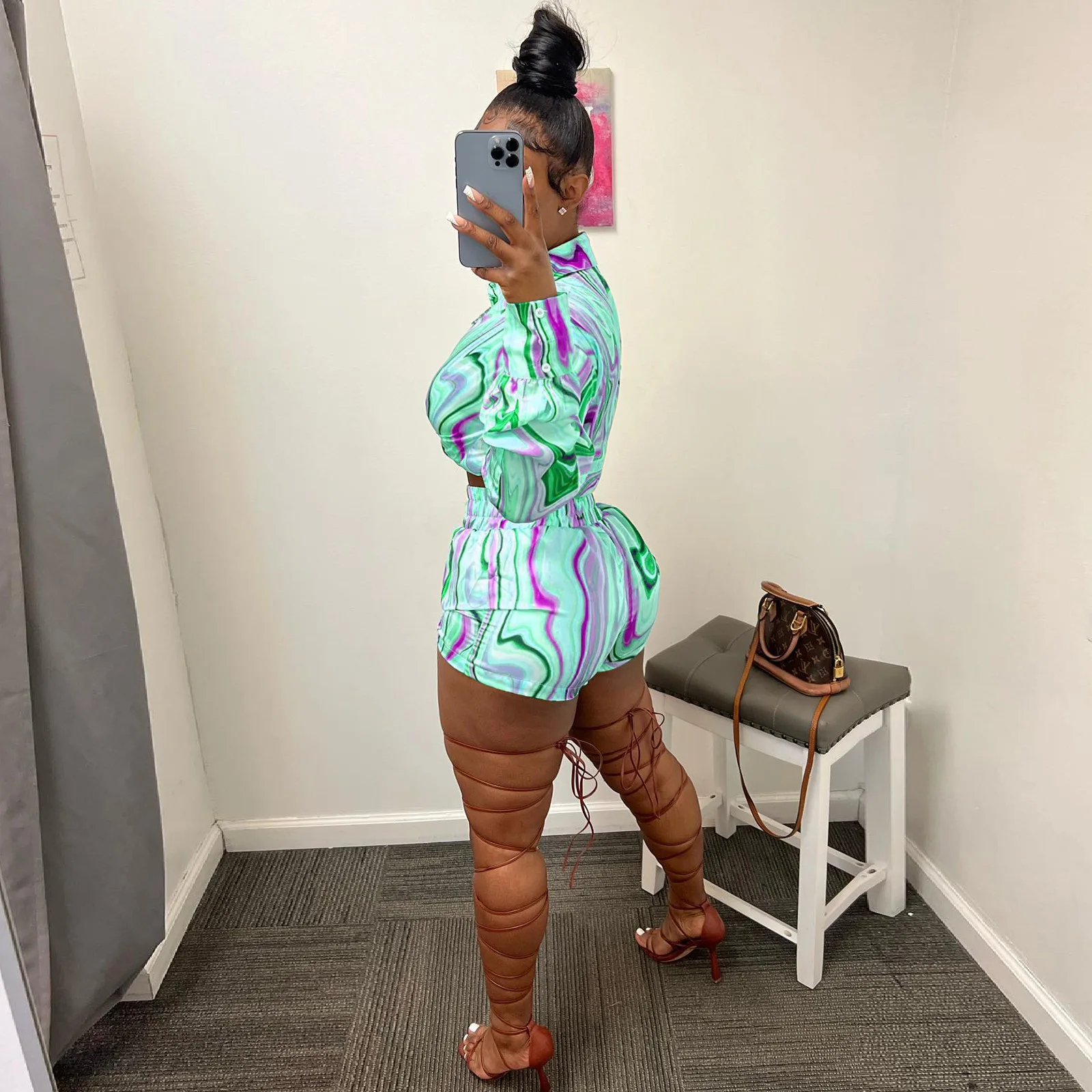 Yipinpay Pieces Set Sexy Summer Autumn Fashion Women Sets 2023 Stripe Long Sleeve Shirt Tops And Elastic Waist Shorts Suits Outfit