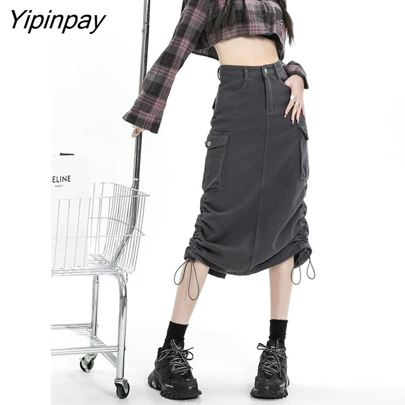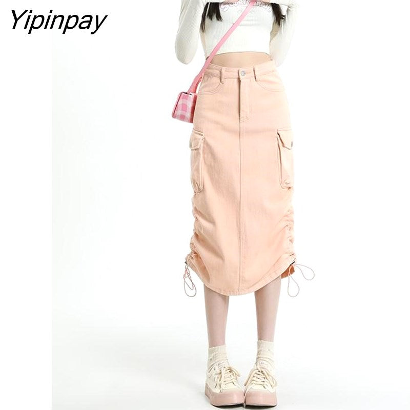 Yipinpay Pink Overalls Denim Skirt Women's High Waist Split A-line Hip Wrap Skirt