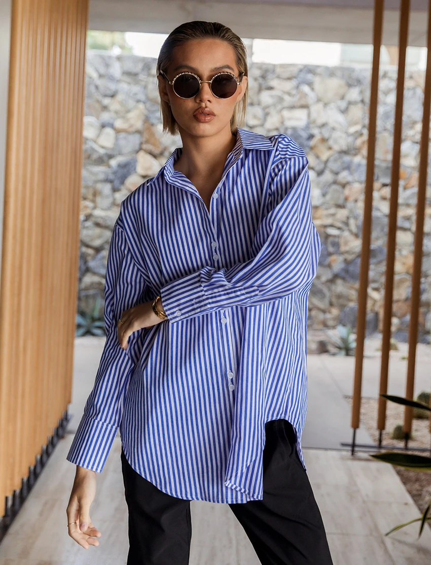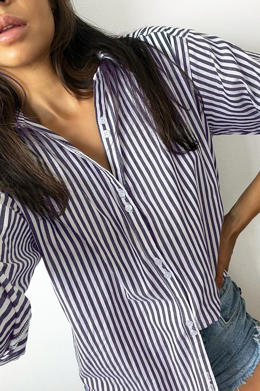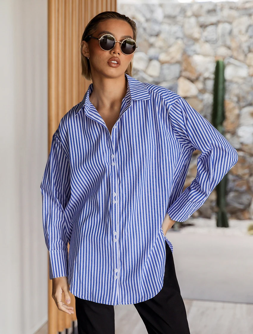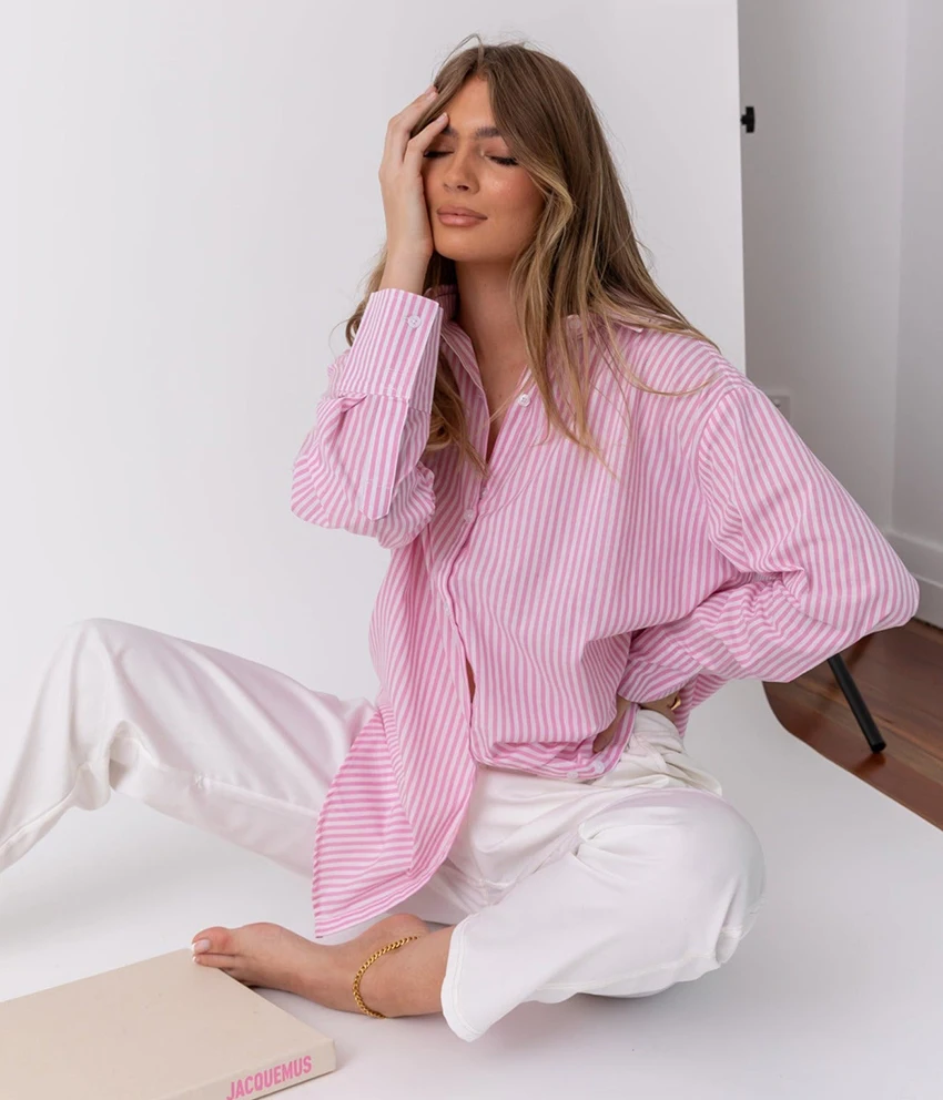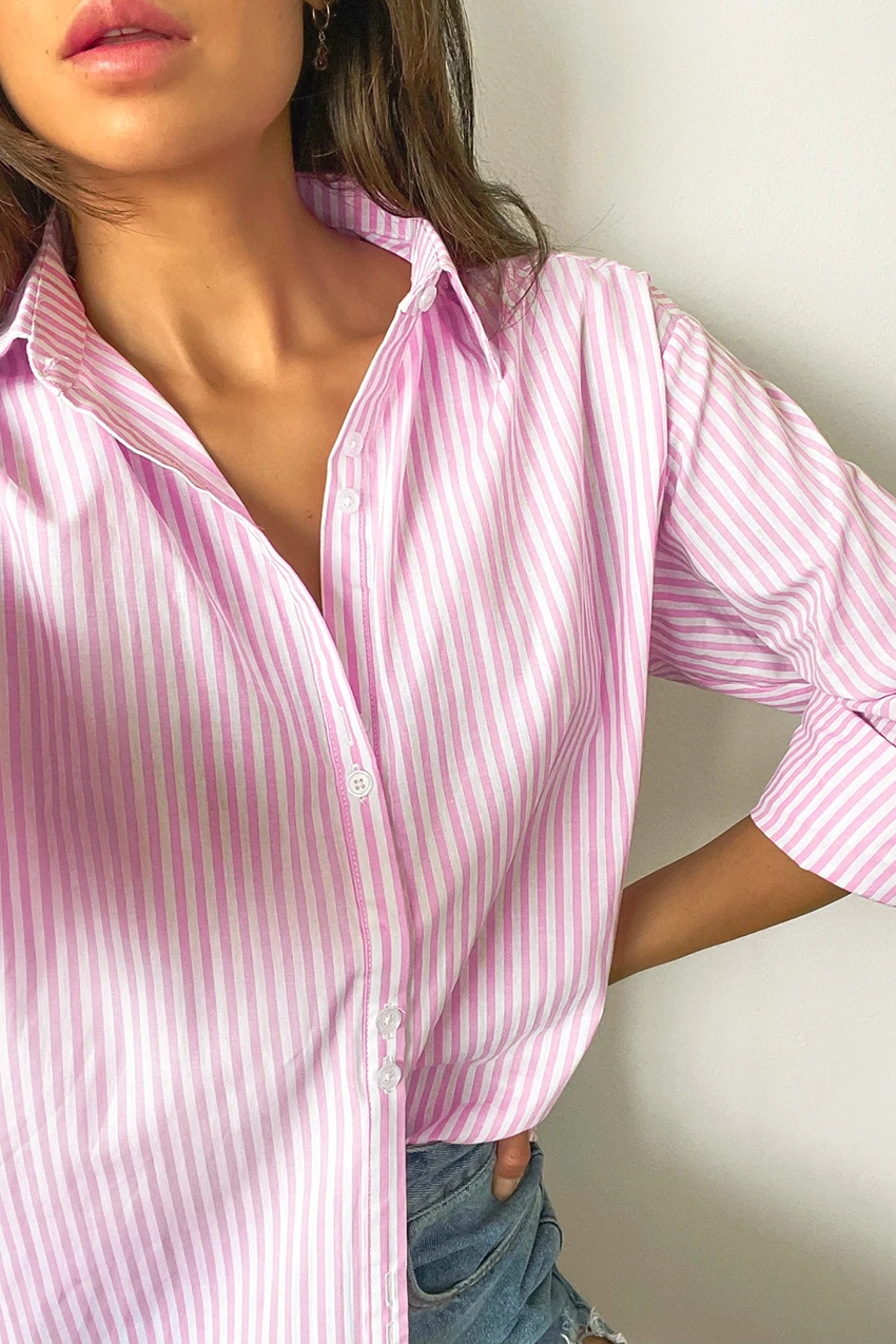 Yipinpay Pink Stripe Women Lapel Shirts Autumn Long Sleeve Fashion 2023 Oversize Blouses And Tops Office Ladies Streak Casual