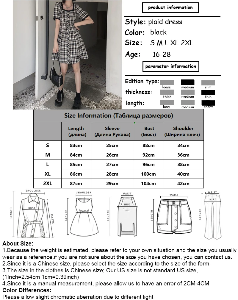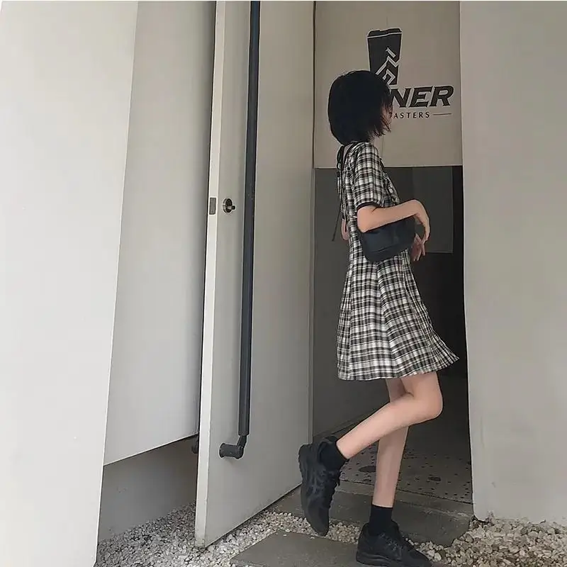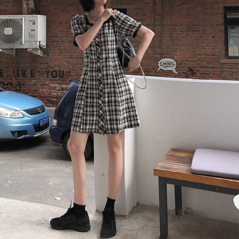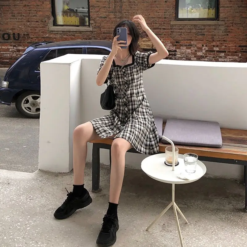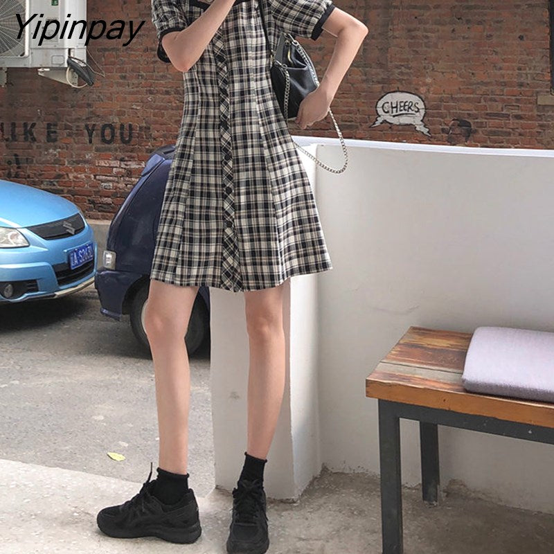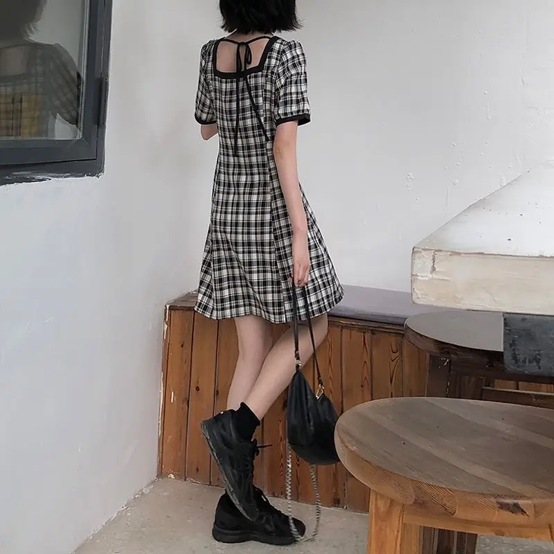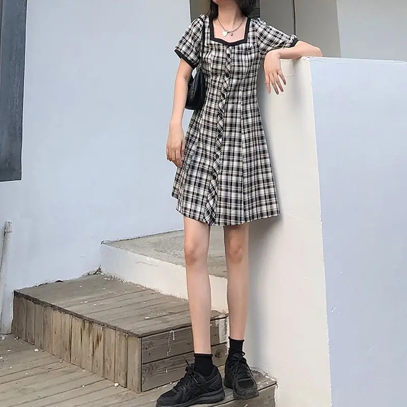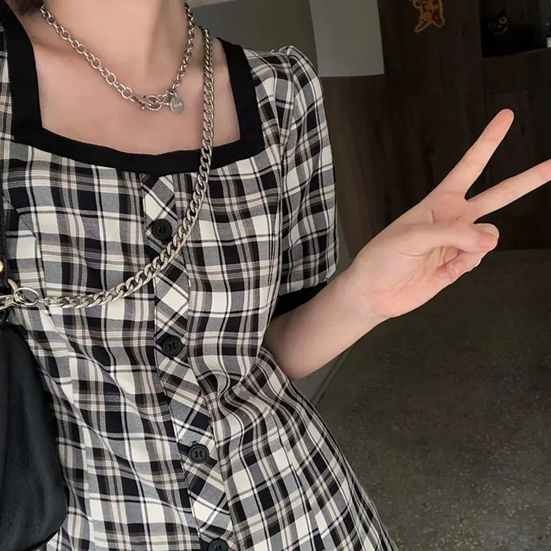Yipinpay Plaid Dress Women Summer New Korean Slim Plaid Dress Female Square Collar Dresses for Women Party Vestido Feminino