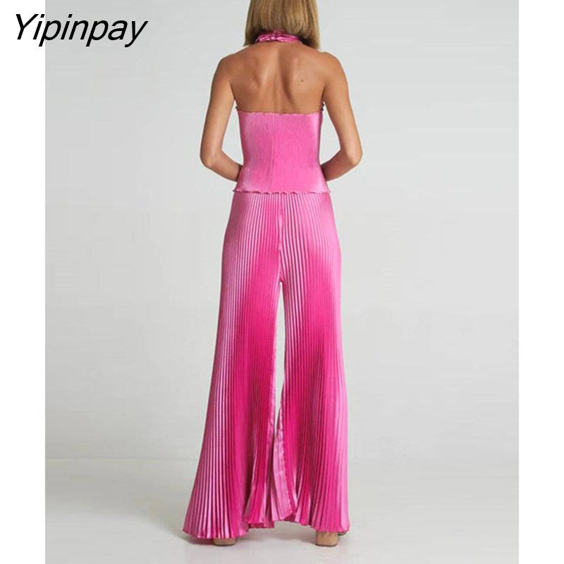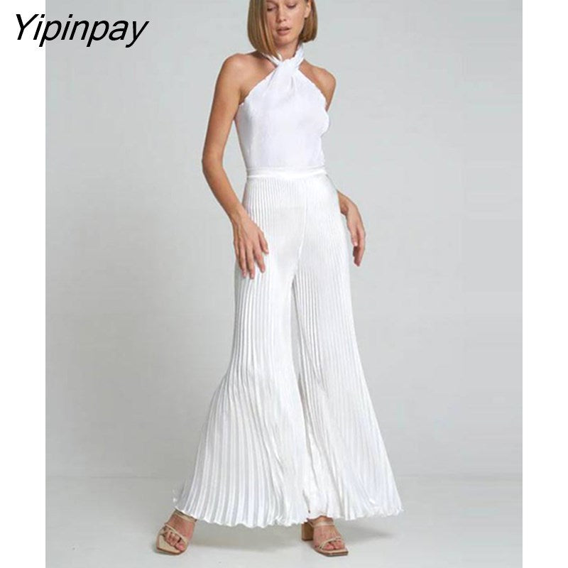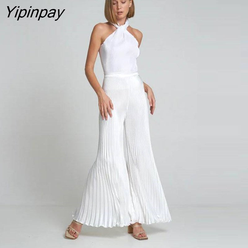 Yipinpay Pleated Halter Backless Tops And Pants 2 Piece Set Women Fashion Solid Wide Leg Trousers Suits 2023 Spring Chic Tracksuits
