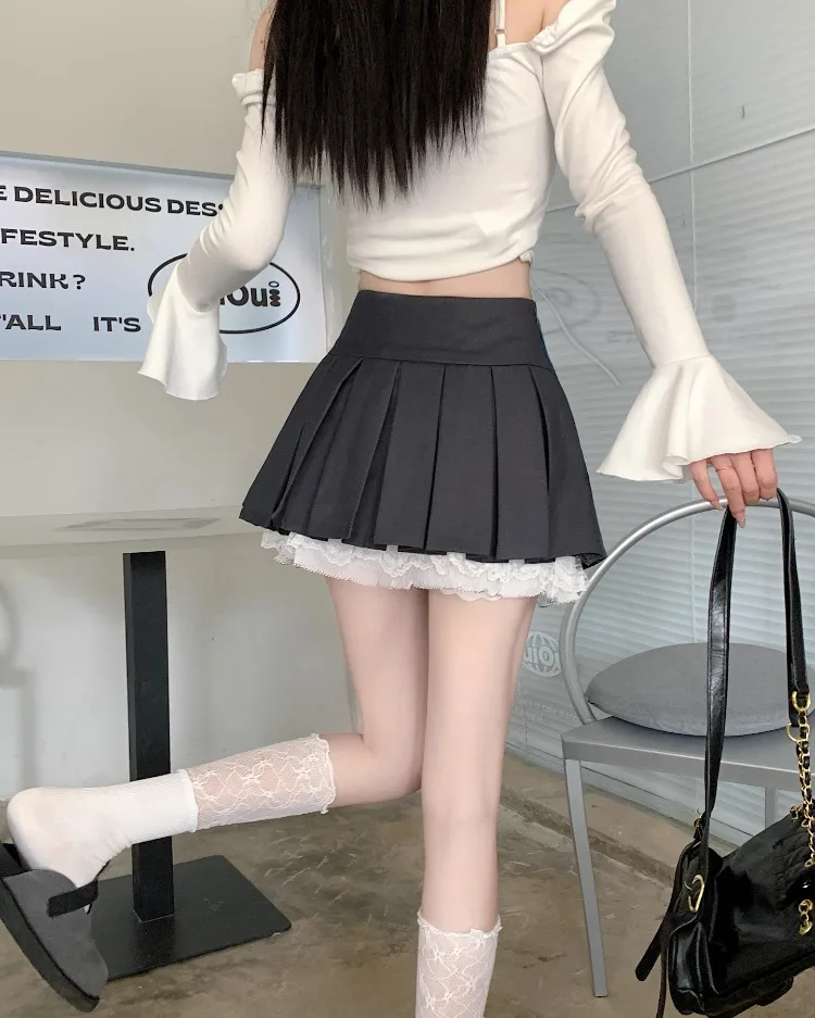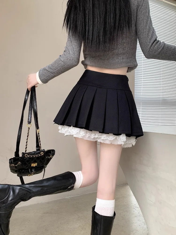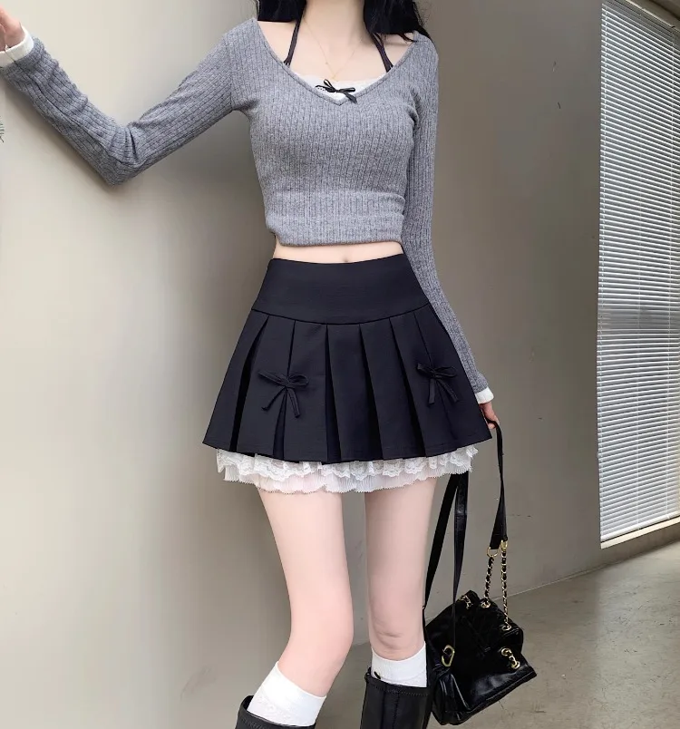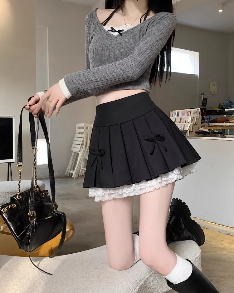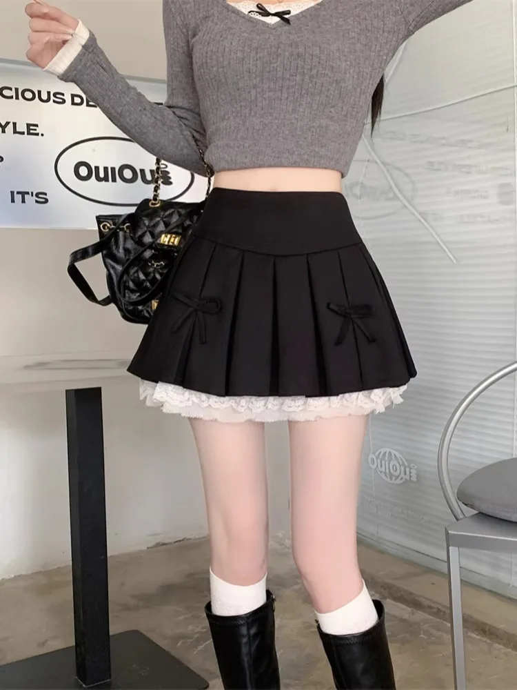 Yipinpay Pleated Skirts Women Sexy Bowknot High Waist Lace Patchwork Spring Fashion Culottes Sweet Firl Mini Skirt Casual