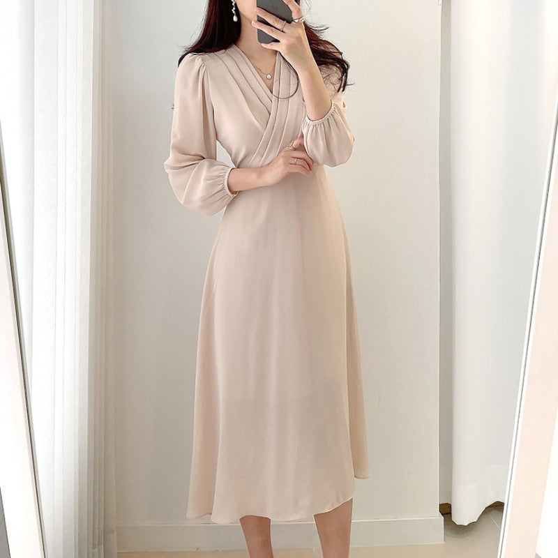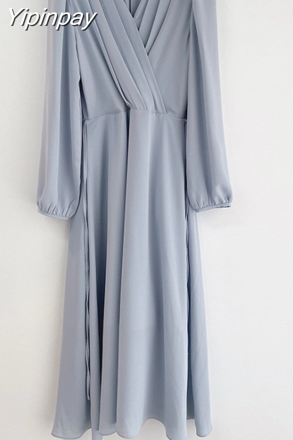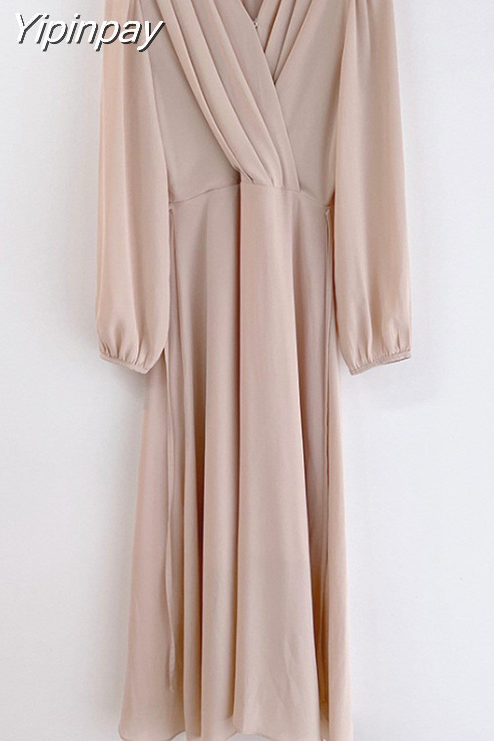Yipinpay pleated V neck long dress Puff sleeve A-line chiffon robe Korean chic retro elegant slim spring 2023 autumn office dresses 0406