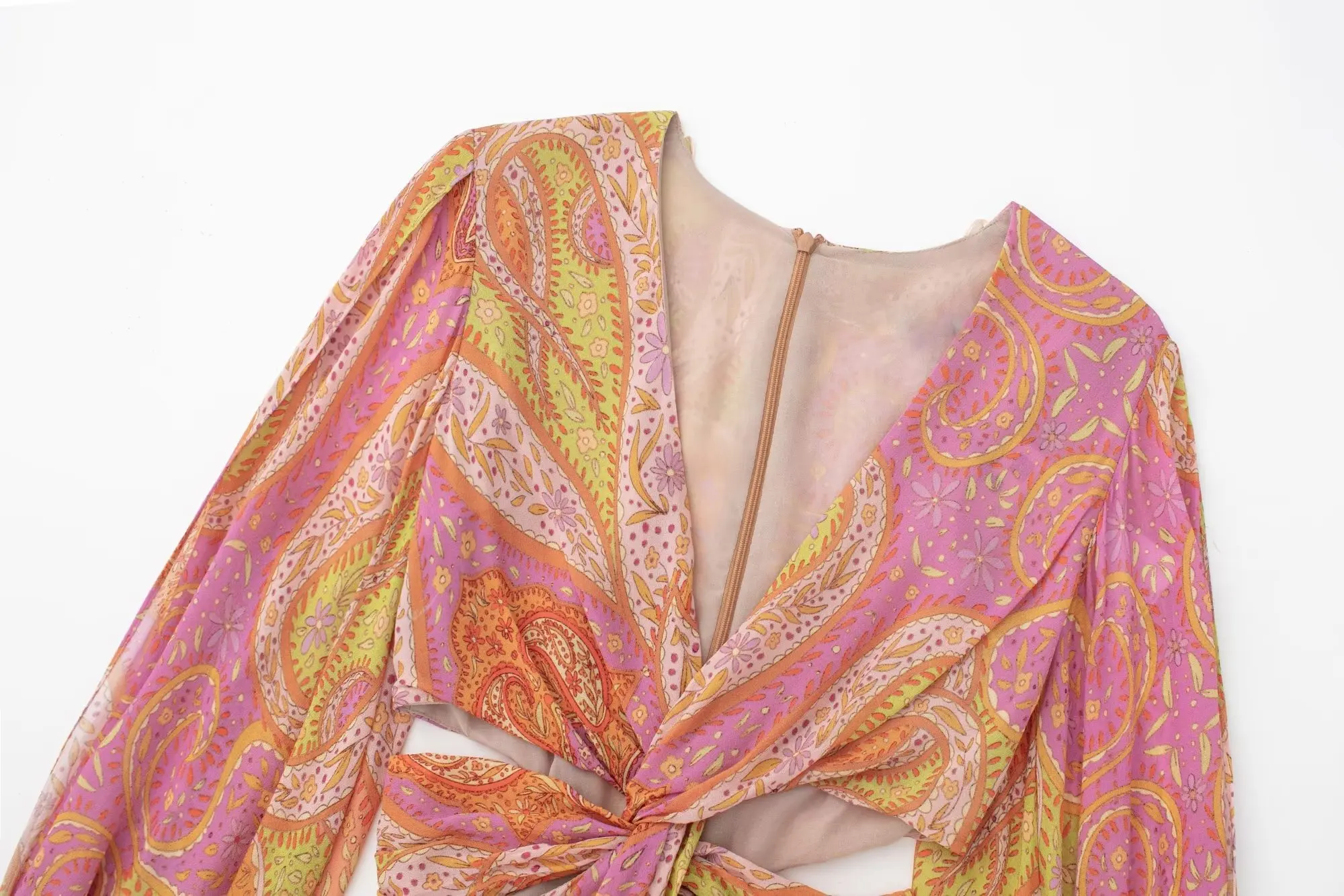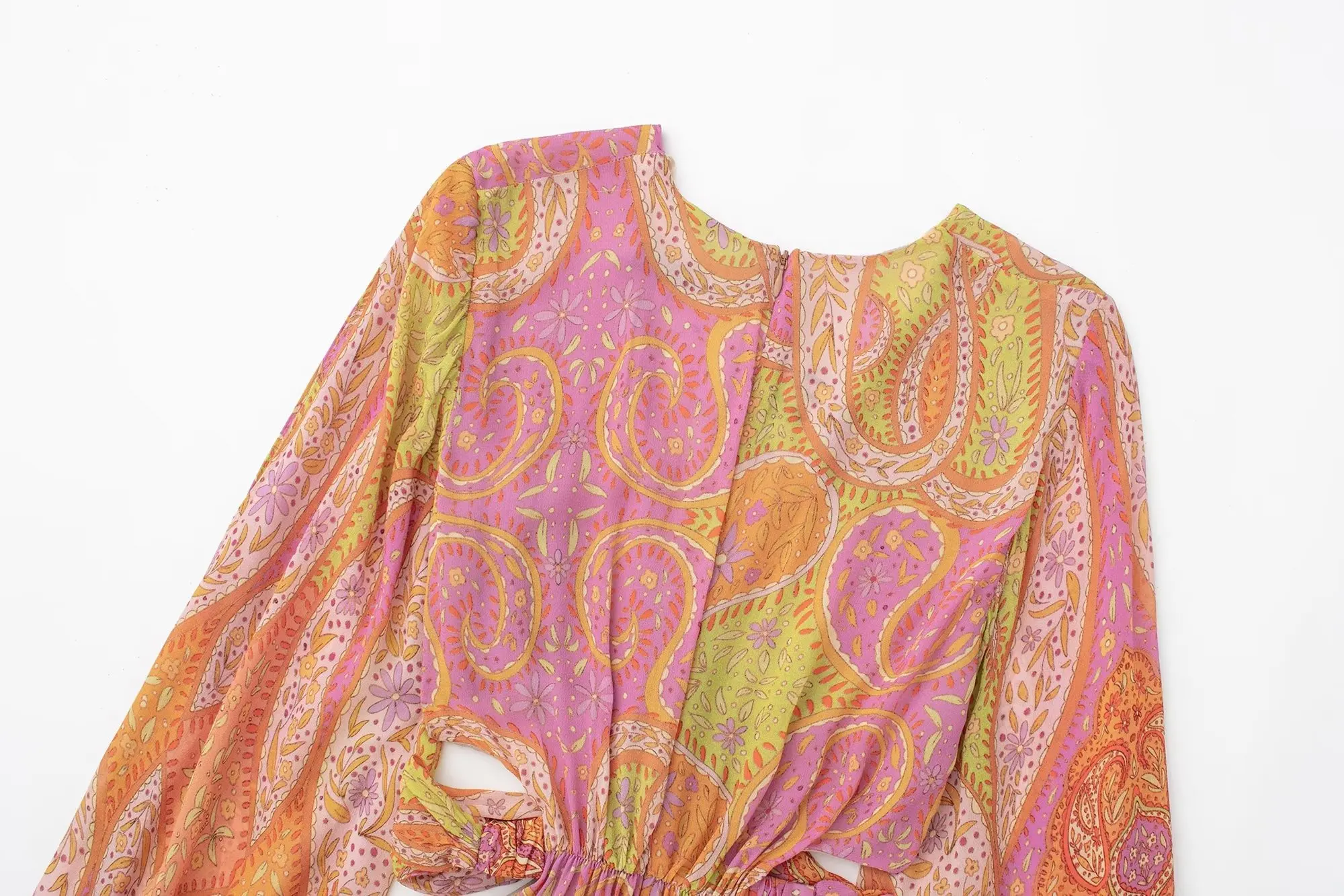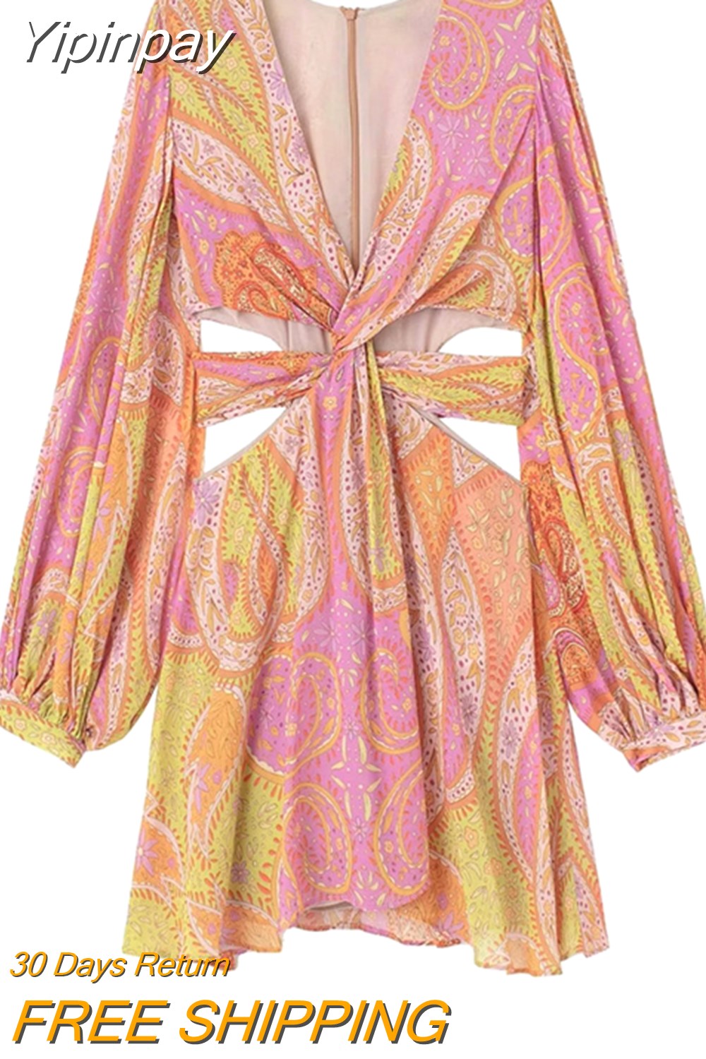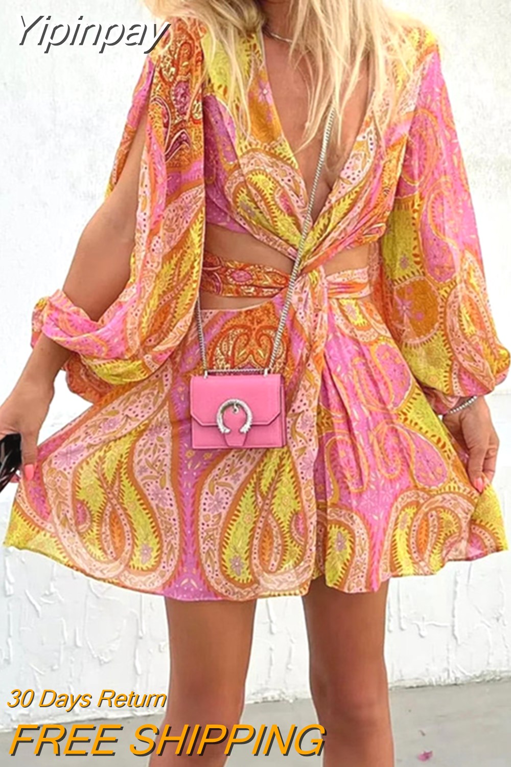 Yipinpay Print Cut Out Dress Woman Short Chiffon Dress Women 2023 Slit Boho Long Puff Sleeve Summer Dresses Beach Sexy Party Dresses
