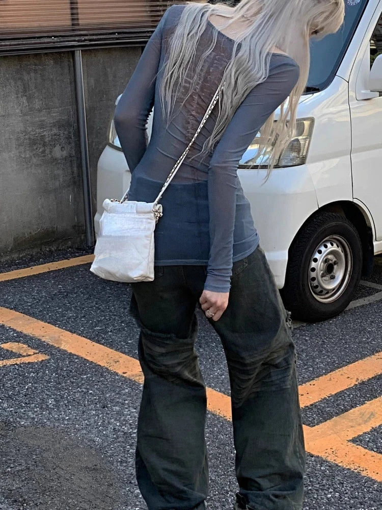 Yipinpay Print Streetwear Tshirts See Through Slash Neck Slim Fit Fairy Grunge Tops Gauze Y2k Aesthetic Harajuku T-shirt Women