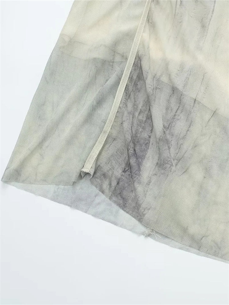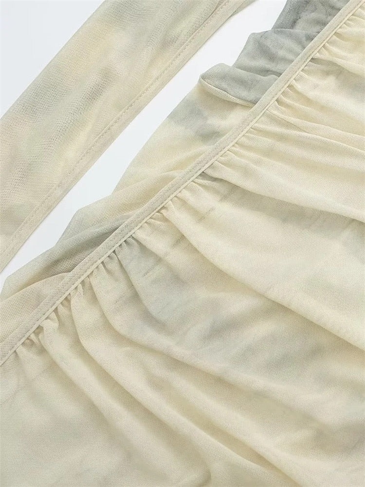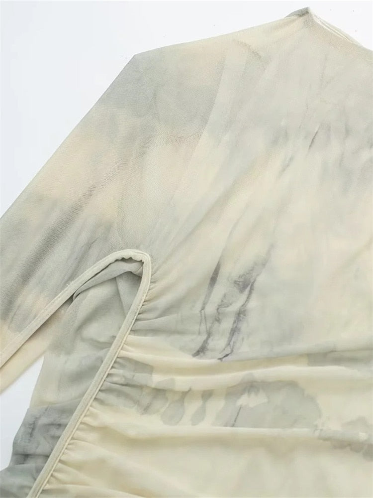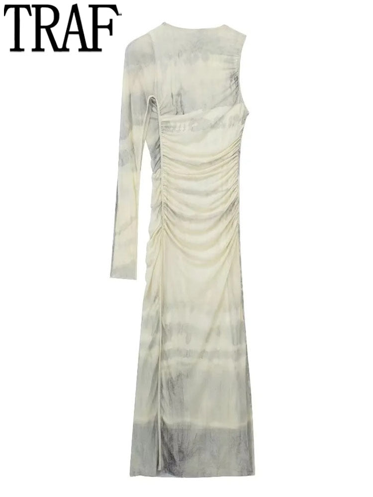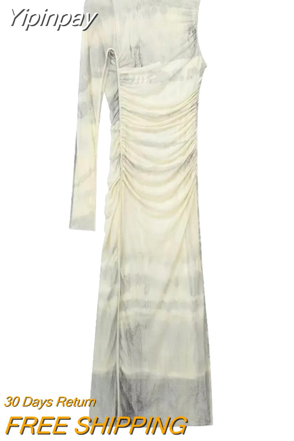 Yipinpay Print Tulle Long Dress Women Off Shoulder Mesh Dress Woman Asymmetric Long Sleeve Midi Dresses Semi Sheer Midi Dresses