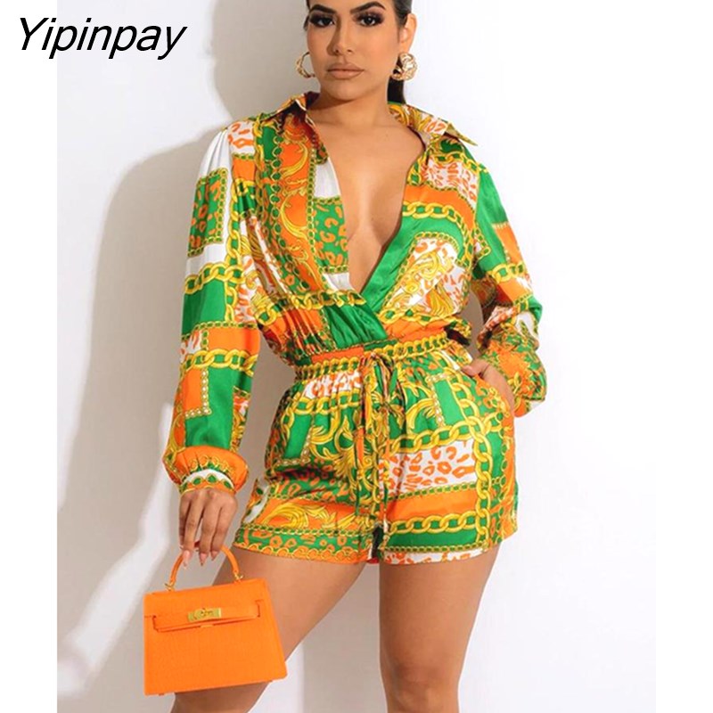 Yipinpay Printed Women Long Sleeve Shirt And Lace Up Shorts Set Female Fashion Lapel Blouse And Short Pants Two Piece Suit 2023