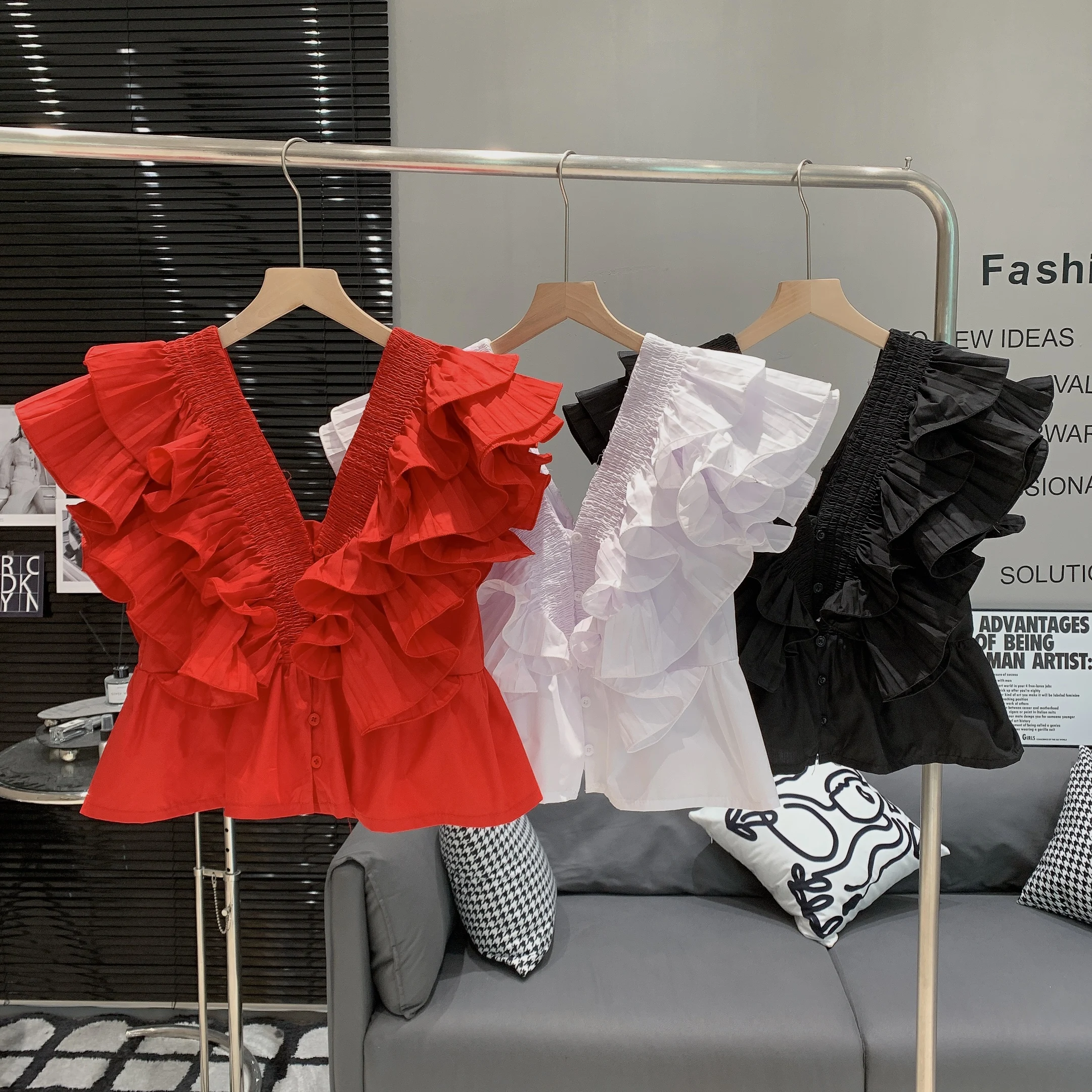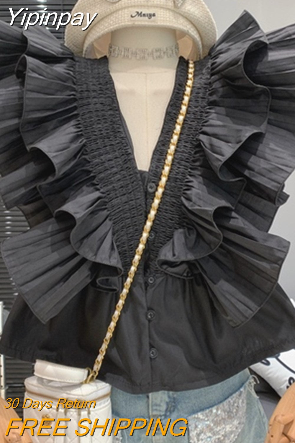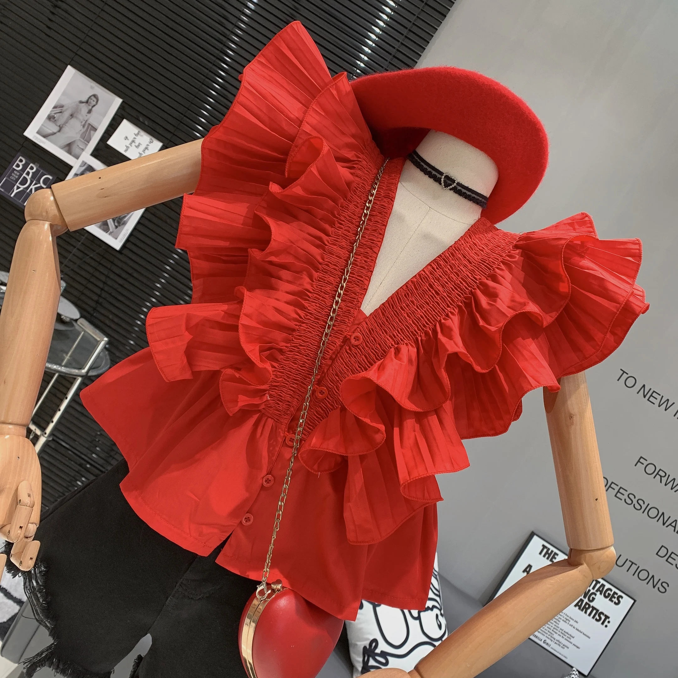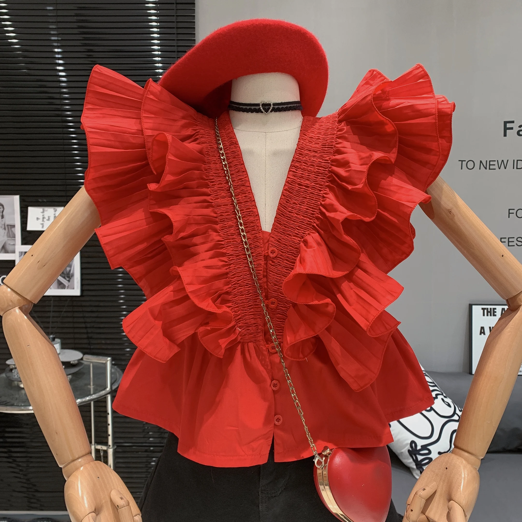 Yipinpay Red V Neck Blouse Layered Ruffled Sleeveless Chiffon Shirt Waist Design Crop Top Femme Shirts for Women Blusas White Flying
