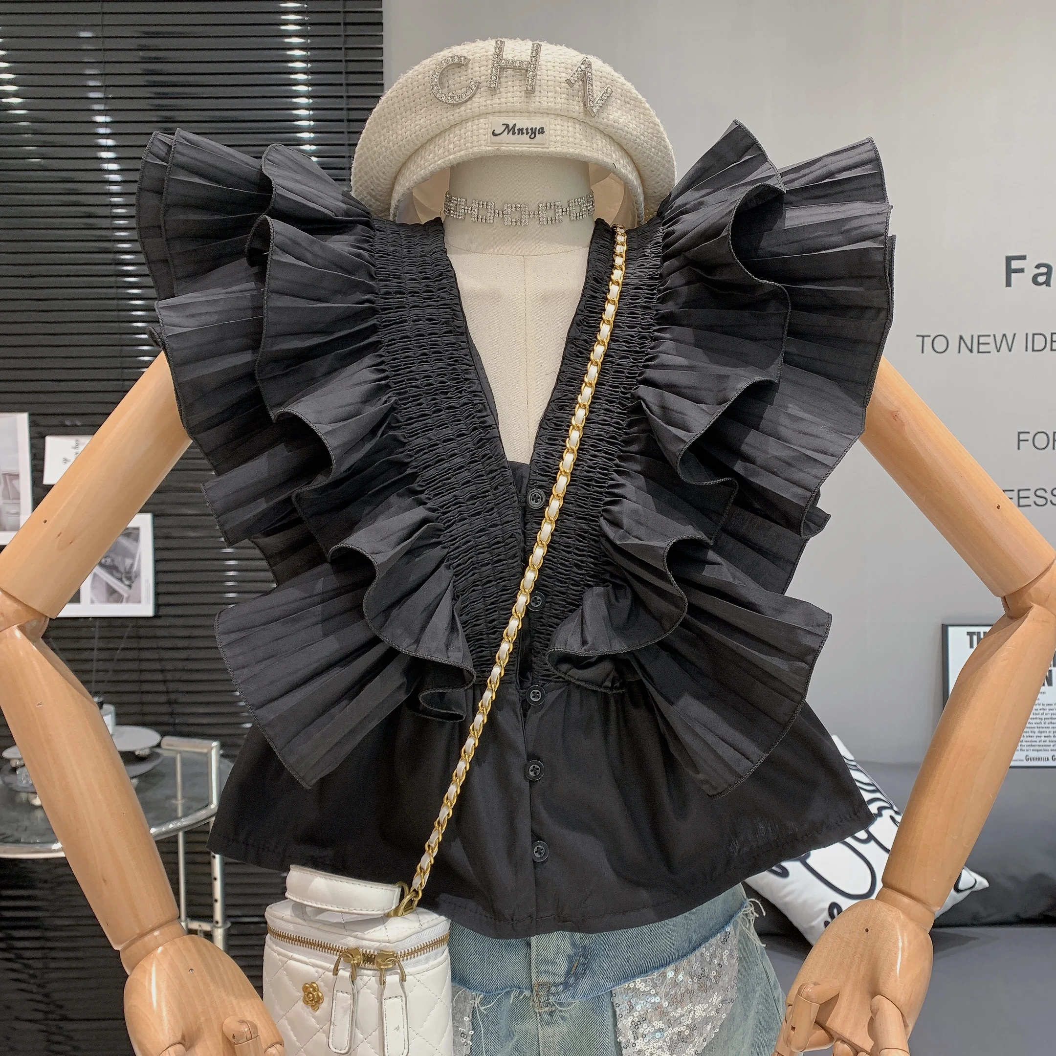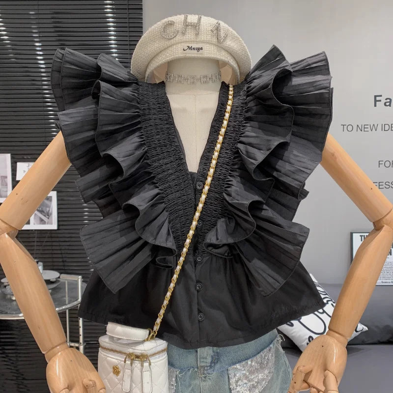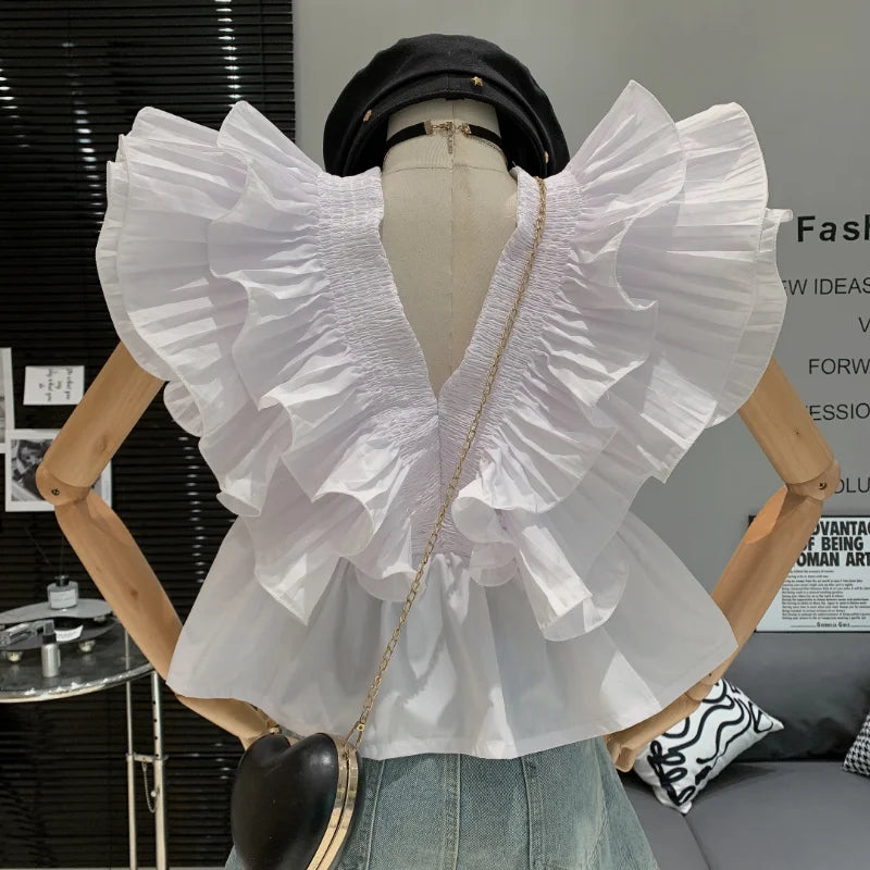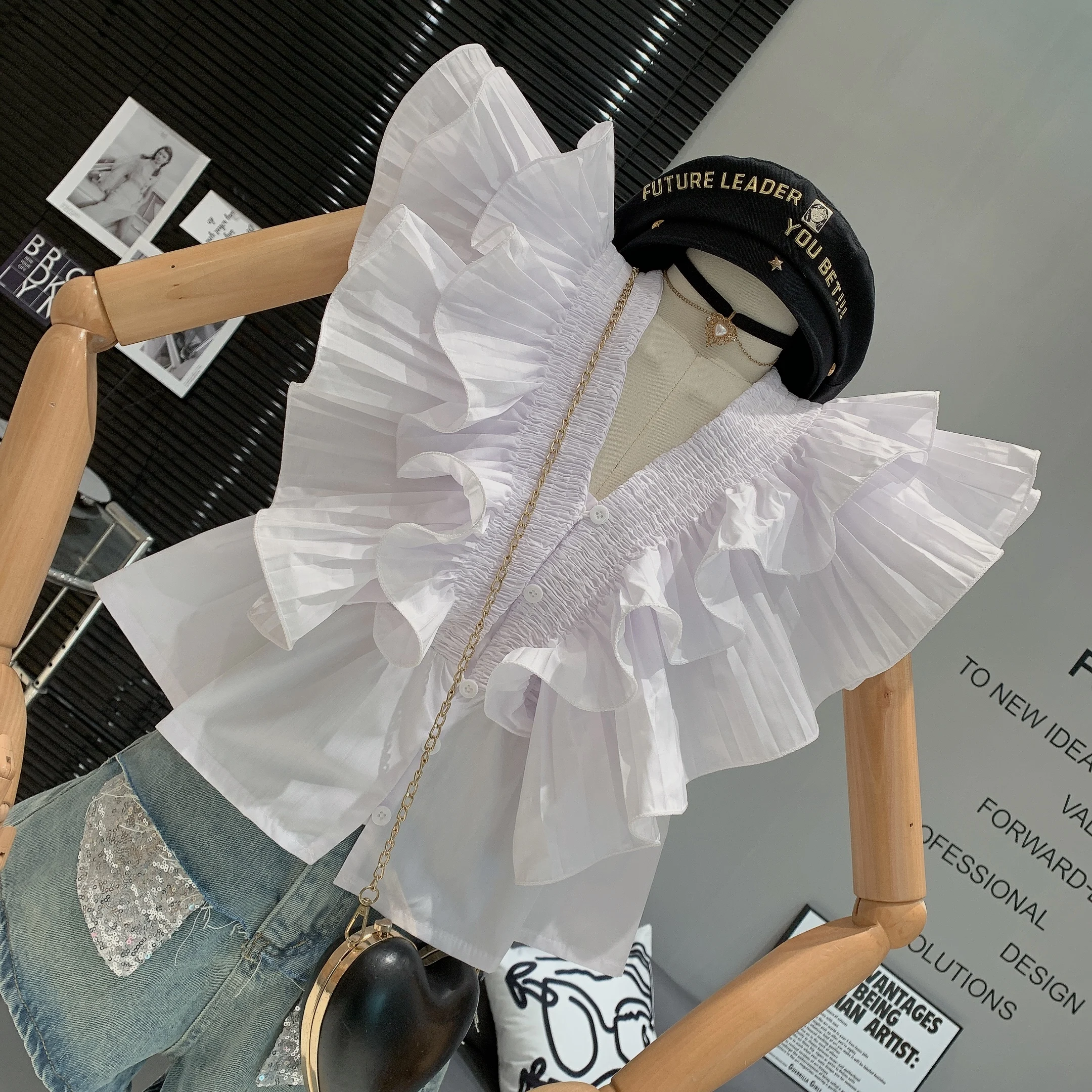 Yipinpay Red V Neck Blouse Layered Ruffled Sleeveless Chiffon Shirt Waist Design Crop Top Femme Shirts for Women Blusas White Flying