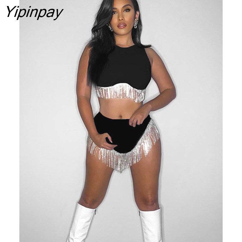 Yipinpay Rhinestones Tassels 2 Piece Set Women Cropped Blouse And Mini Shorts Suits Female Party Club Solid Top Short Pants Outfits