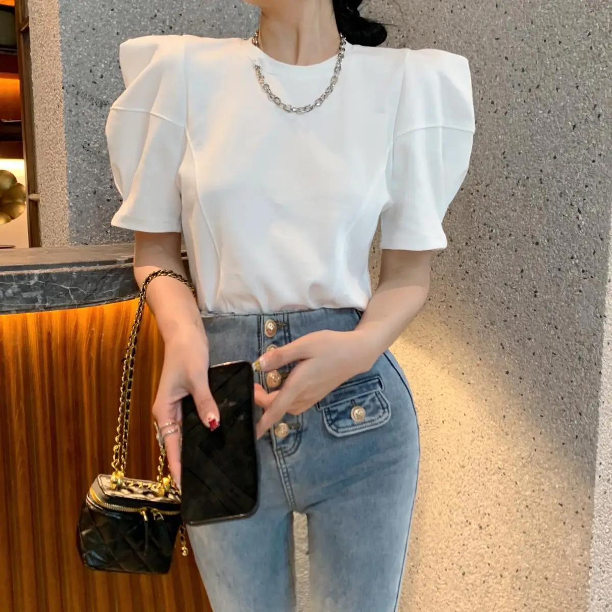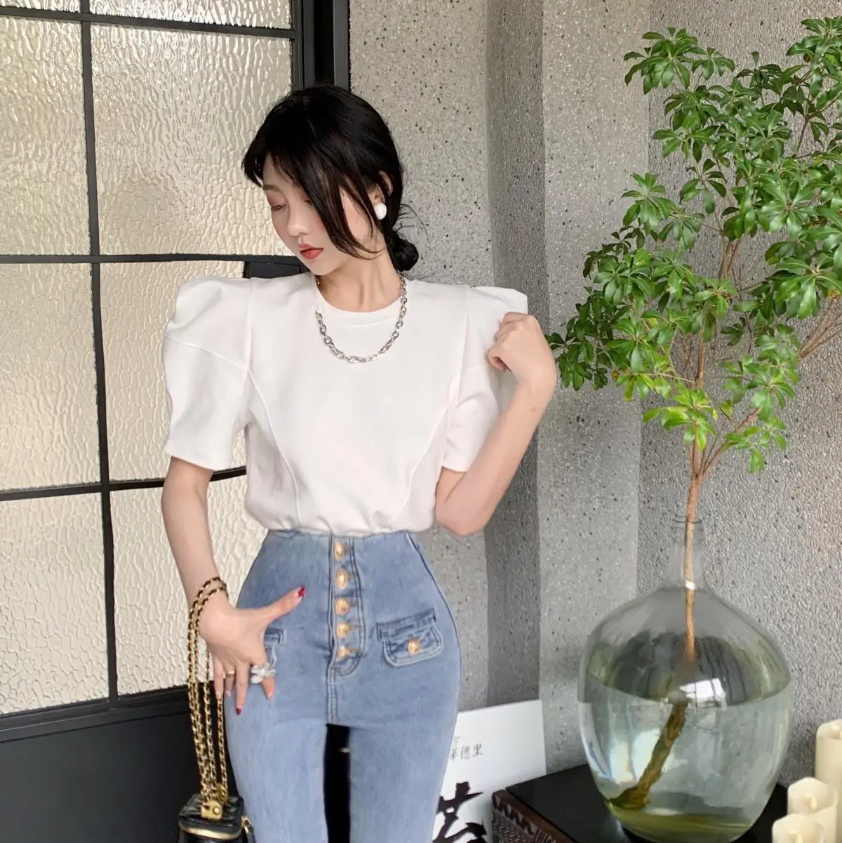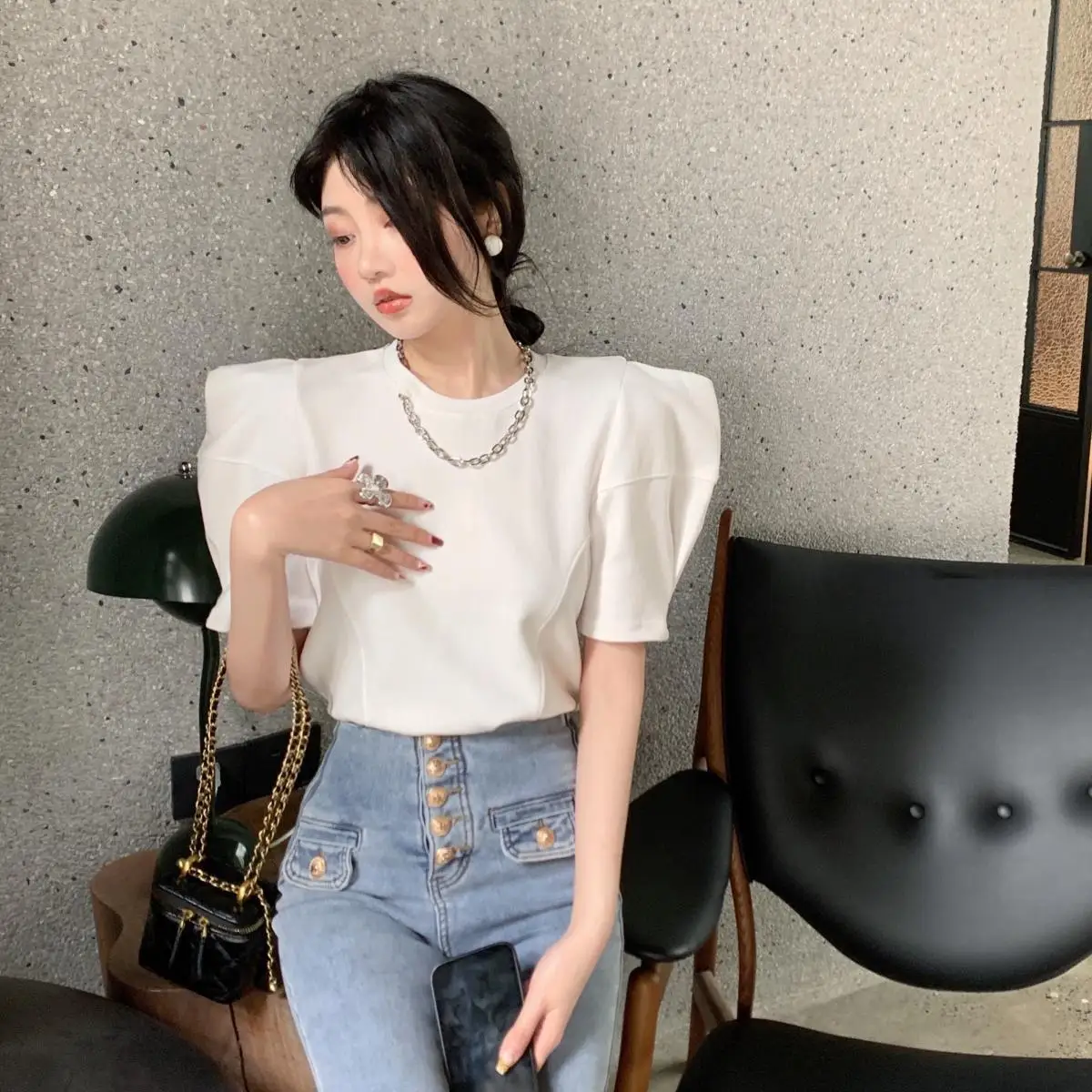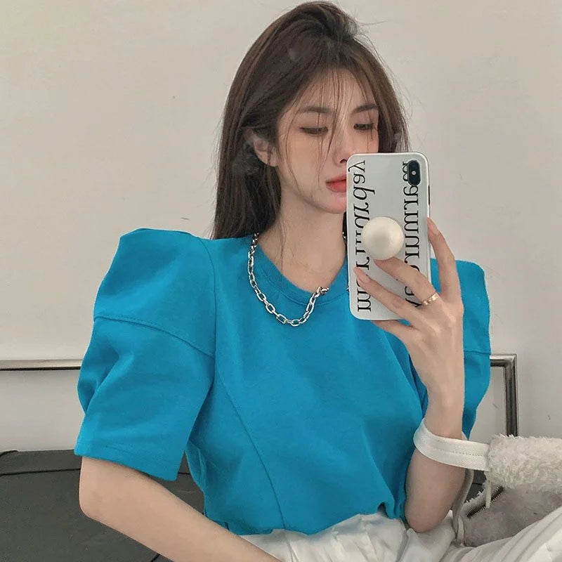Yipinpay Right Shoulder Tee Chain O Neck Puff Short Sleeve Crop Tops Solid Color Blouse White Oversized T Shirt Cotton New Wild