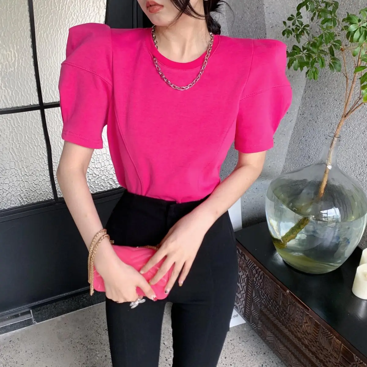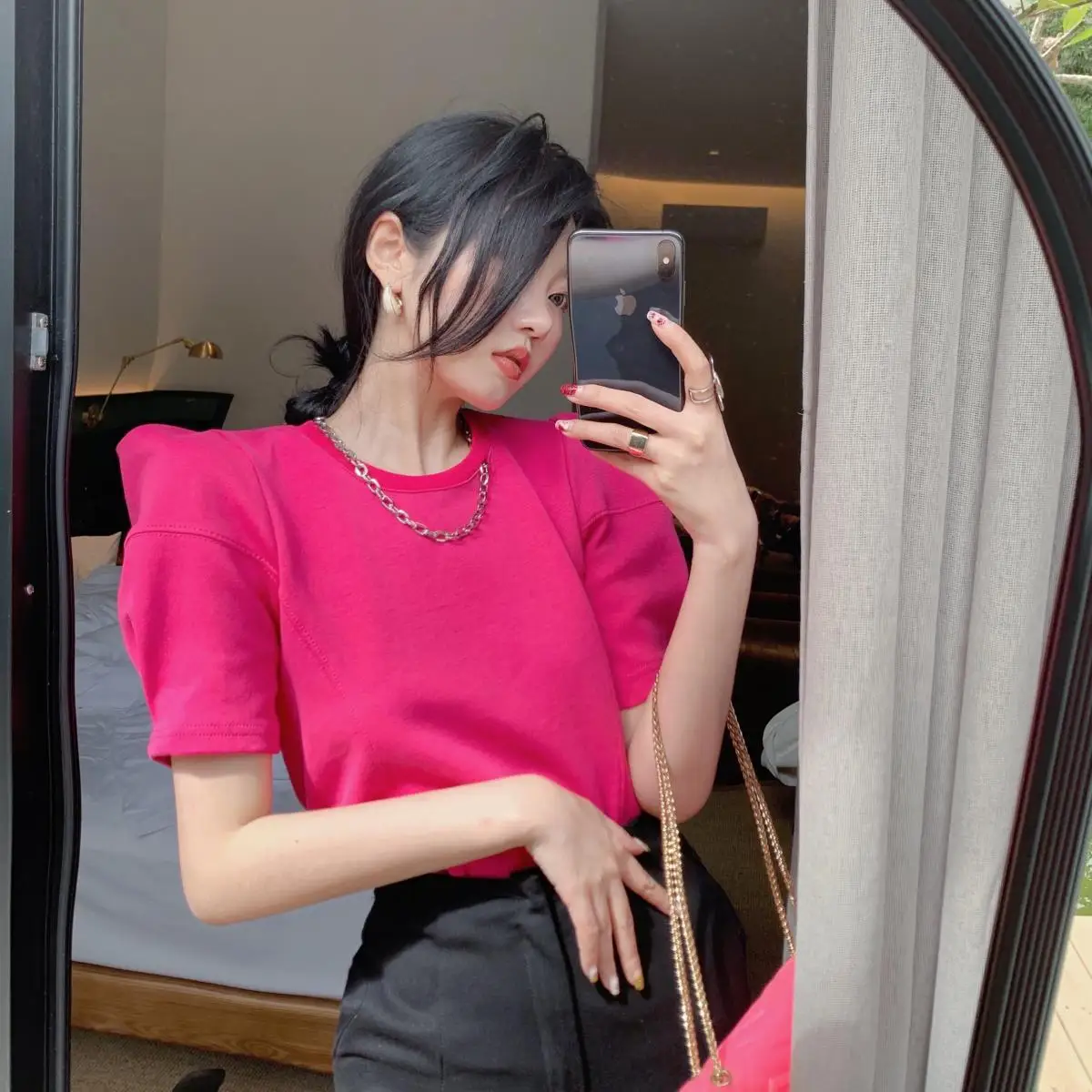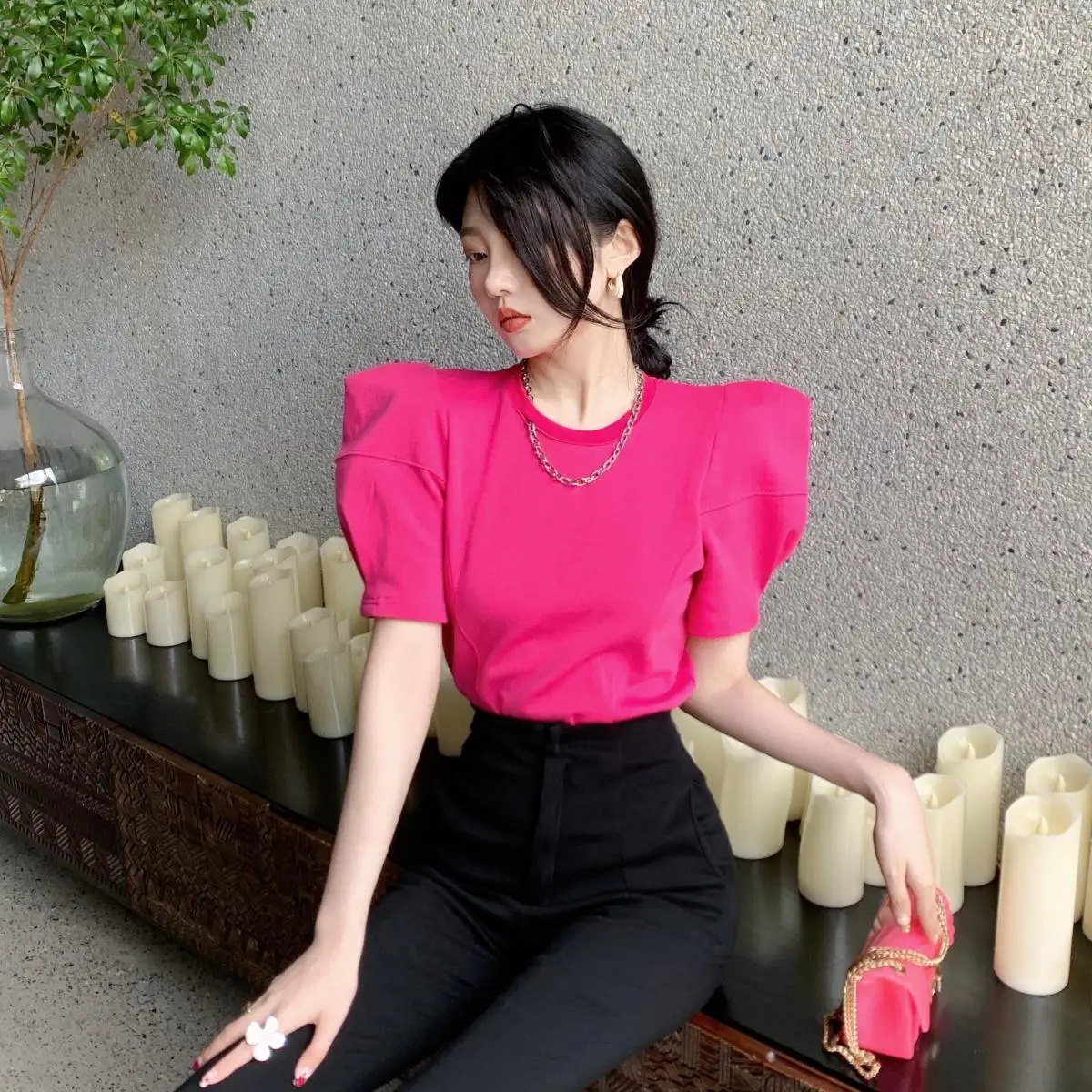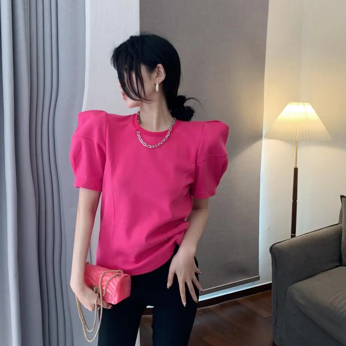 Yipinpay Right Shoulder Tee Chain O Neck Puff Short Sleeve Crop Tops Solid Color Blouse White Oversized T Shirt Cotton New Wild