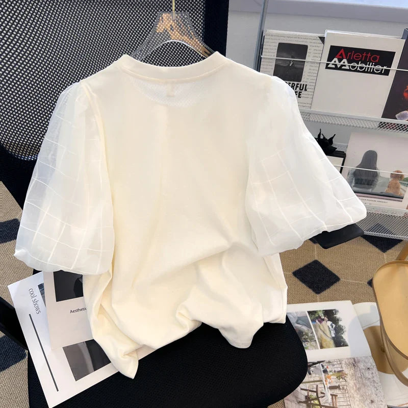 Yipinpay Ropa Mujer Aesthetic Bow Bubble Short Sleeved T-shirts Kawaii Clothes Graphic T Shirts White 3D Plaid Tshirt Y2k Tops