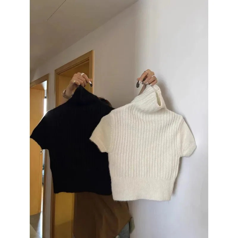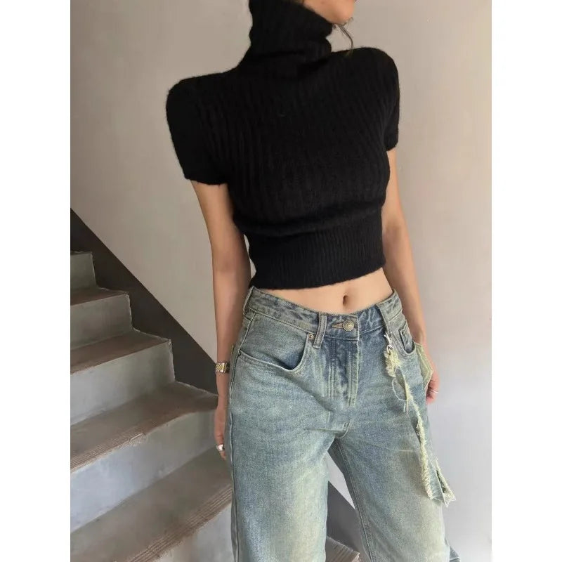 Yipinpay Ropa Mujer Knitted Cropped Pullovers Women Turtleneck Short Sleeve Tunic Jumper Pull Femme Fashion Casual Y2k Sweater Top