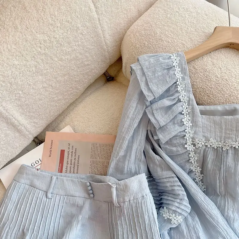 Yipinpay Ruffle Chiffon Shirt Women Loose Sweet Wide Leg Pants Short Shorts Sets Korean Blouse Spring New Tops 2 Piece Sets Ruched