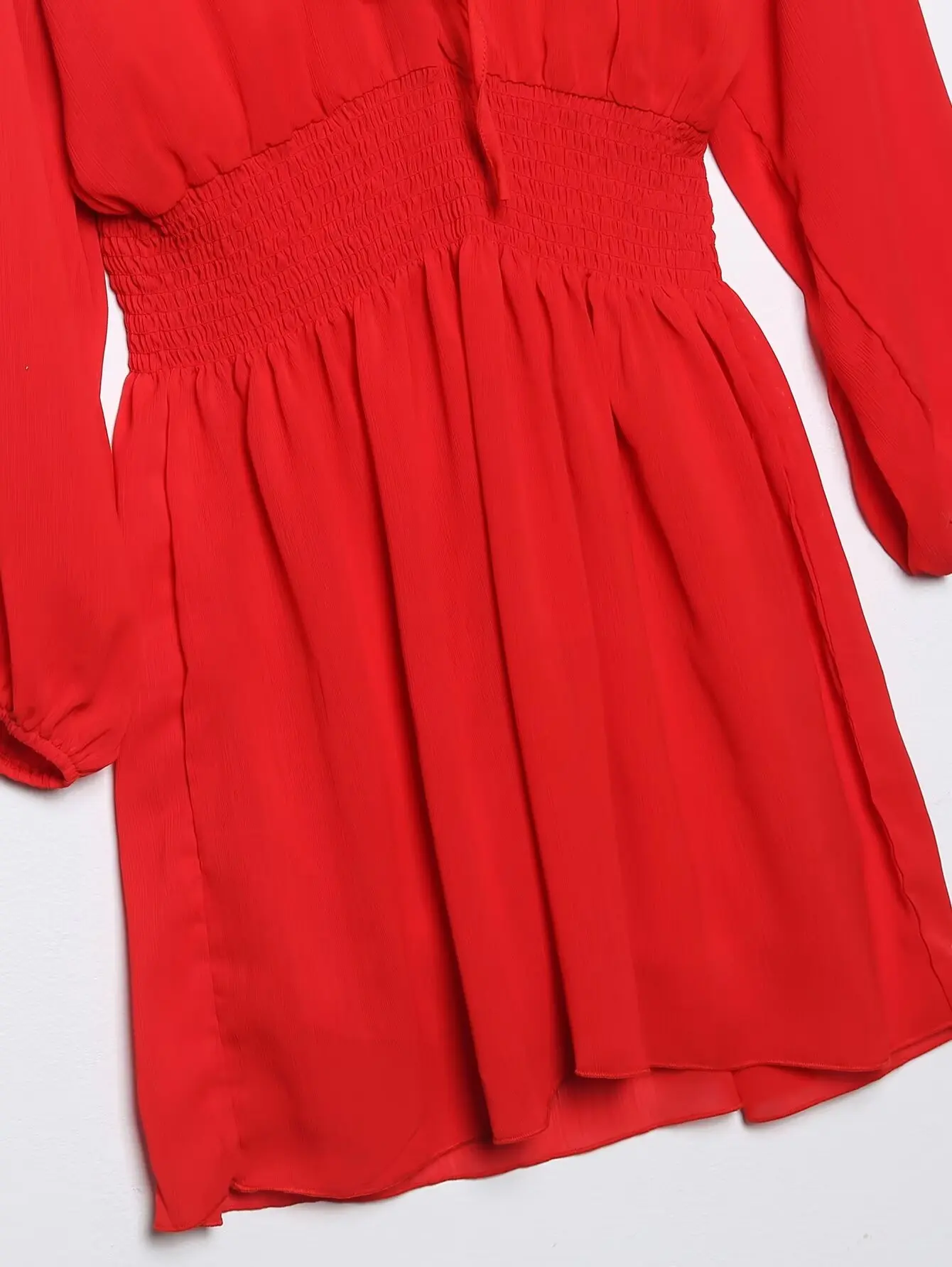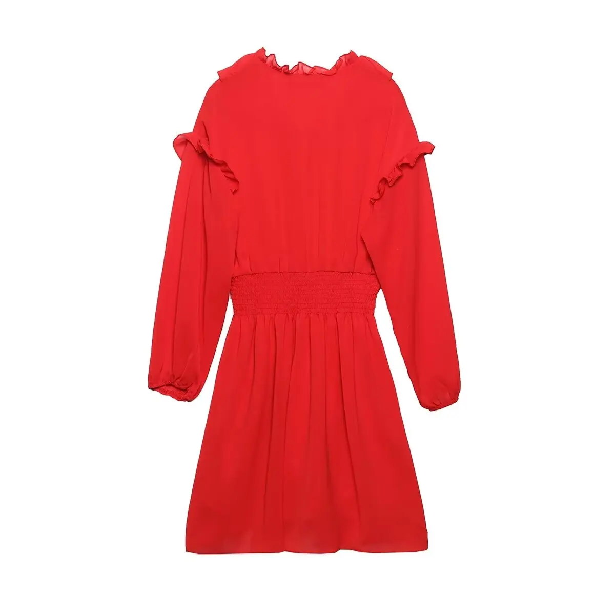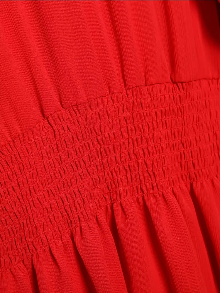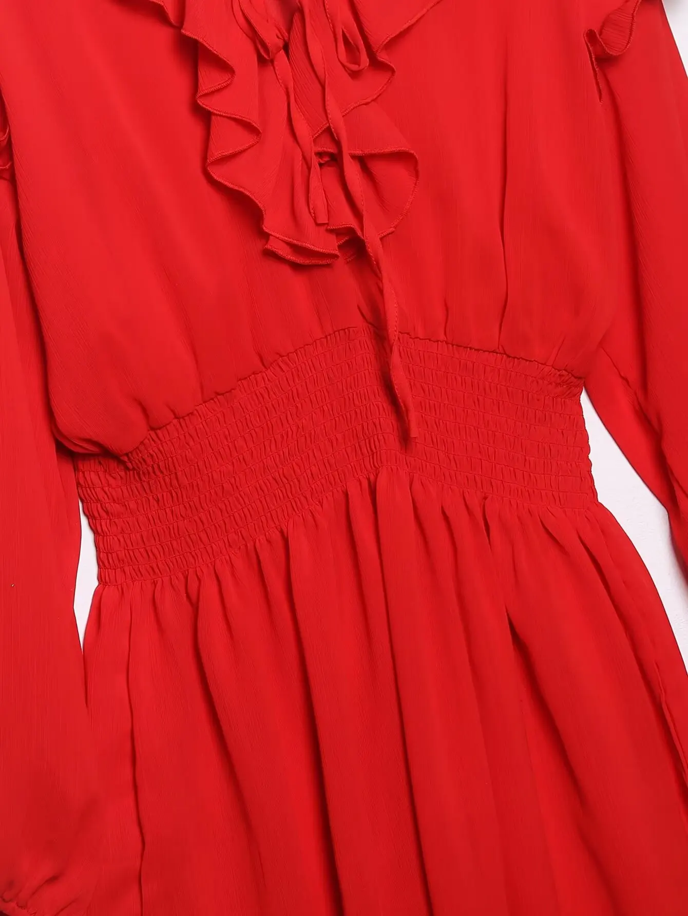 Yipinpay Ruffled Red Dress For Women 2024 Lace Up V Neck Long Sleeve Robe Vintage Elastic Waist Party Mini Dresses