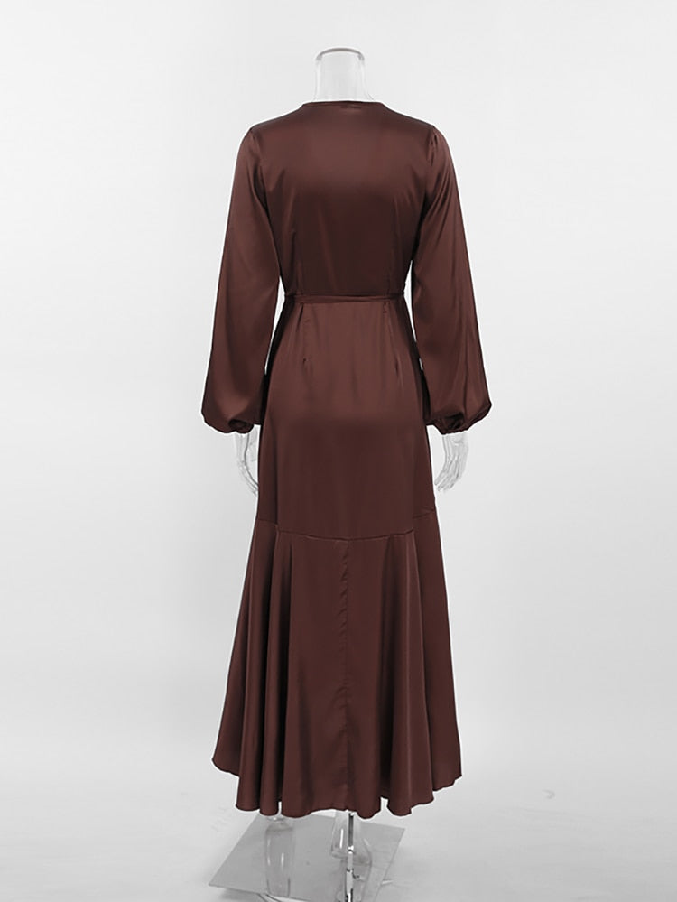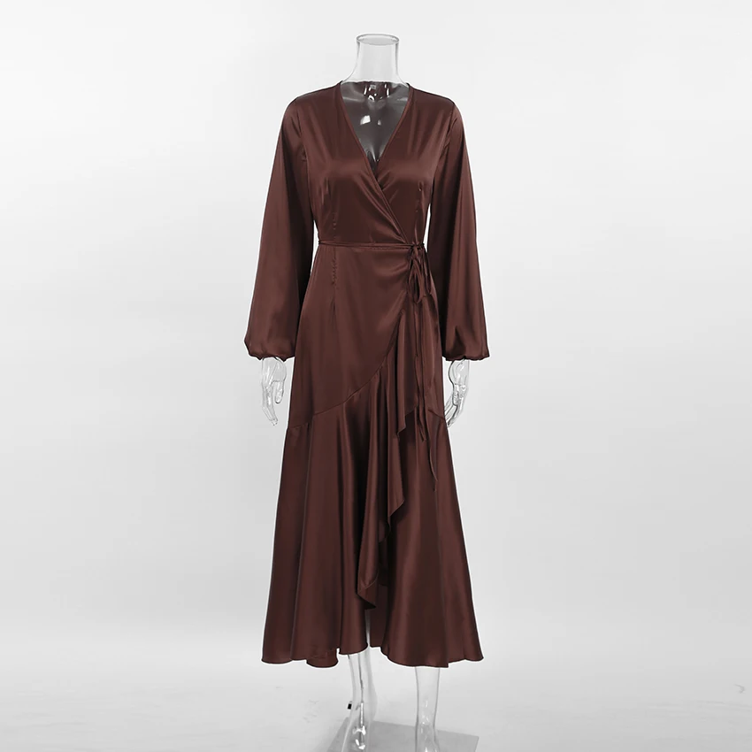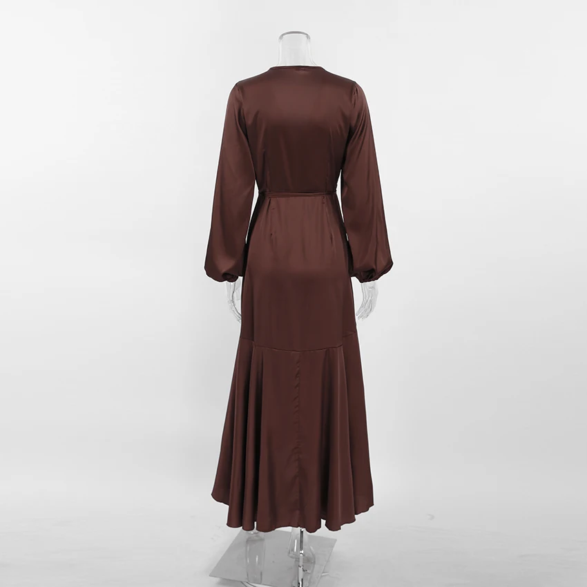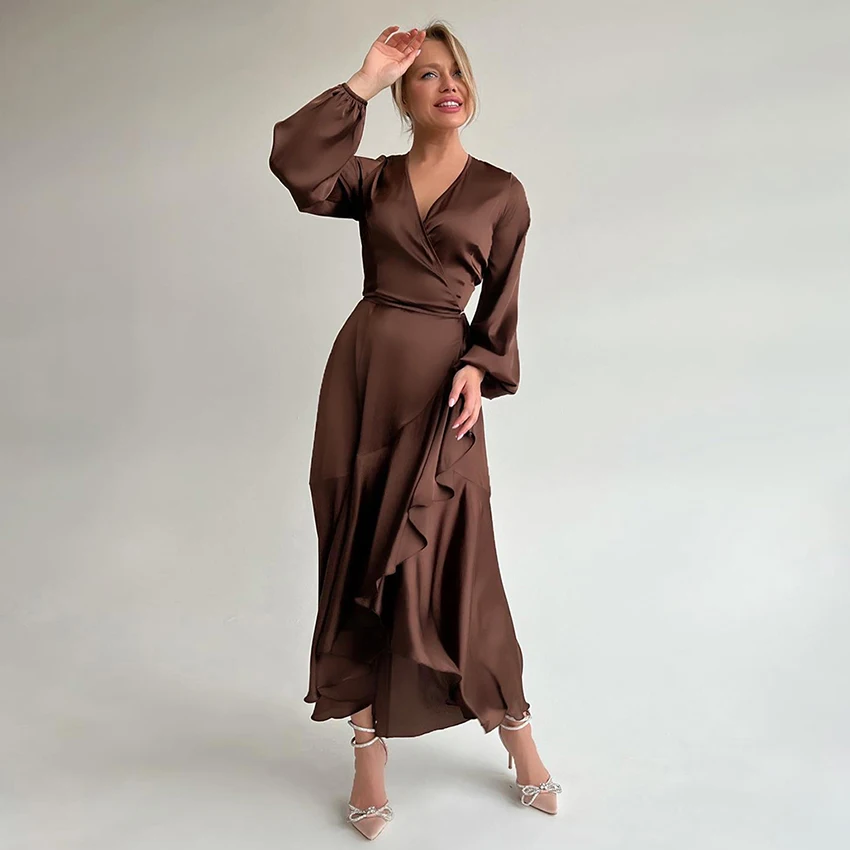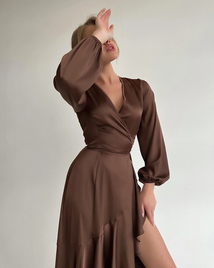 Yipinpay Satin Party Elegant Dress Women Silky Wrap French Mermaid Dress Ruffled Evening Lantern Sleeve Prom Dresses Flowing