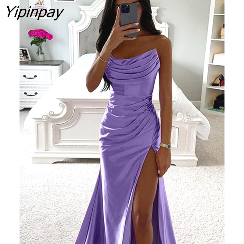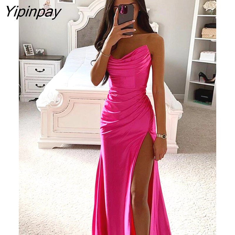 Yipinpay Satin Strapless Pleated Dress For Women 2023 Summer Elegant Festival Evening Lady Dress Sleeveless Side High Split Dress