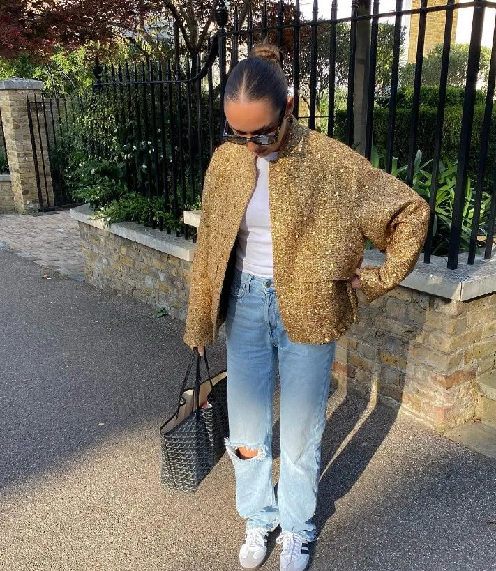 Yipinpay Sequin Gold Bomber Jacket For Women Loose Stand Collar Long Sleeve Coat 2023 Autumn Winter Street Female Outwear Jackets