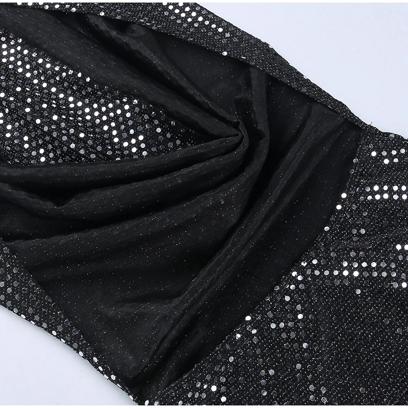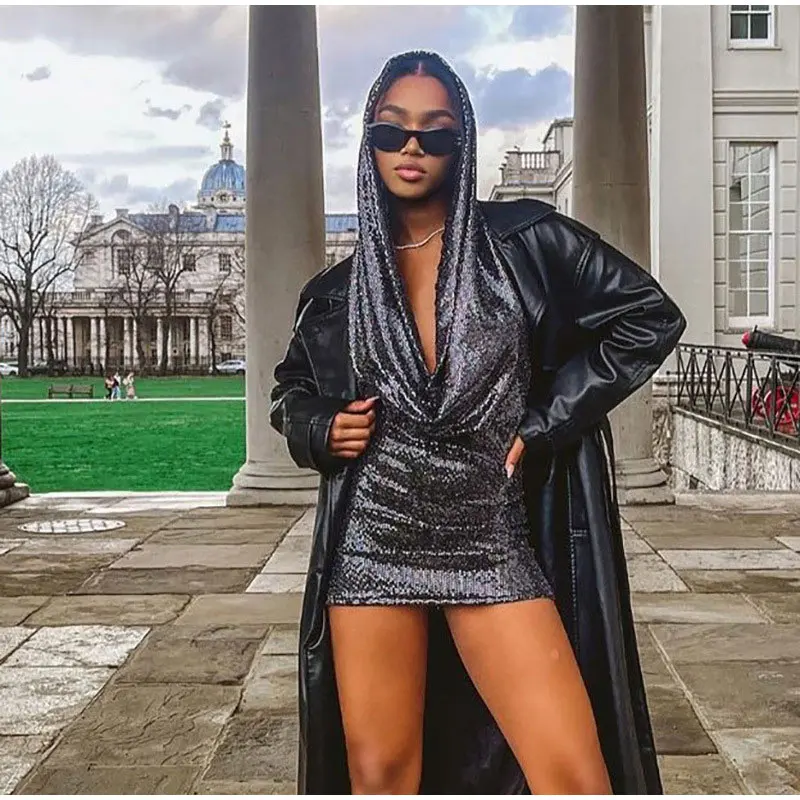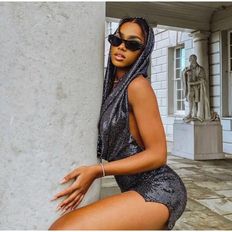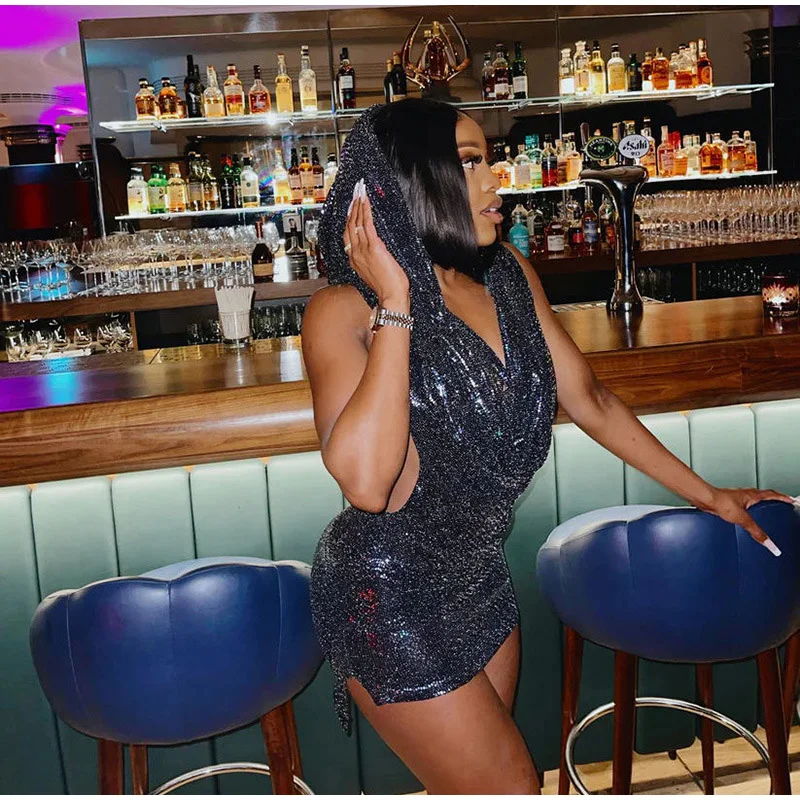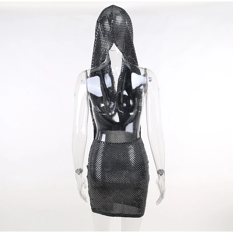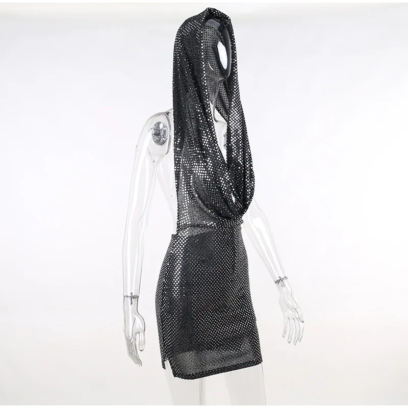 Yipinpay Sequin Hooded Backless Halter Dress For Women Fashion Solid Sleeveless Slit Mini Dresses 2023 High Street Swing Collar Robe