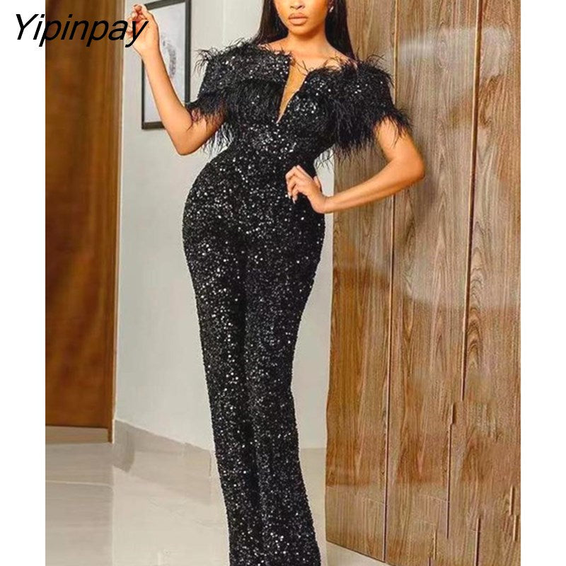 Yipinpay Sequins Feather Women Jumpsuits Chic Off Shoulder Deep V Neck Party Club Rompers Lady Vintage Slim Shiny Evening Overalls