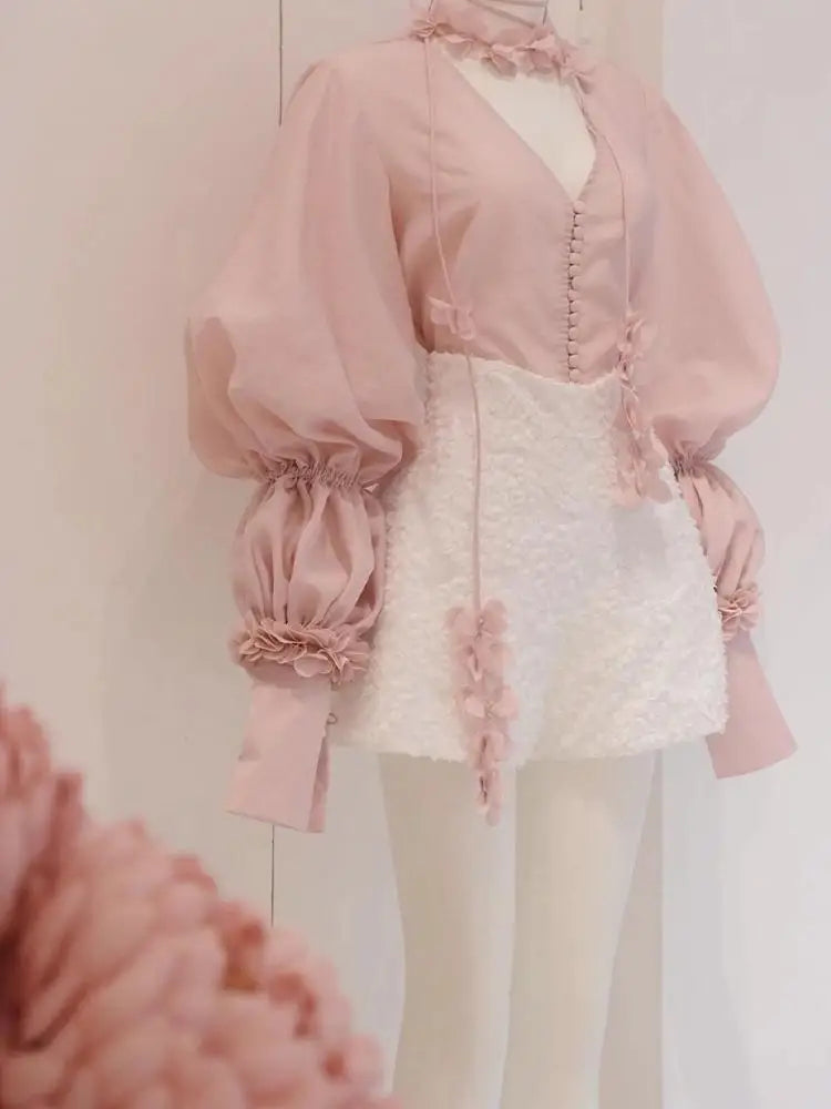Yipinpay Sets Korean Lace Up Pink Chiffon Shirt Spring Summer 2 Piece Outfit Sets Flower Top Tassel Shorts Wide Leg Short Pants